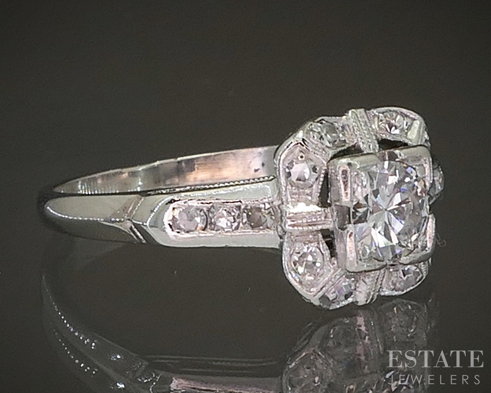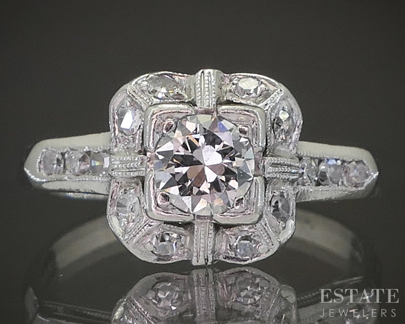 Additional Info: A true testament to the elegance and craftsmanship of the 1920s, this Art Deco Era Diamond engagement ring captures the geometric beauty and bold sophistication that defined the Art Deco movement. Handcrafted in enduring platinum, the ring features a dazzling center Old European Cut Diamond framed by intricate milgrain detailing, and Diamond-accented shoulders that reflect the symmetrical, architectural lines of the period.