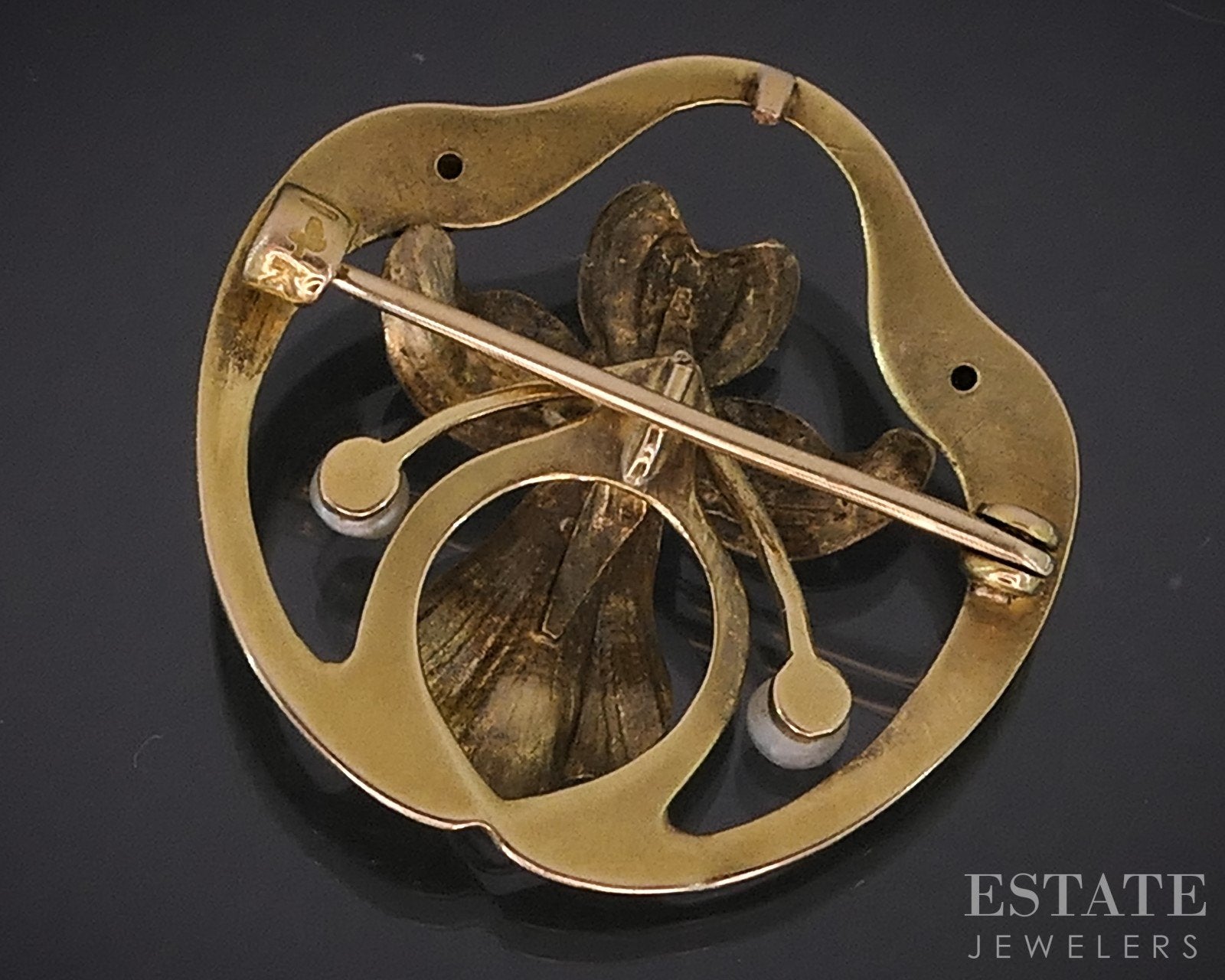 Antique Art Nouveau 14k Yellow Gold Enameled Flower Pearl Pin Brooch 2.7g i18949
