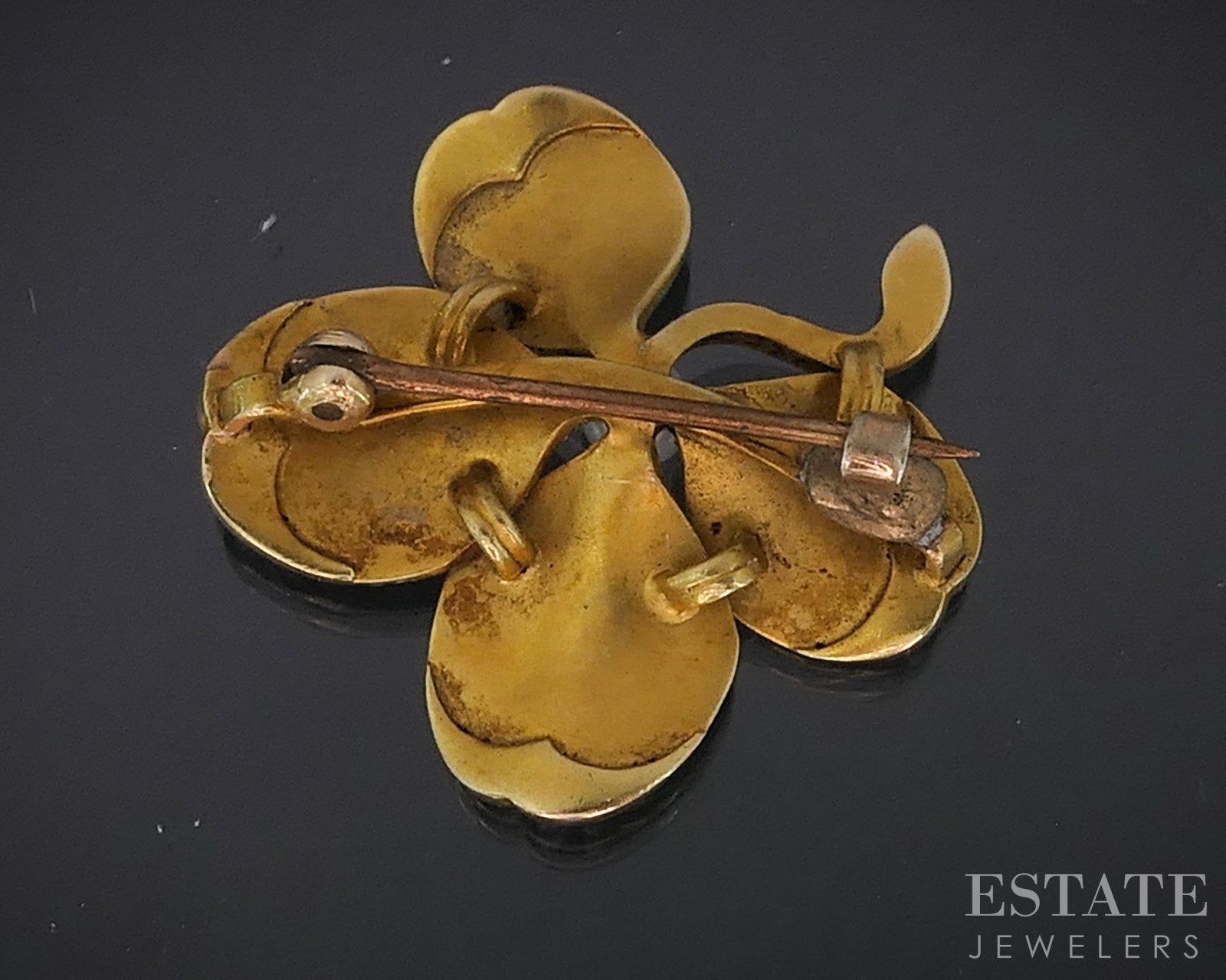 Additional Info: Charming brooch from the early 1930's! 4-leaf clover shape with immaculate green enameling. Seed Pearls accent the outer edge and a larger Pearl set in the center. Please note, the pin itself is base metal as it was replaced at one time but the entire clover itself is solid 18k gold.
