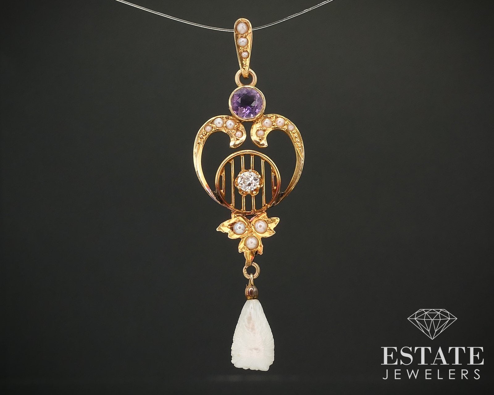 Antique Edwardian 14k Yellow Gold Diamond & Amethyst Lavalier Pendant i16215
