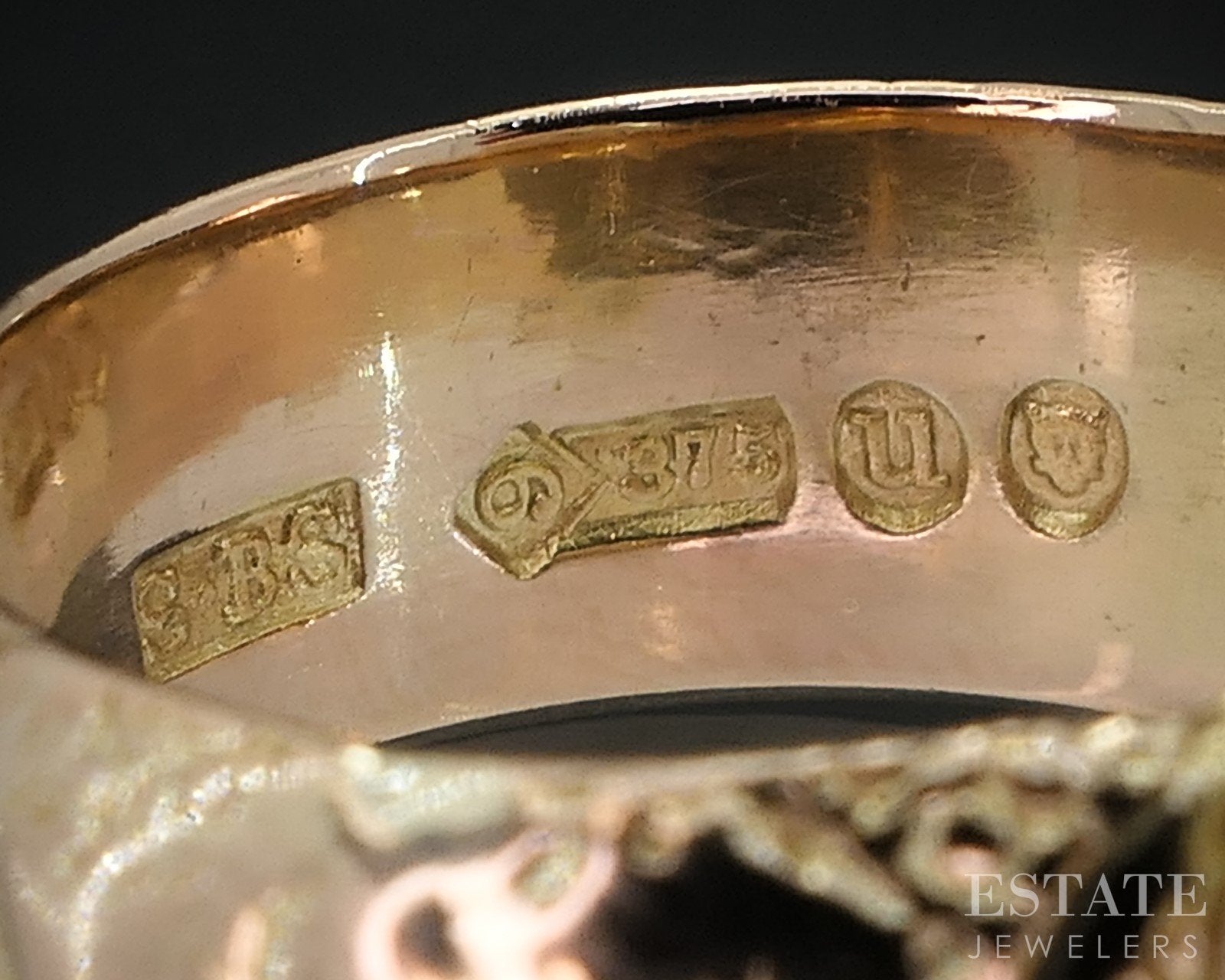 Additional Info: Lovely ladies wide gold band with a engraved designs around it and a belt in the middle. 10mm tall face. Hallmarks date the ring to 1915 and made in London!