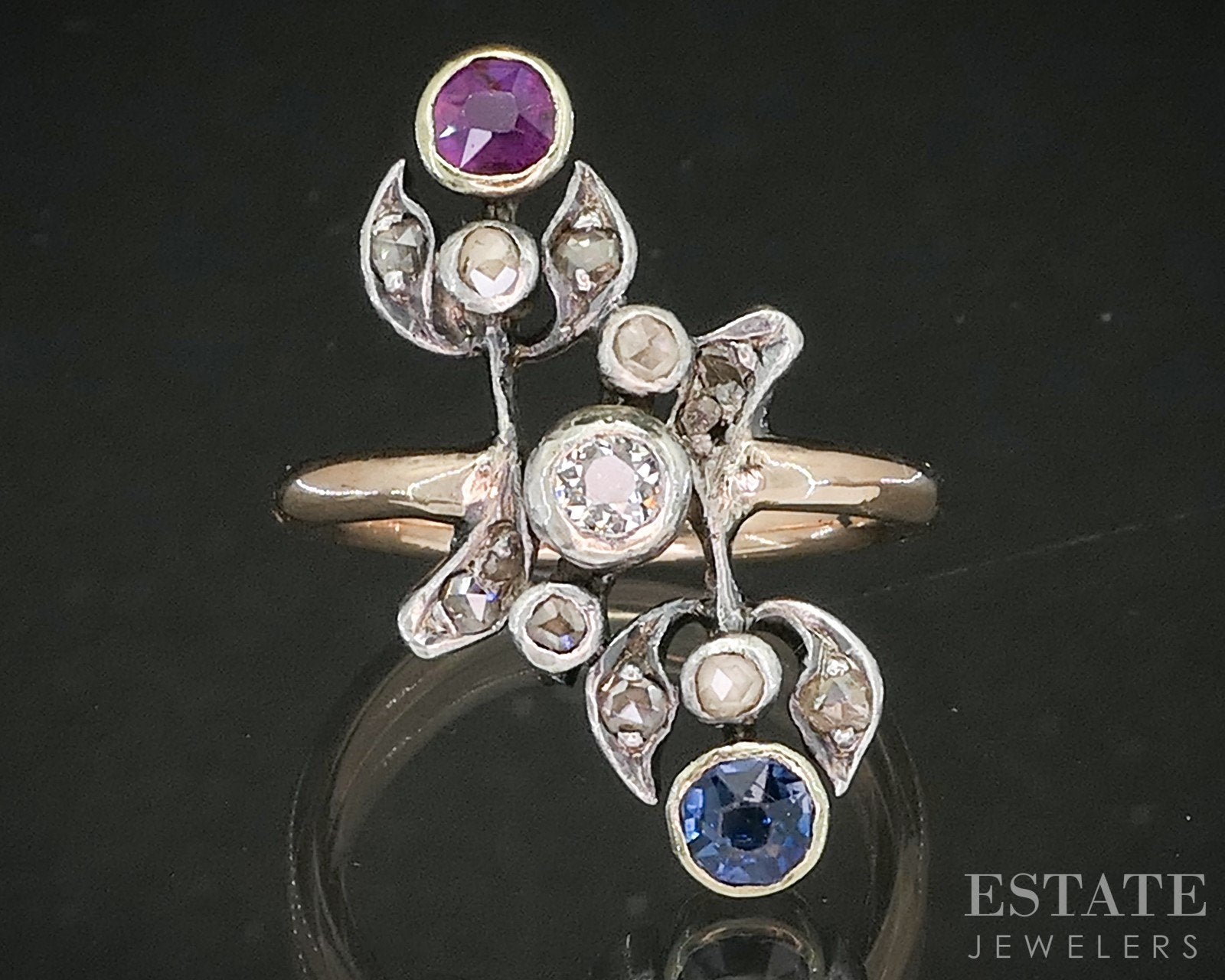 Antique Georgian 12k & Sterling Rose Cut Diamond Ruby Sapphire Ring 5g p19000