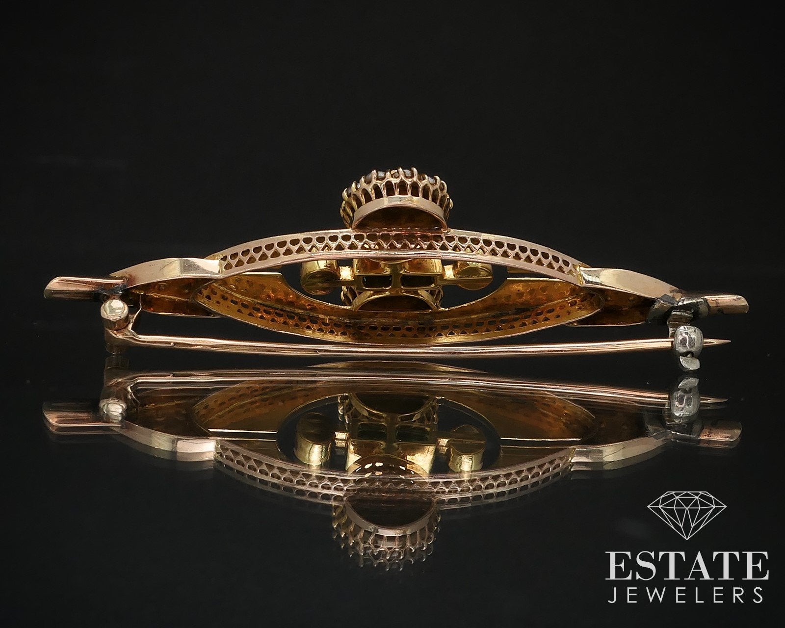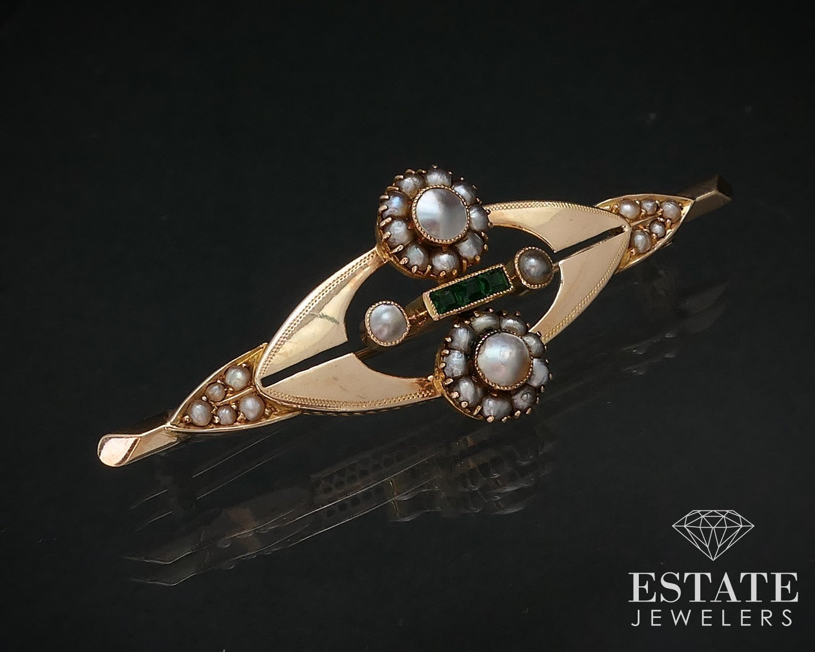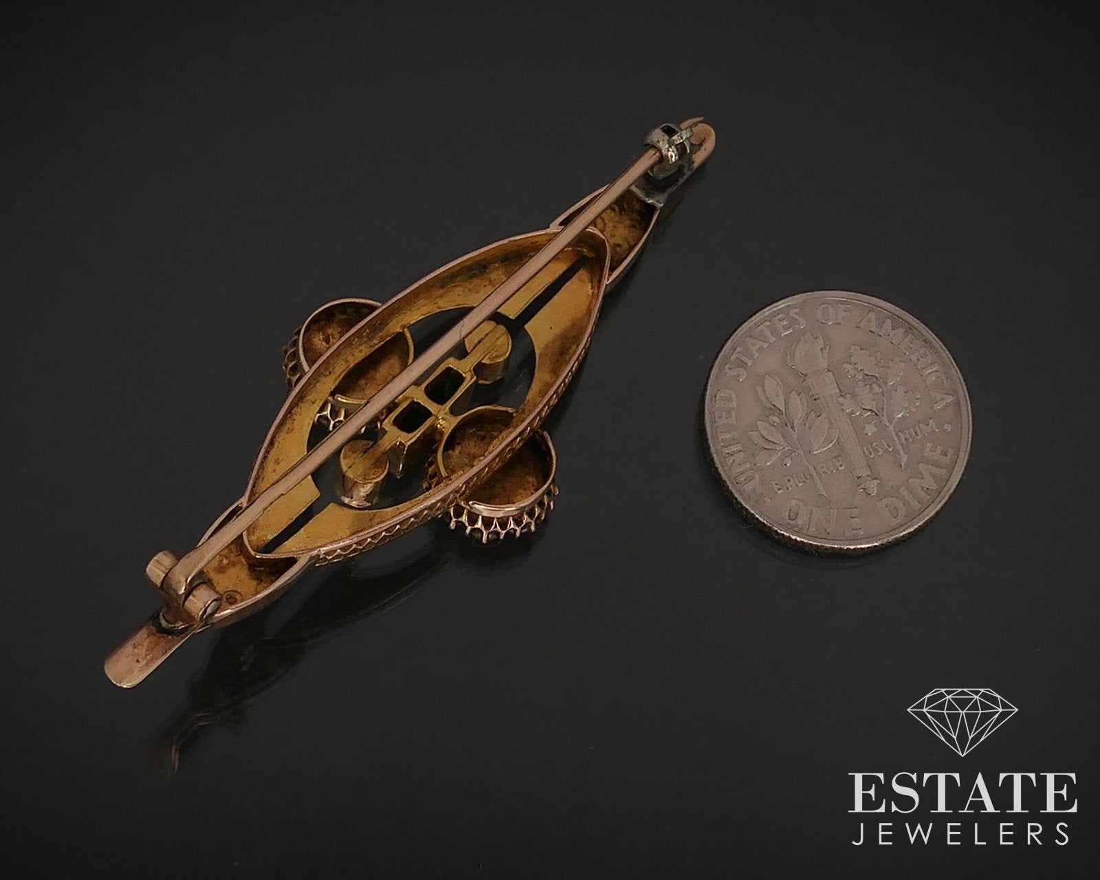 Antique Nouveau 10k Yellow Gold Green Stone Seed Pearl Pin Brooch 5g i16760