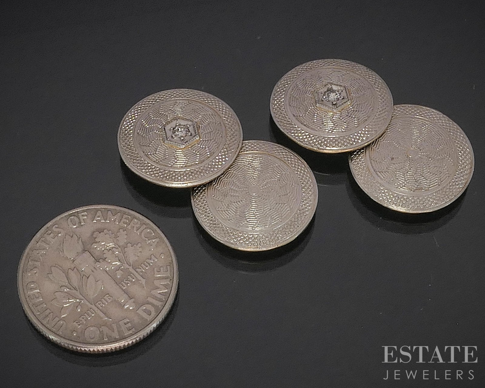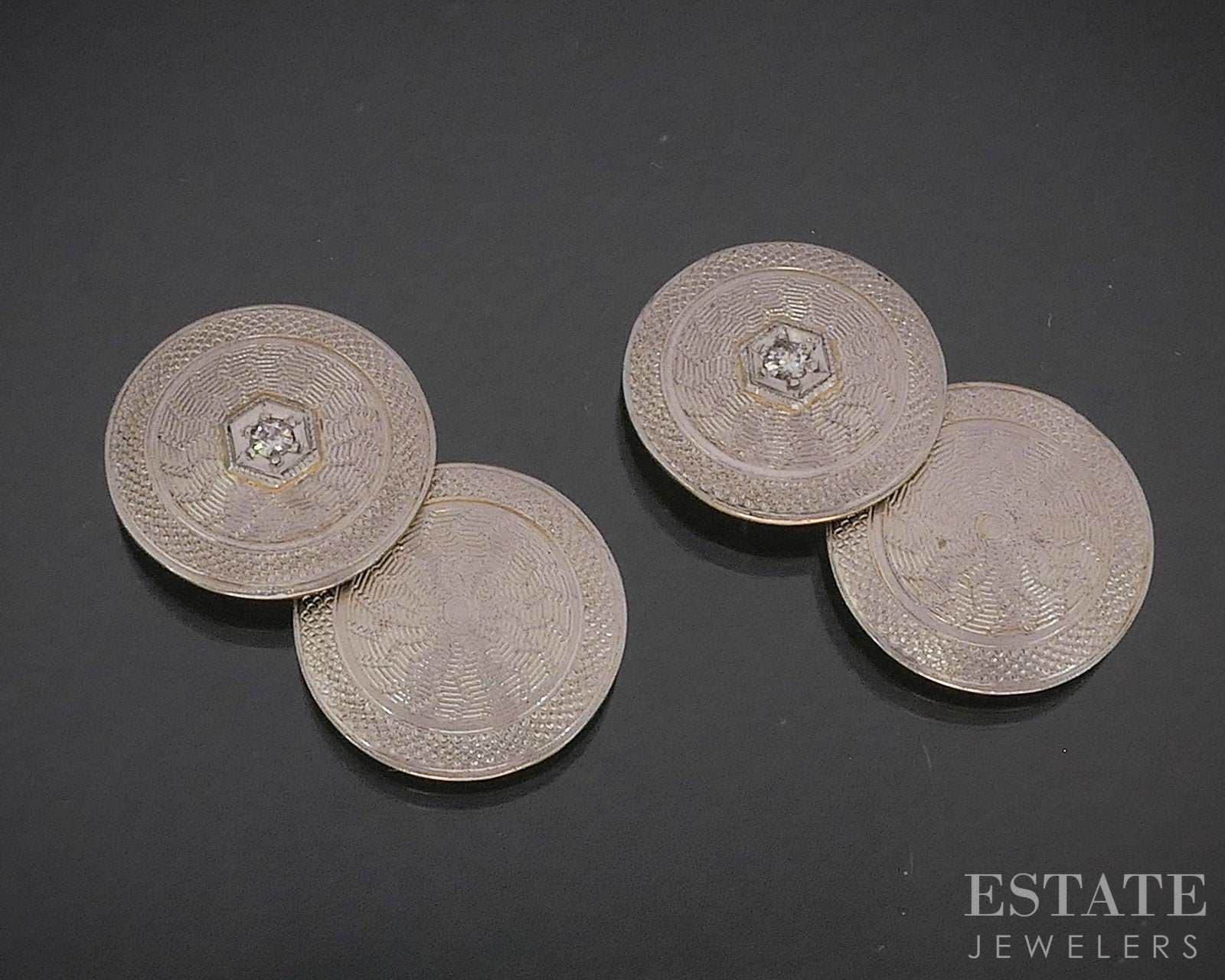 Additional Info: Handsome late Edwardian era cufflinks with a old cut natural Diamonds set in the middle of the platinum face and solid gold base. Guilloche engraved pattern to both ends.