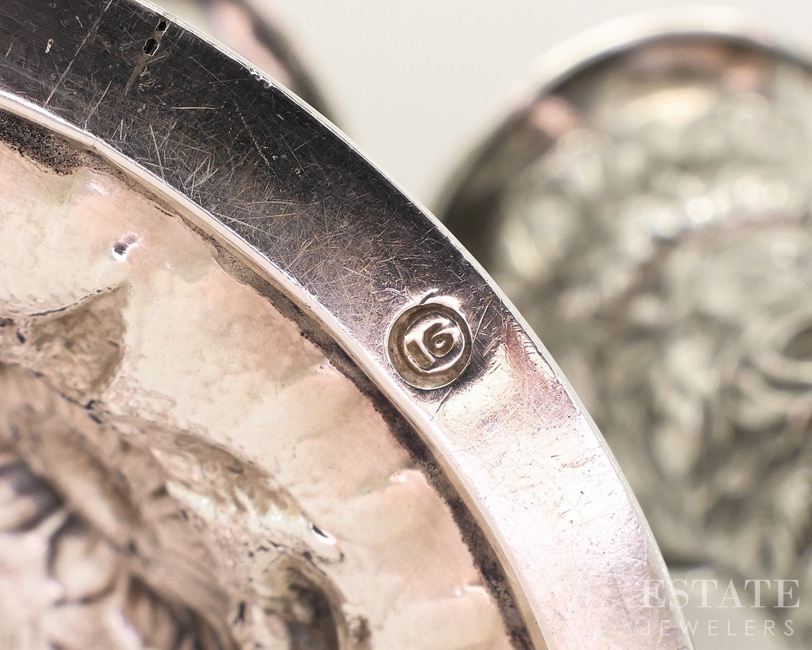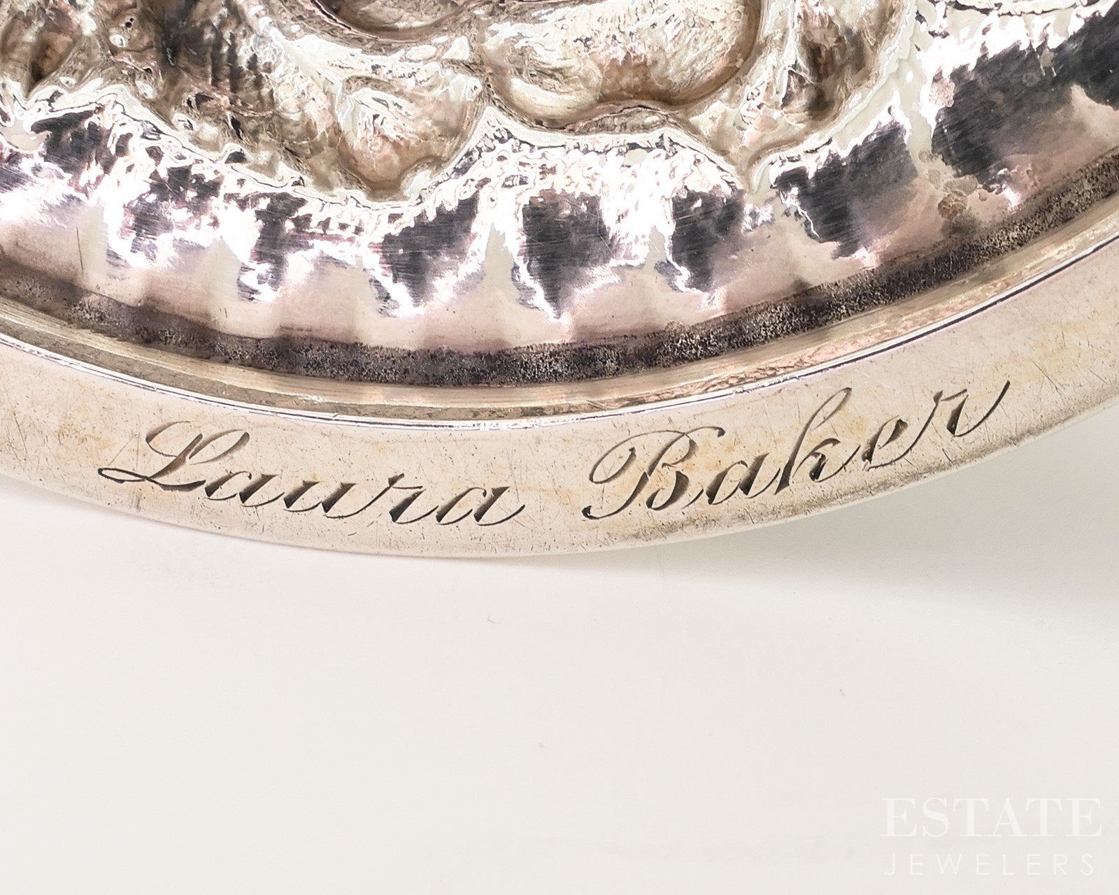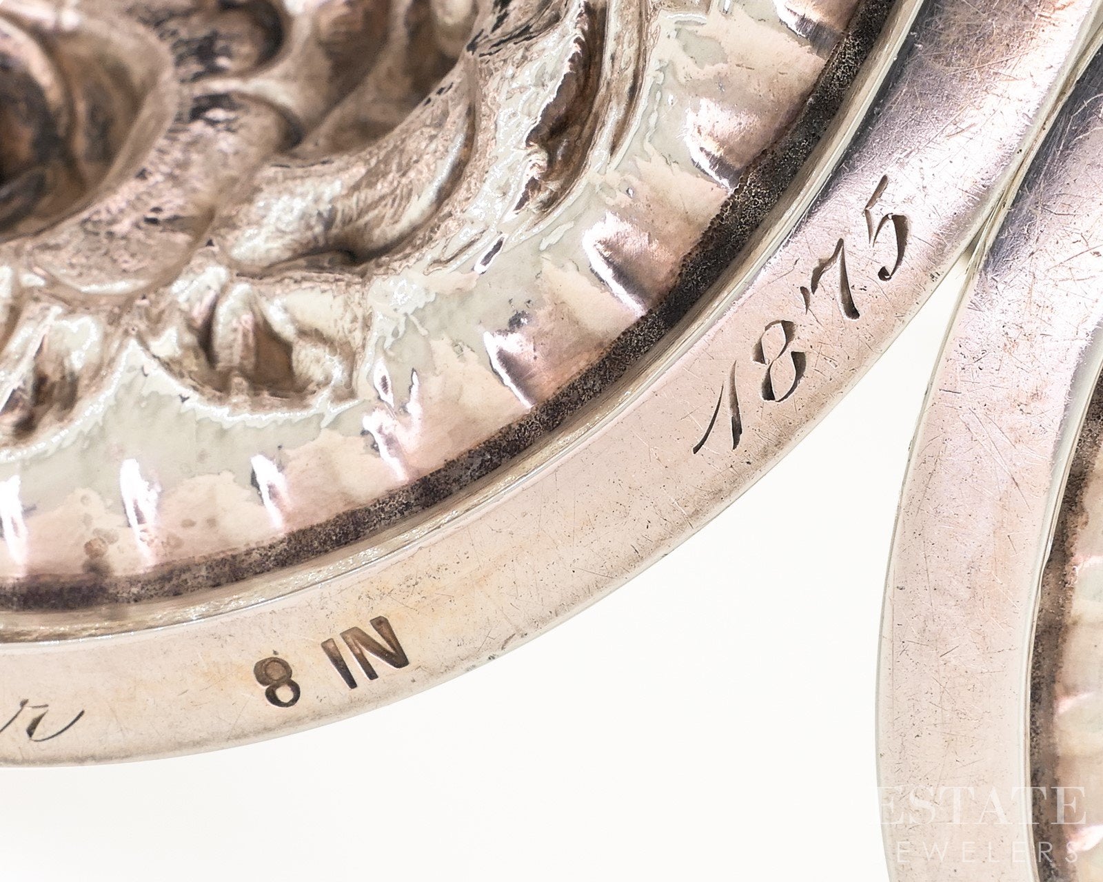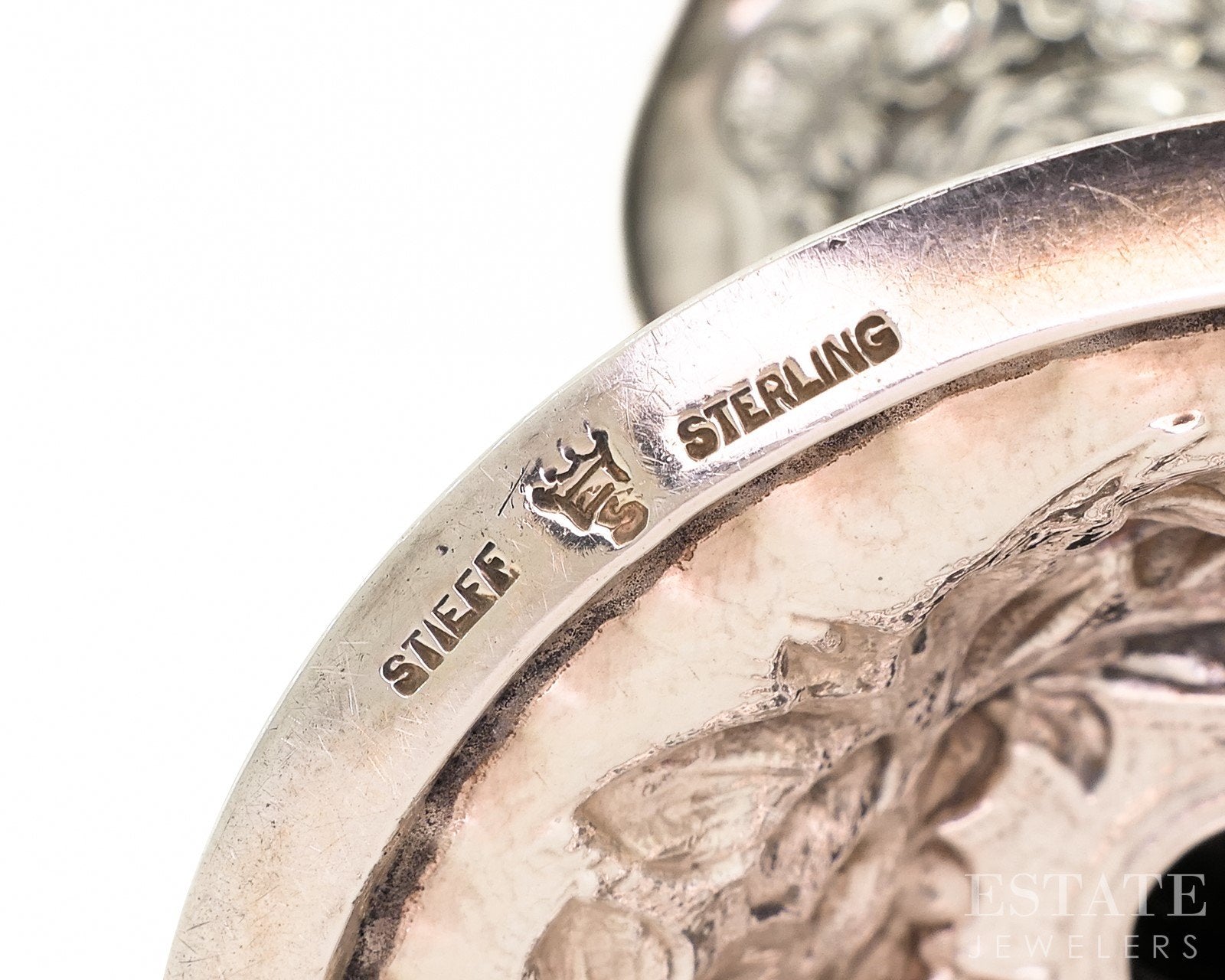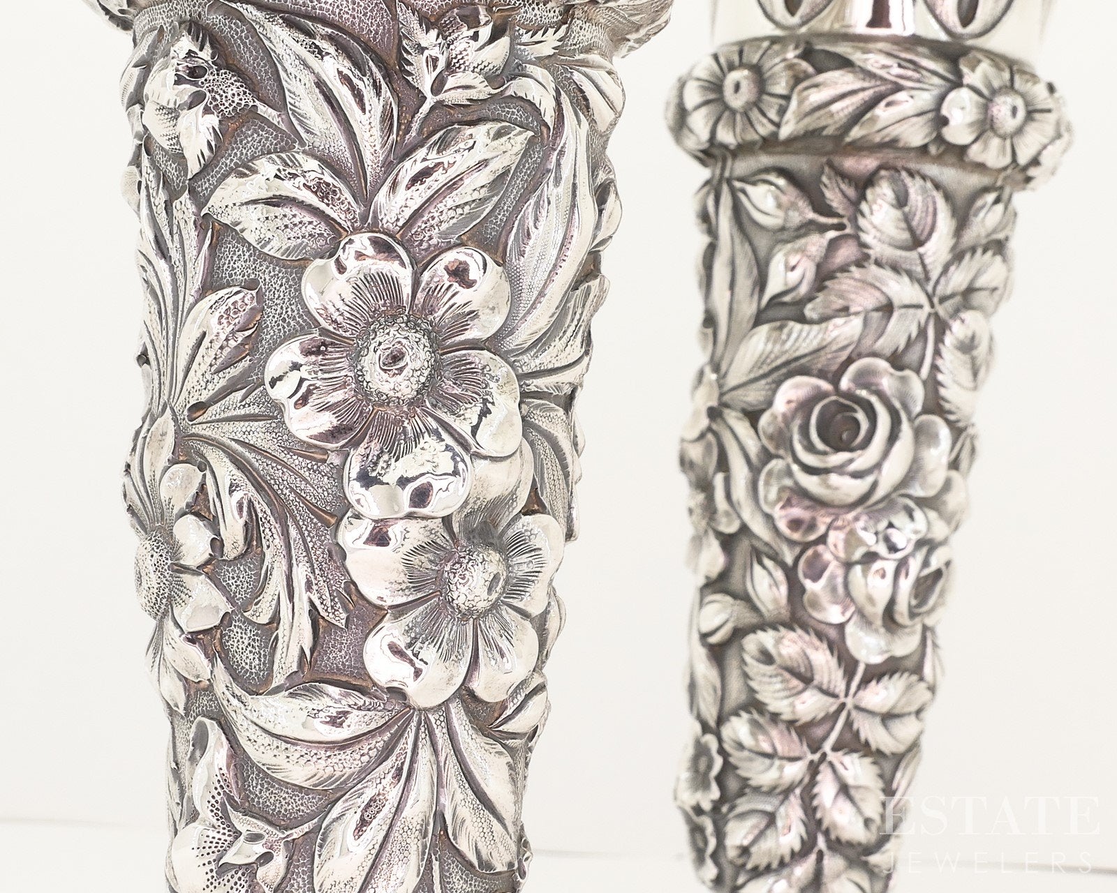Additional Info: Elegantly crafted by the renowned American silversmith Stieff, these matching sterling silver flower vase set showcases beautifully detailed floral repoussé designs. Flowing blossoms and scrolling foliage wrap the body, creating depth, texture, and visual richness that reflect Stieff’s exceptional artistry and attention to detail. Both decorative and functional, these vases are a timeless example of Stieff craftsmanship and a striking addition to any fine silver collection. Look for the matching coffee pot and sugar/cream set!
