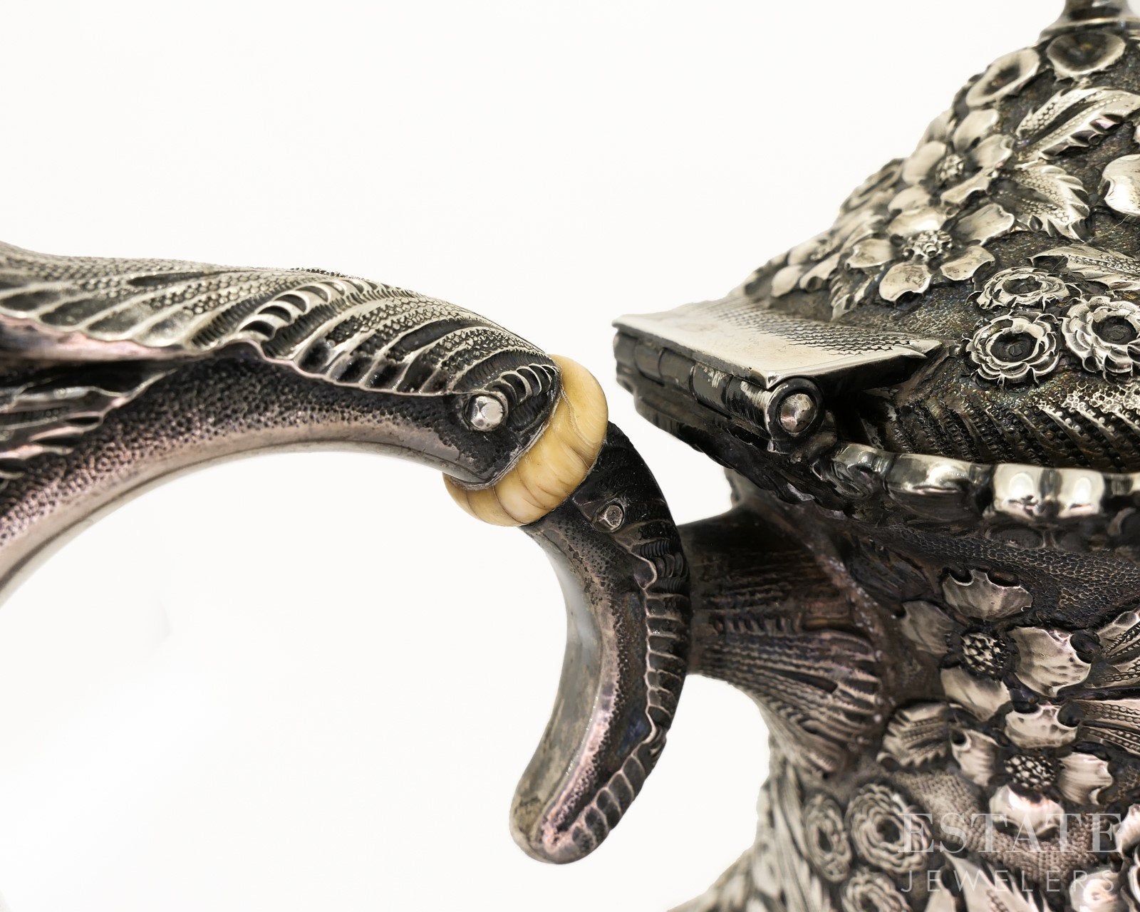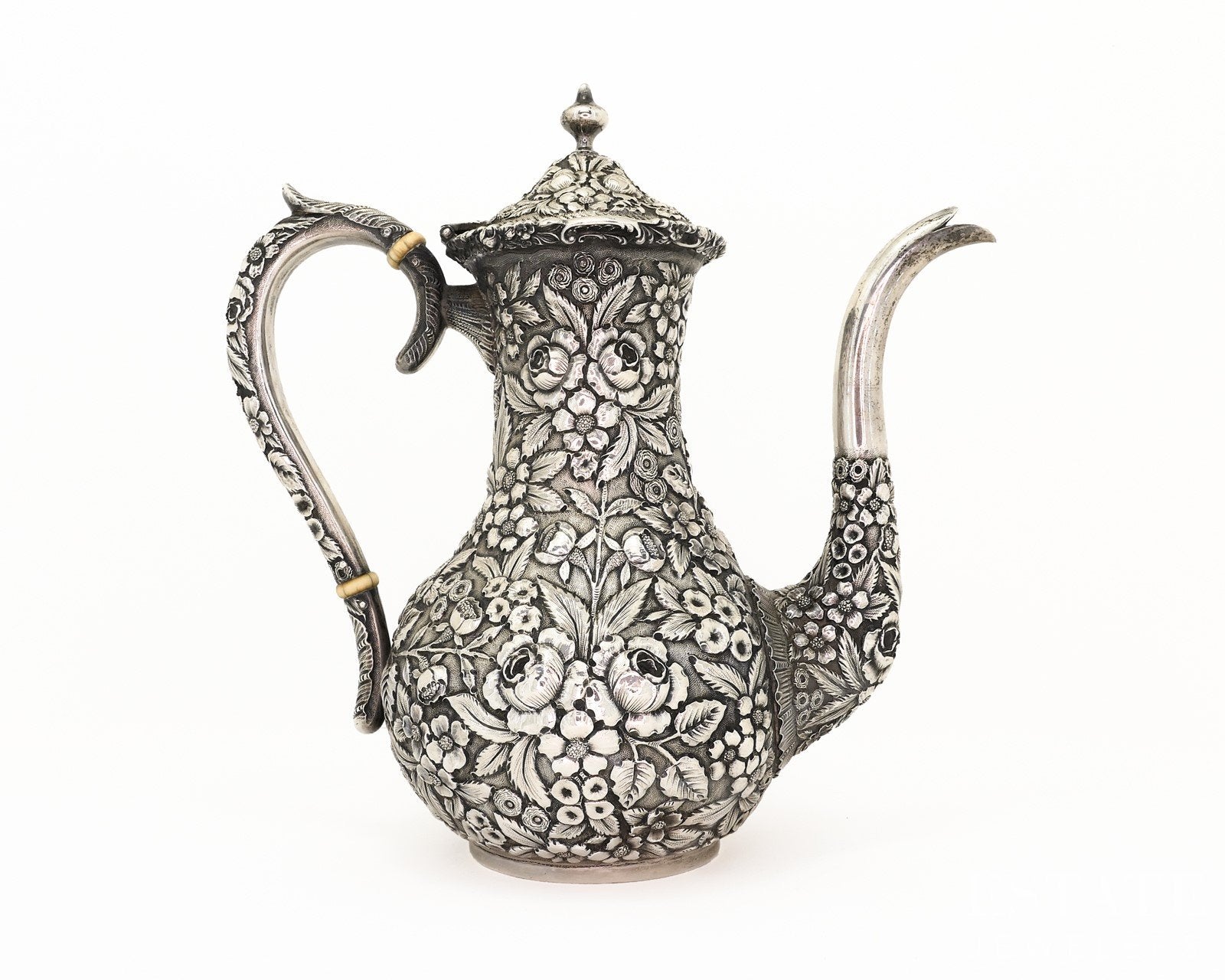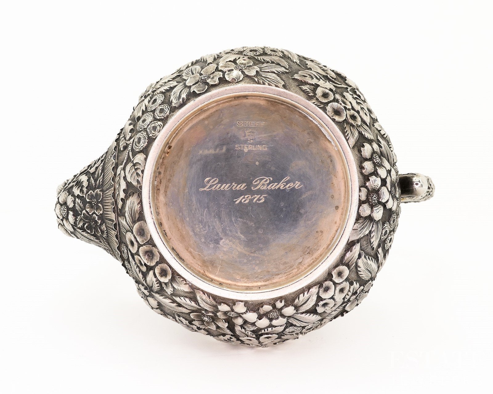 Additional Info: Elegantly crafted by the renowned American silversmith Stieff, this sterling silver coffee pot stands approximately 8 inches tall and showcases beautifully detailed floral repoussé designs. Flowing blossoms and scrolling foliage wrap the body, creating depth, texture, and visual richness that reflect Stieff’s exceptional artistry and attention to detail. The classic silhouette is complemented by a gracefully shaped spout, handle, and finial, balancing ornamentation with refined form. Both decorative and functional, this sterling coffee pot is a timeless example of Stieff craftsmanship and a striking addition to any fine silver collection. Look for our matching cream and sugar set to go with this pot!