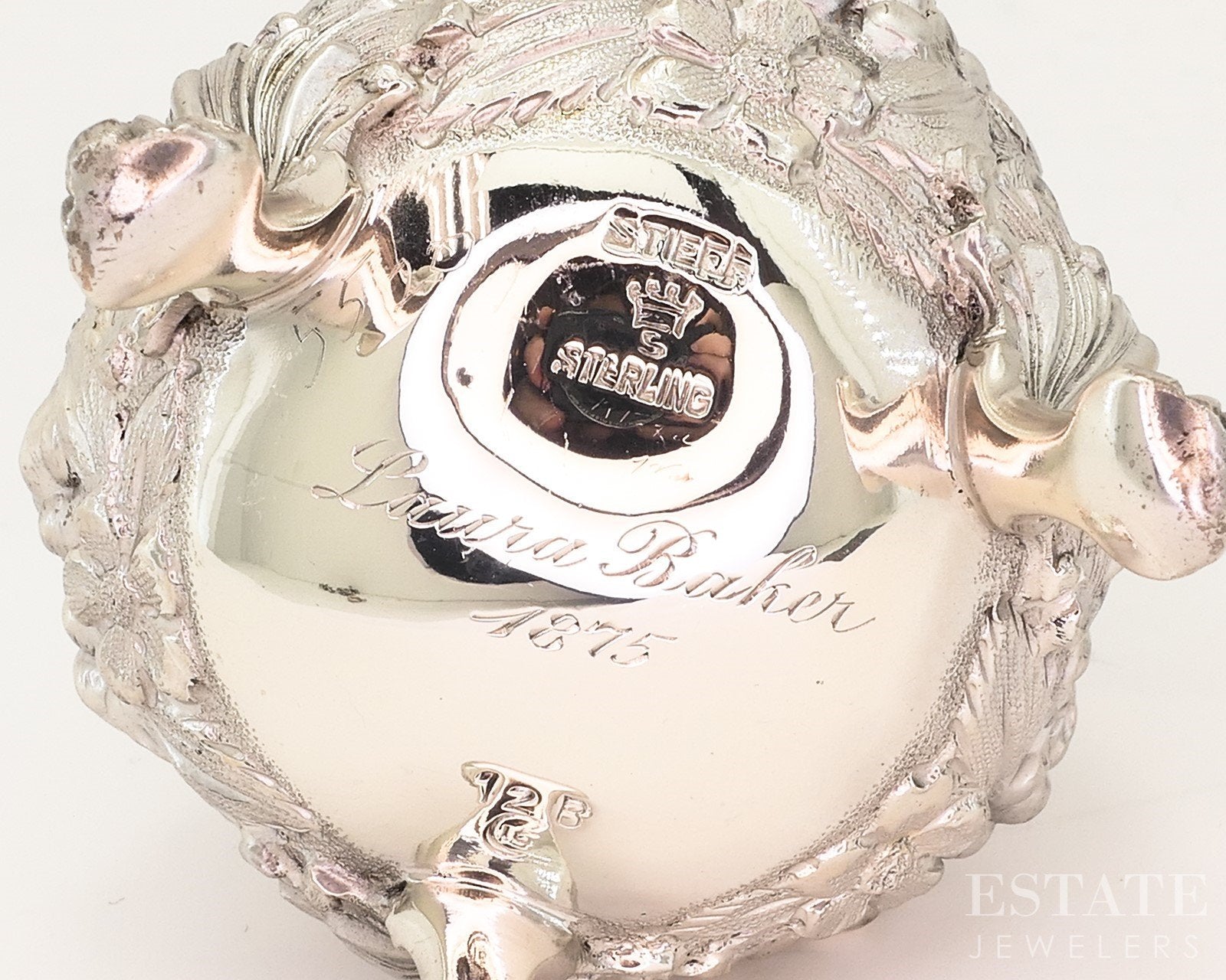 Additional Info: Elegantly crafted by the renowned American silversmith Stieff, these matching sterling silver salt & pepper shaker set showcases beautifully detailed floral repoussé designs. Flowing blossoms and scrolling foliage wrap the body, creating depth, texture, and visual richness that reflect Stieff’s exceptional artistry and attention to detail. Both decorative and functional, this shaker set is a timeless example of Stieff craftsmanship and a striking addition to any fine silver collection. Look for the other matching Stieff sterling we have listed!