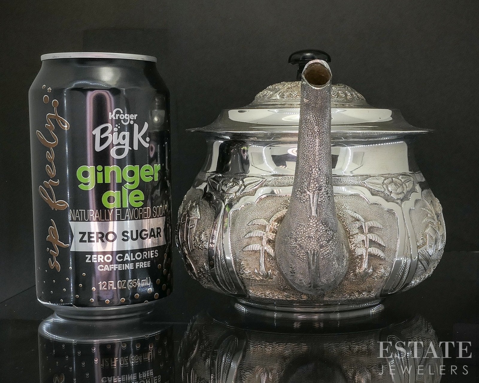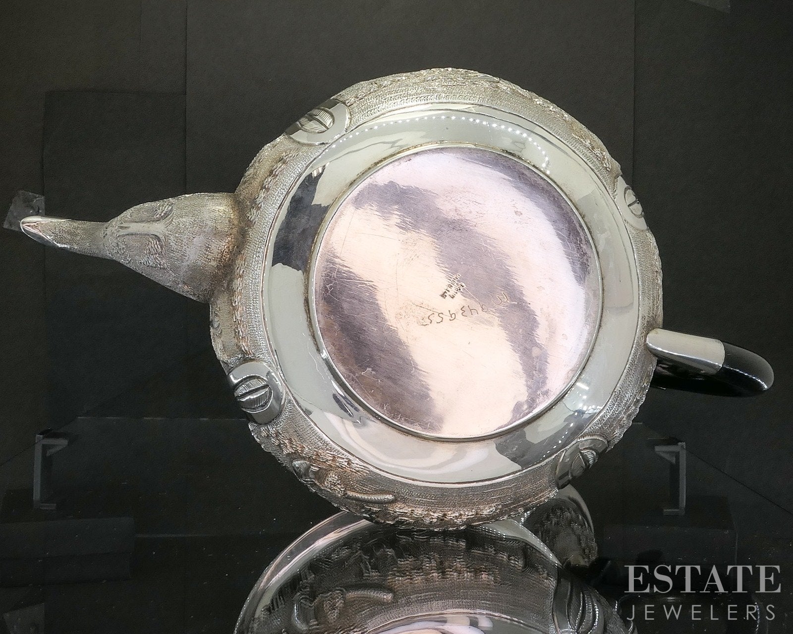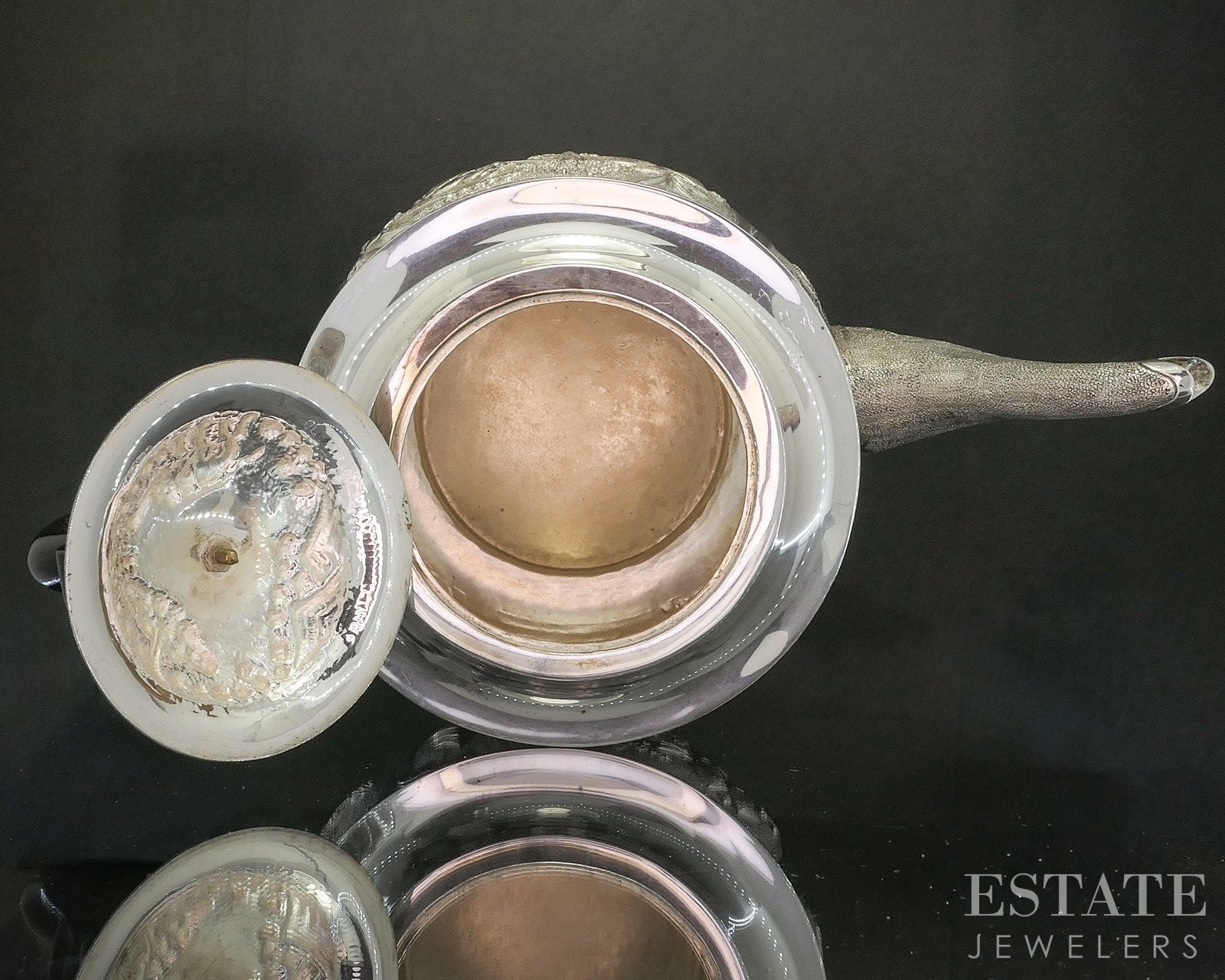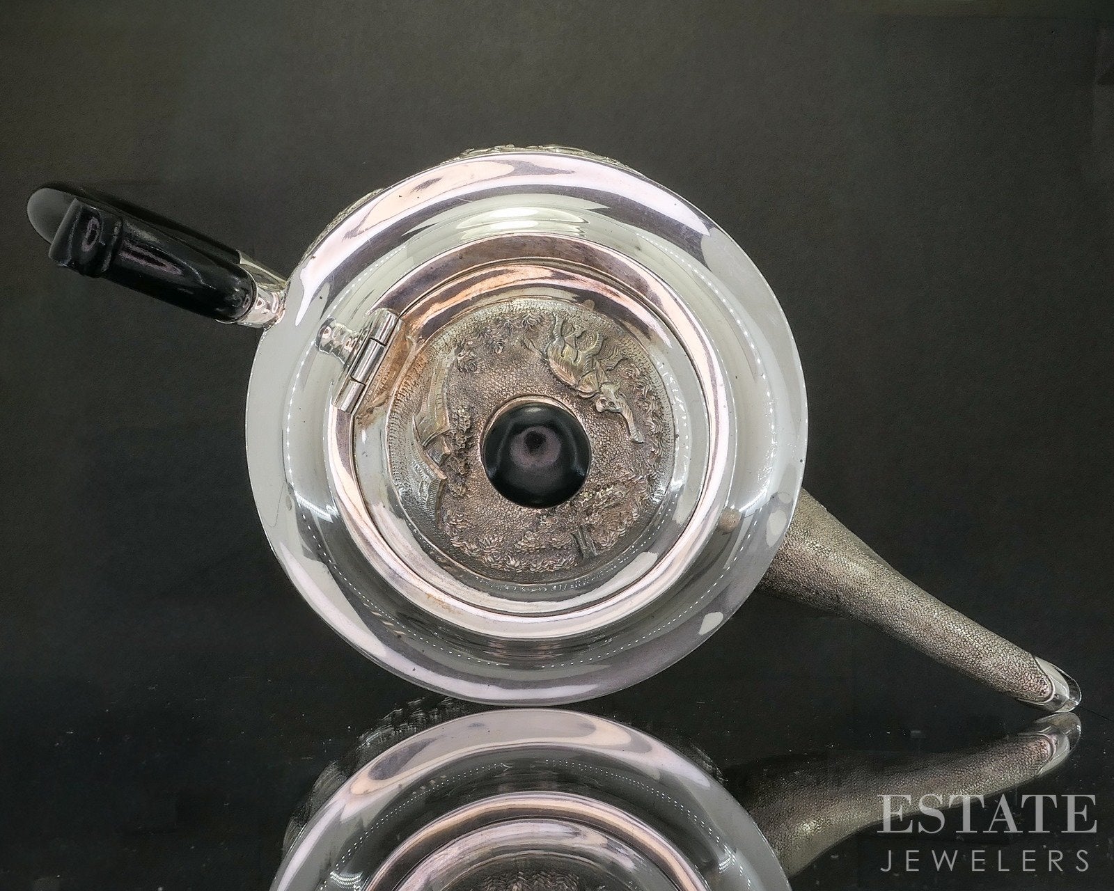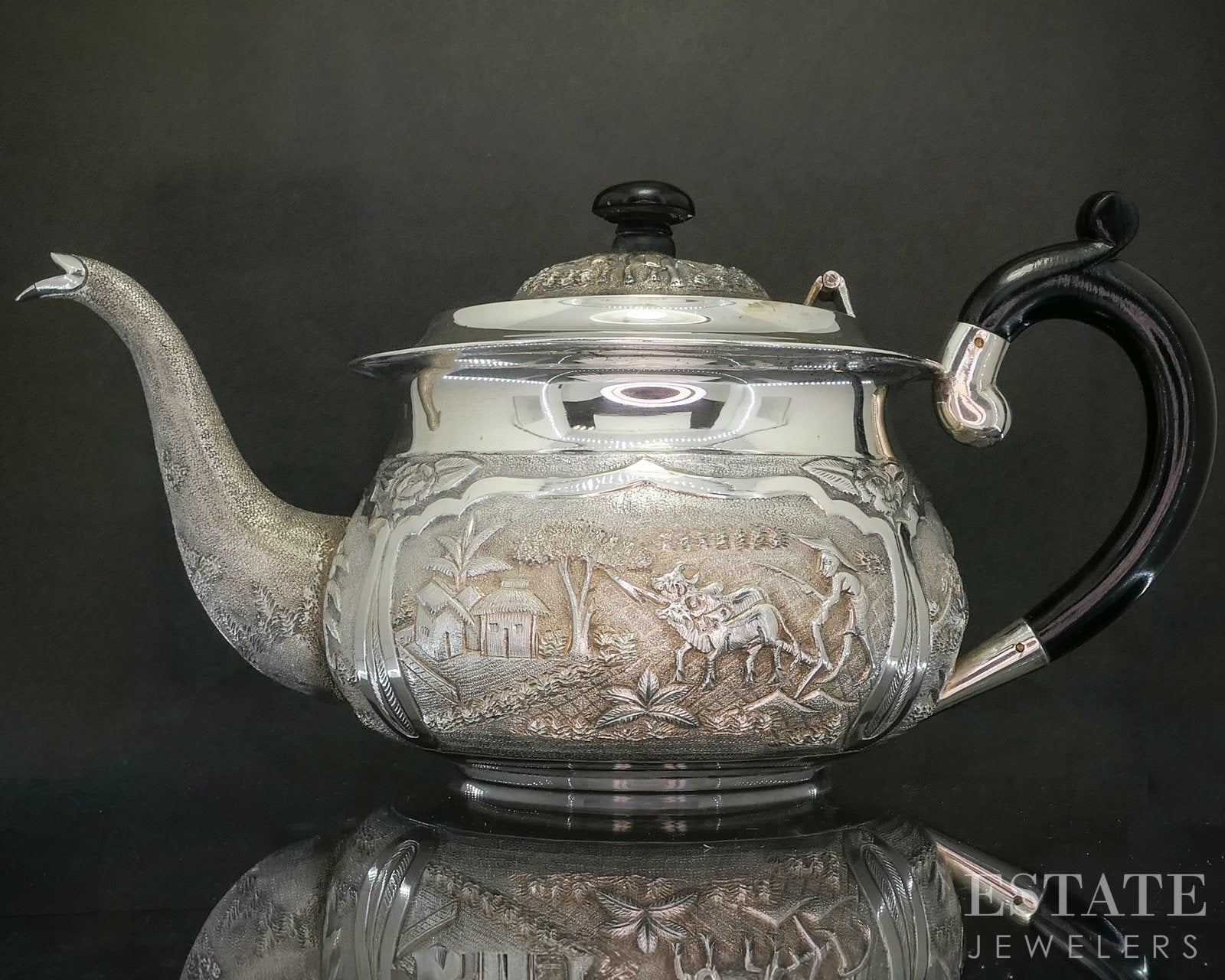 Additional Info: Striking and richly detailed, this sterling silver teapot features an elegant ebony wood handle, offering both visual contrast and comfortable handling. The body of the teapot is adorned with intricate repoussé designs depicting elephants and farmers in a continuous scenic motif, showcasing exceptional craftsmanship and storytelling artistry. The raised detailing creates depth and movement, bringing the figures to life across the polished silver surface. Both functional and decorative, this remarkable teapot is a captivating statement piece that blends fine silverwork with cultural and artistic charm! Look for the other matching Elephant Indian sterling we have listed!
