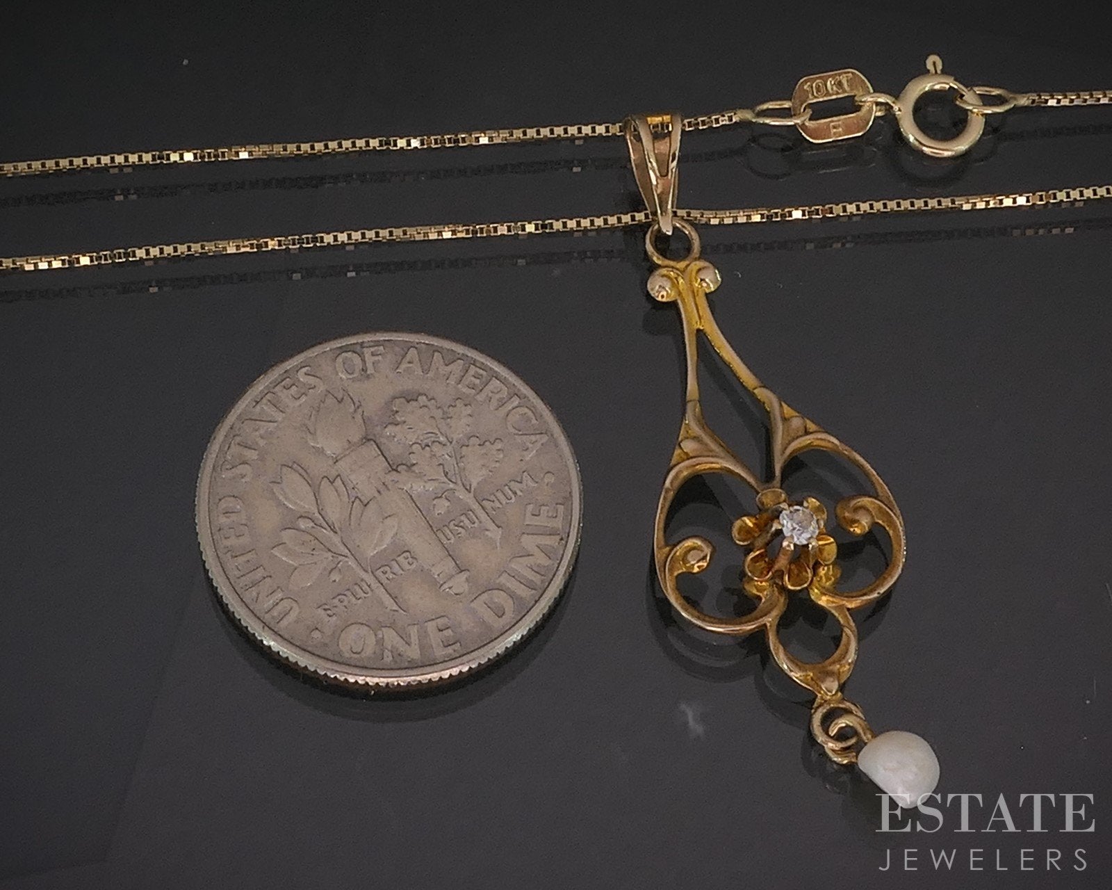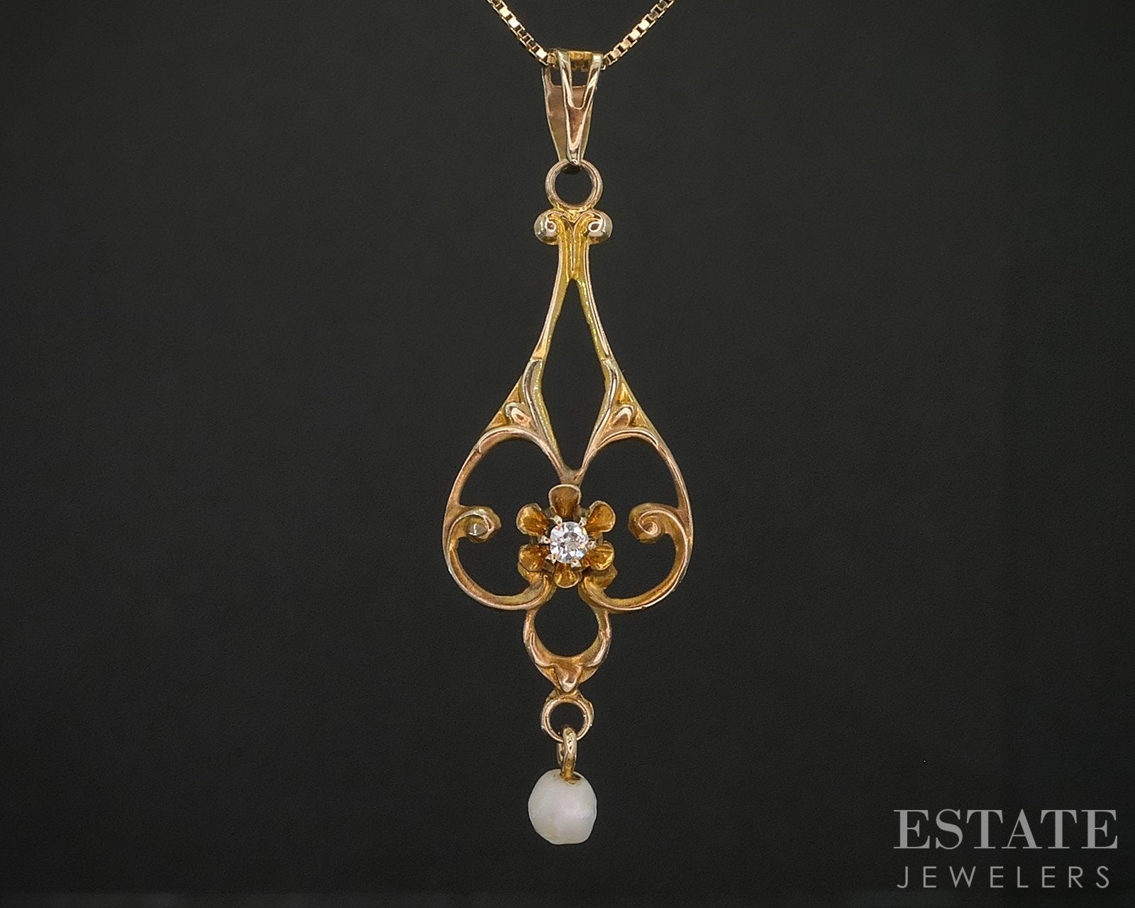 Additional Info: Lovely early 1900's drop pendant with an old cut Diamond in the middle and dangling Pearl. Dainty box chain attached.