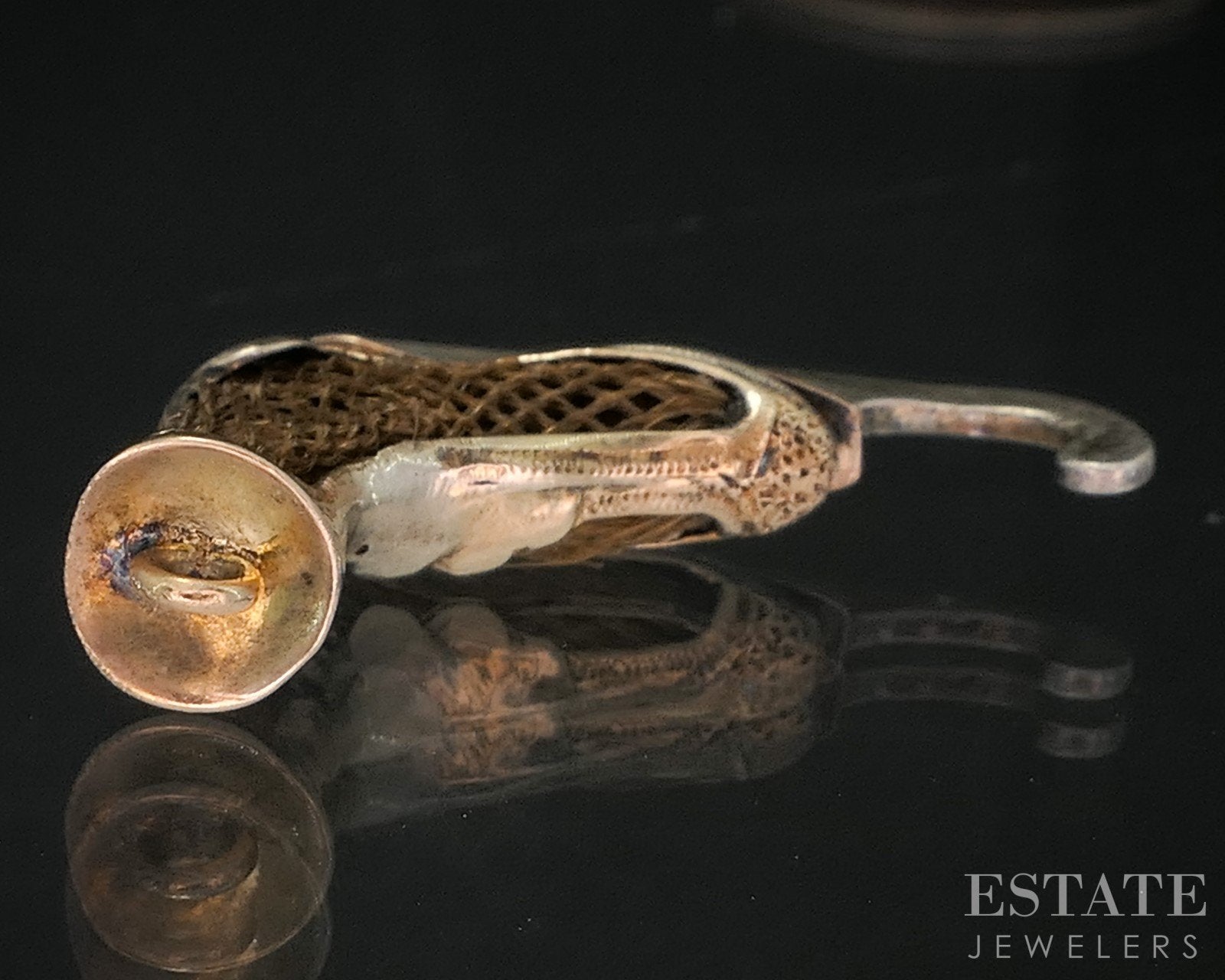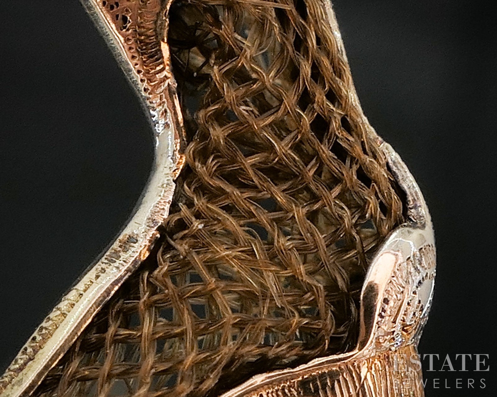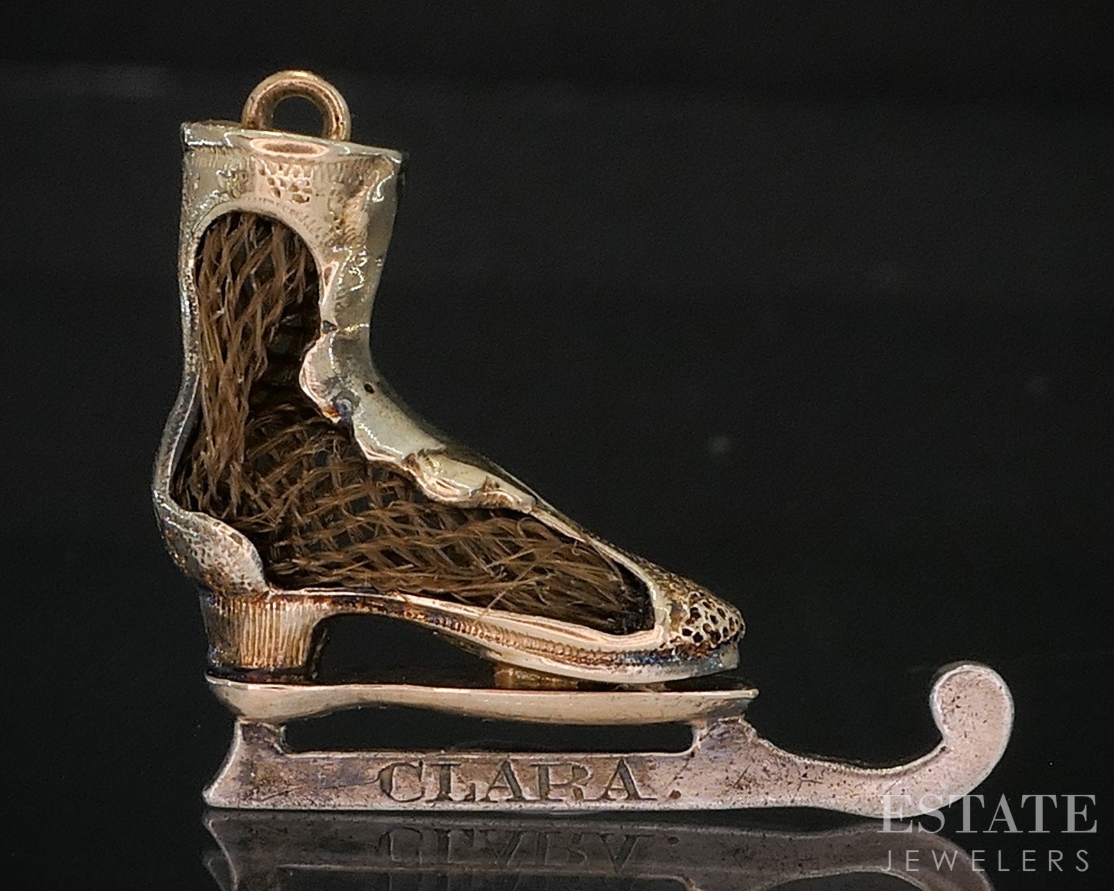 Additional Info: Steeped in sentiment and rich with history, this Victorian gold charm is a poignant example of 19th-century mourning jewelry and the art of personal keepsakes. Expertly handcrafted in warm 10K yellow gold, the charm features an intricately woven lock of hair—often from a loved one—as the base of the skate. Hair jewelry was a deeply personal and symbolic tradition during the Victorian era, used to commemorate loved ones, celebrate relationships, or mark important life events. This charm would have likely been worn on a bracelet, watch chain, or chatelaine, serving as a treasured and discreet reminder of someone dearly held