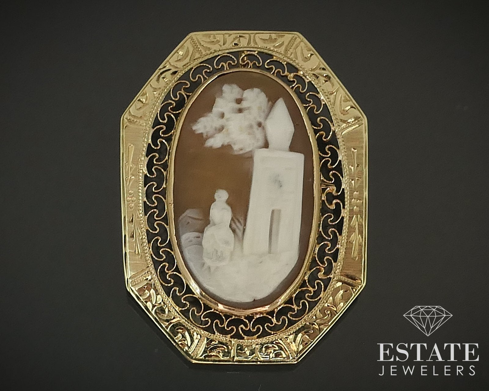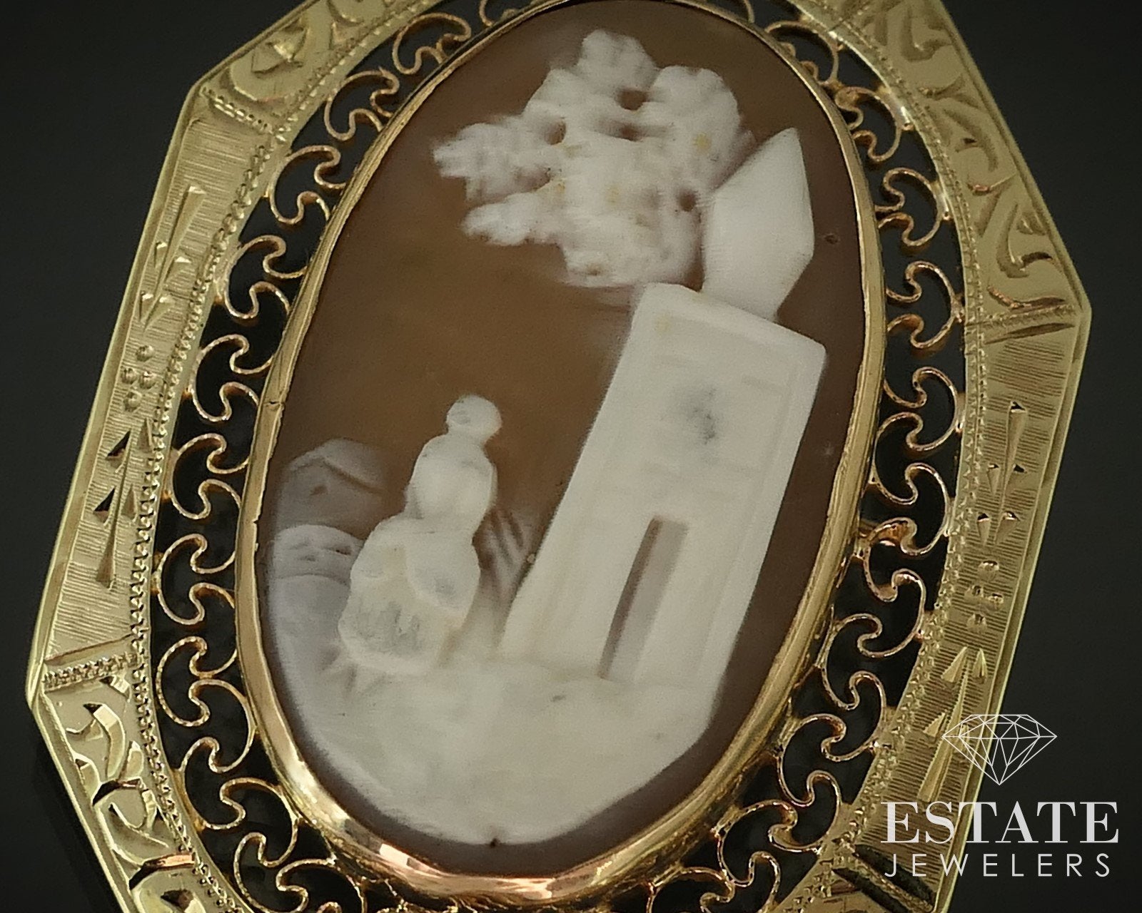 Beautiful early 1900s gold brooch with a natural 22mm by 13mm scenic cameo bezel set. Stunning filigree setting holding it. Measures 1-1/4" long. stamped 10k.