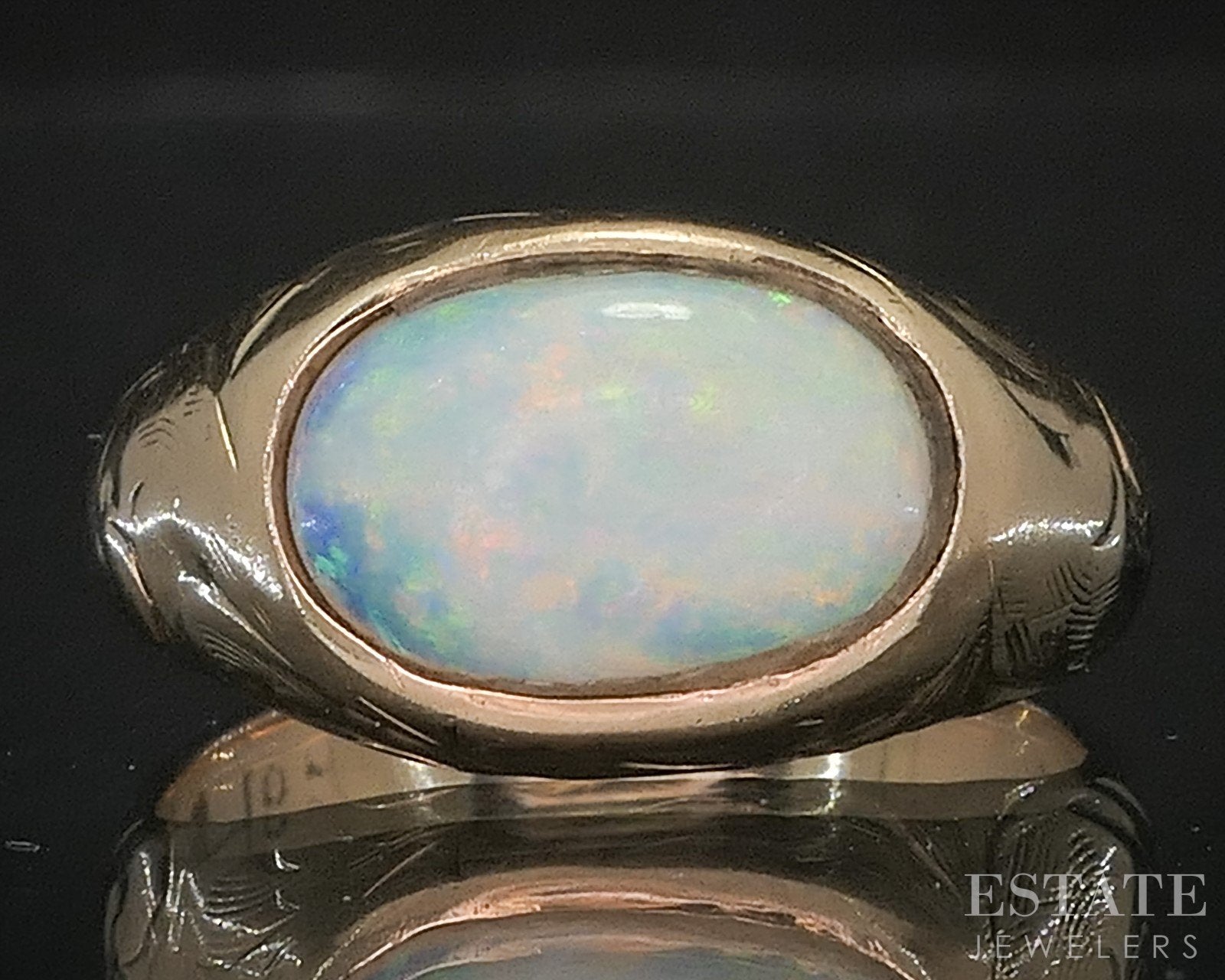 Additional Info: Beautiful early-century ring with a colorful Opal bezel set on the face of a hand engraved setting. Strong blue and green color flashes to the stones.
