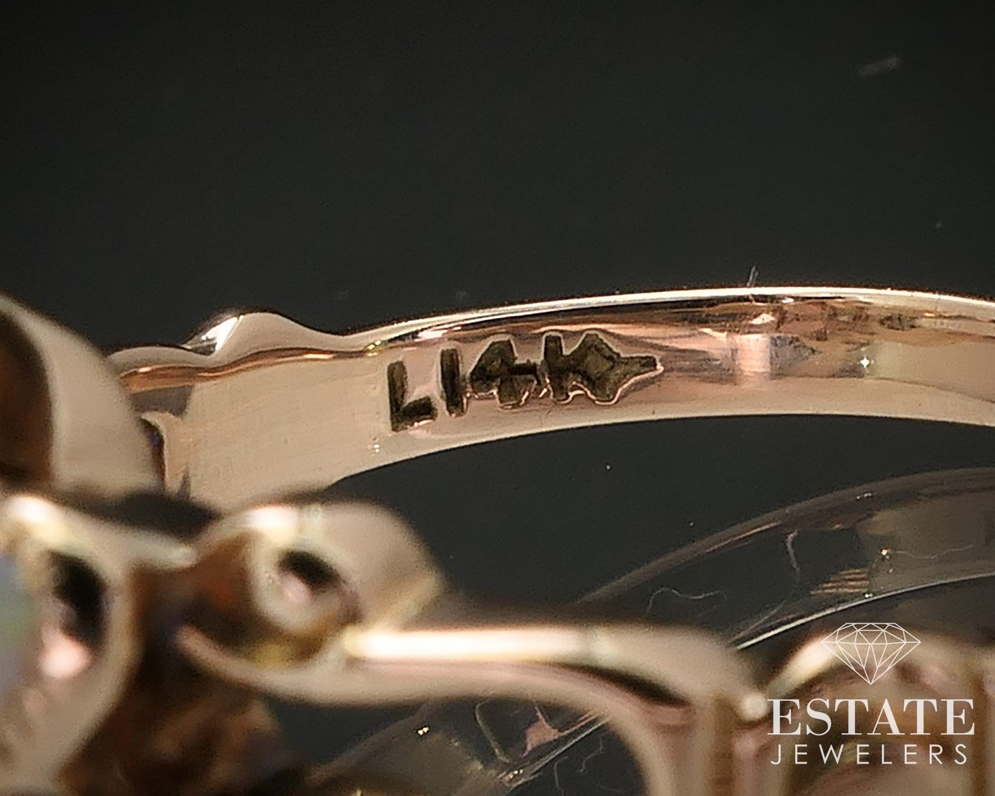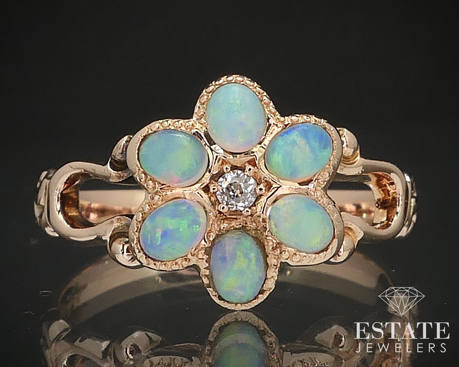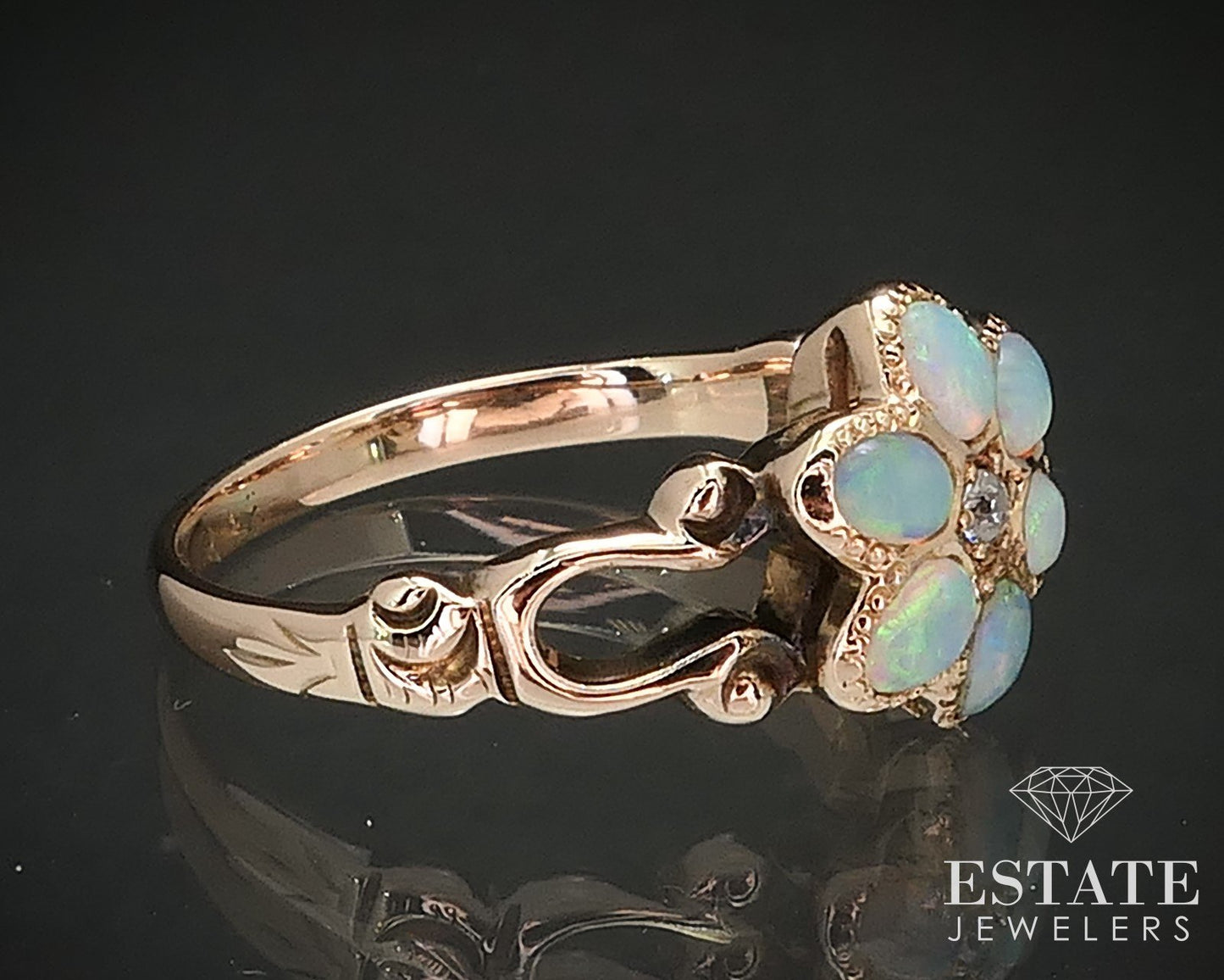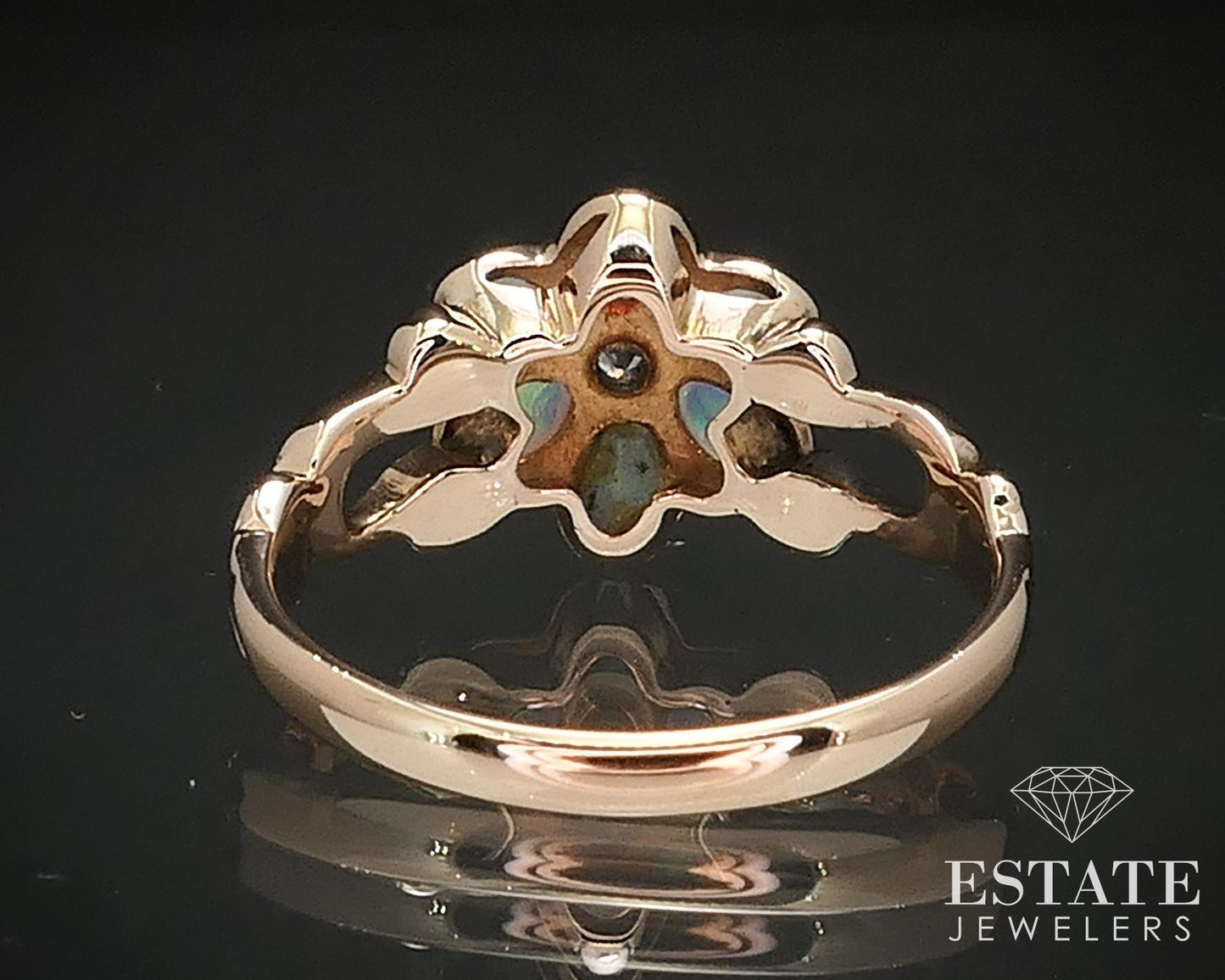 Antique Victorian 14k Rose Gold Natural Opal & Diamond Flower Ring 1.9g i17415