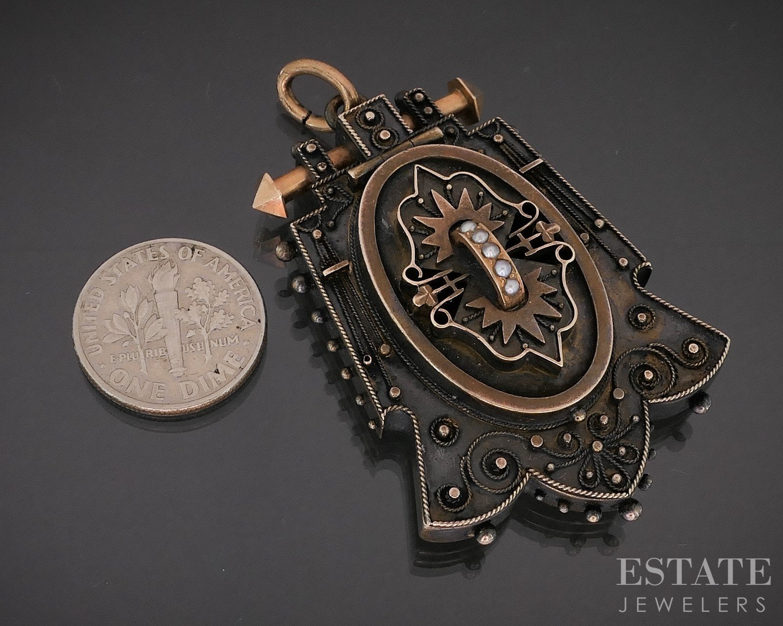 Additional Info: Steeped in sentiment and historical charm, this original exquisite Victorian-era mourning locket is a fine example of Etruscan Revival craftsmanship. Handcrafted in warm 14k gold, the locket features intricate granulation and wirework, hallmarks of the revivalist style that drew inspiration from ancient Etruscan goldsmithing techniques. The front is adorned with symbolic motifs often associated with remembrance and loss, while the middle opens to reveal a compartment with the original lock of hair encased. A deeply personal piece of 19th-century jewelry, this locket not only reflects the mourning customs of the Victorian era but also showcases the exceptional artistry of the time! Museum quality piece!