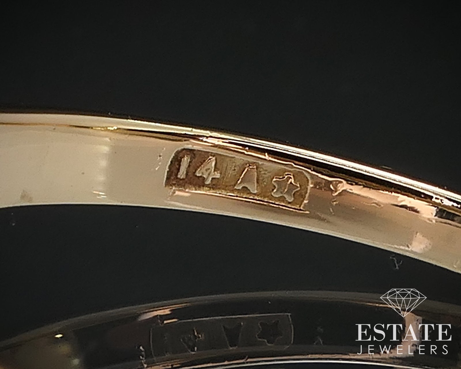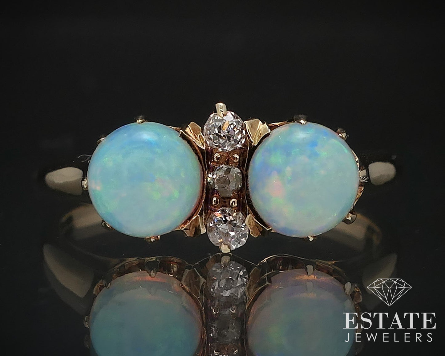 Beautiful early Victorian era gold ring with approximately .08ctw of European cut diamonds accenting the matching 5mm opals. stamped 14k SIZE-8