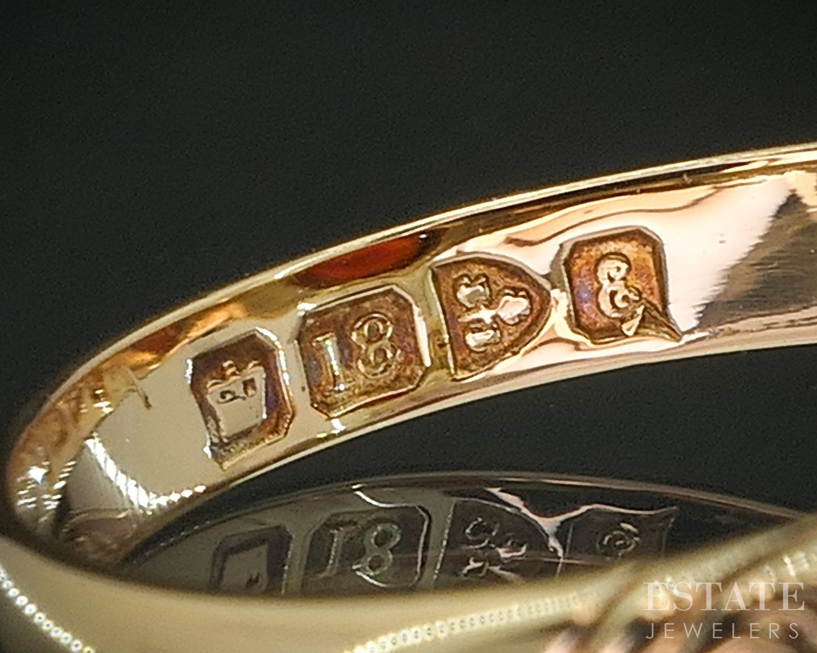 Additional Info: This Victorian-era ring is crafted in rich yellow gold in the classic belcher style, characterized by its bold, leaf engraved setting and smooth, rounded shoulders. At its center rests a deep orange-red Carnelian gemstone, prized for its warm hue and polished glow. The stone is securely set within broad, carved prongs that seamlessly blend into the band, showcasing the elegant craftsmanship of the period. Authentic British hallmarks are stamped inside the shank, attesting to its origin and purity. Refined yet substantial, this ring is a striking example of Victorian design — a timeless piece that carries both beauty and history.