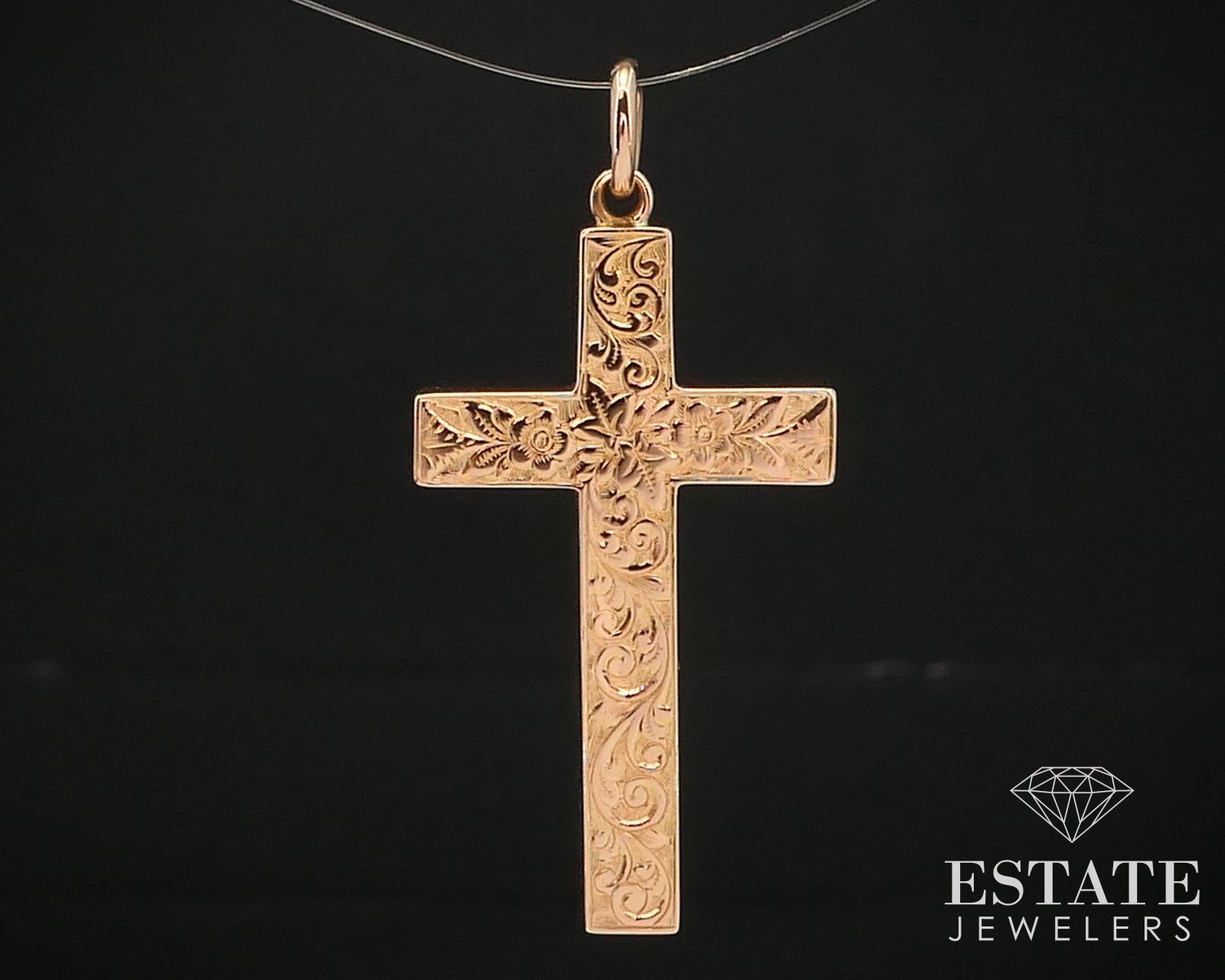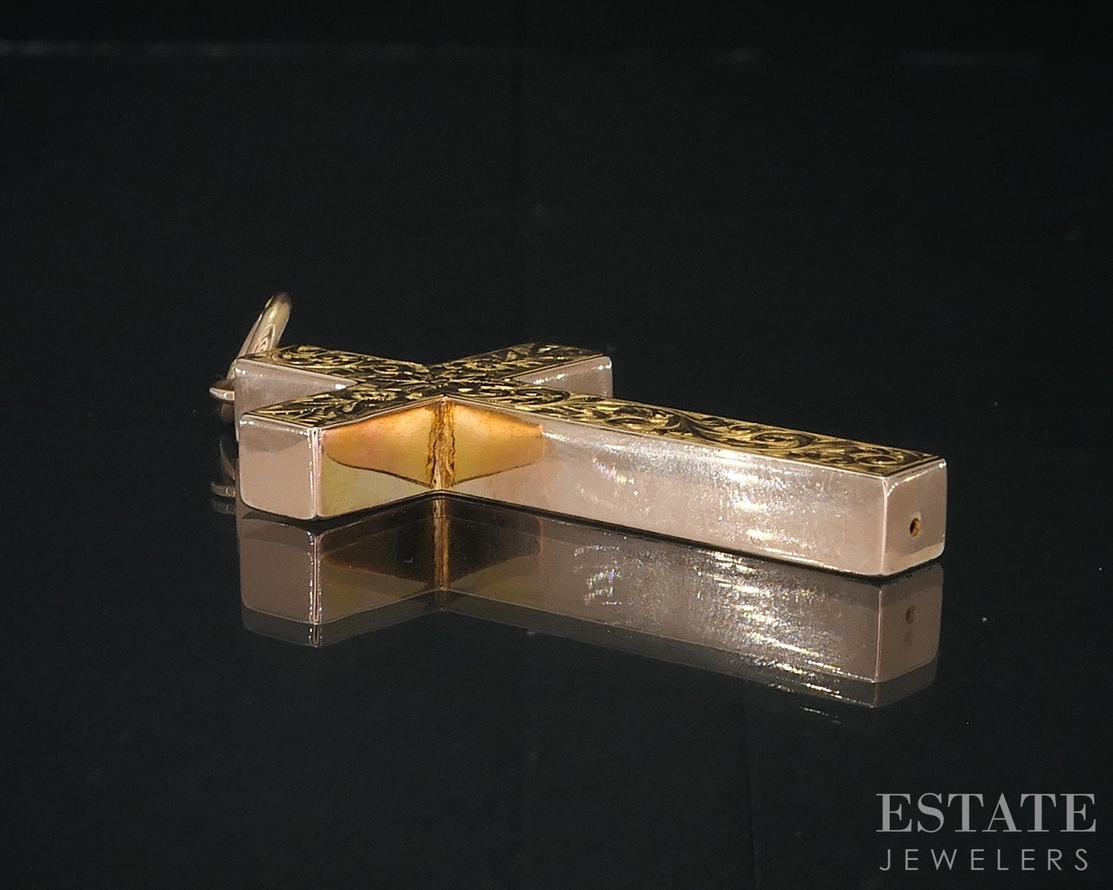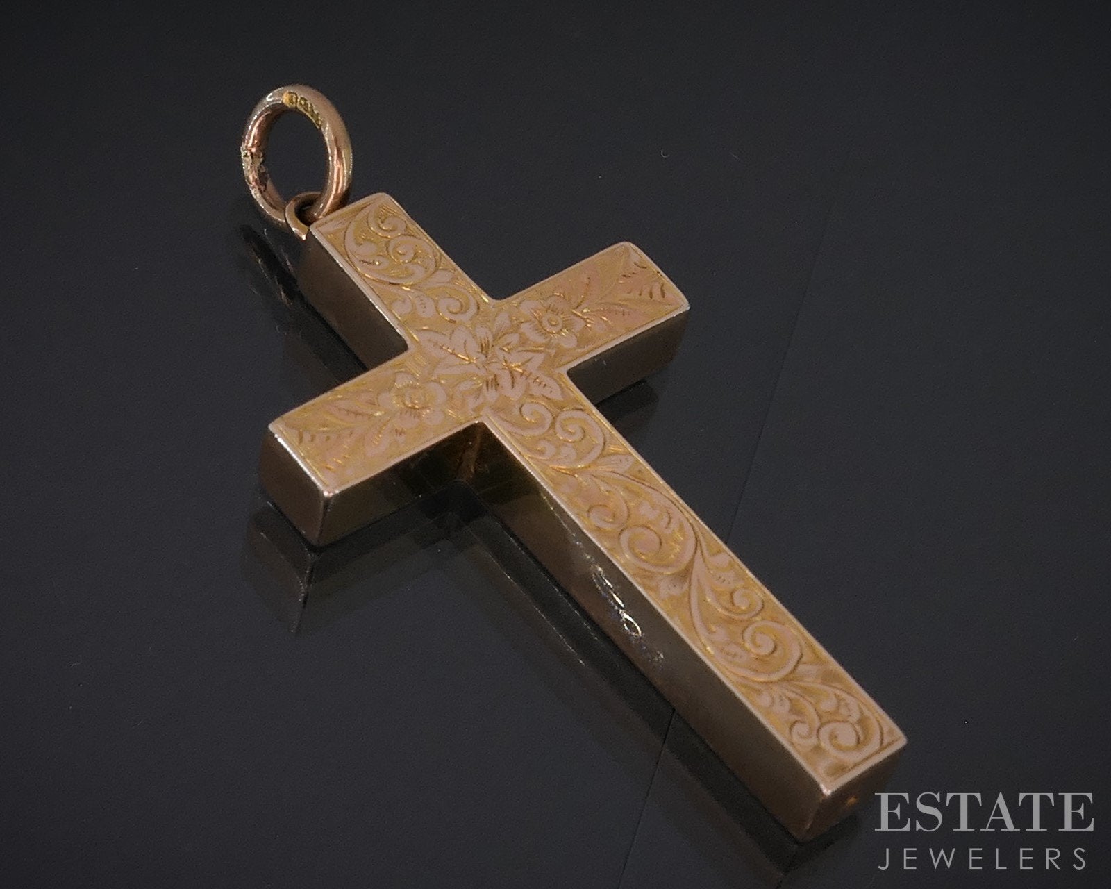 Beautiful Victorian era cross with engraved designs on the face. Rare dimensional style solid gold cross with European hallmarks stamped 375 1-7/86"L including bale