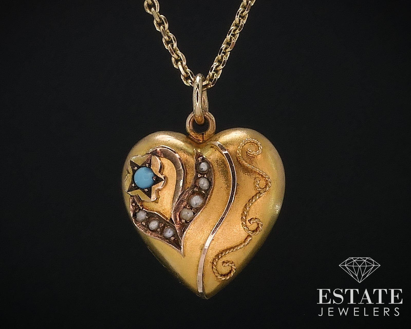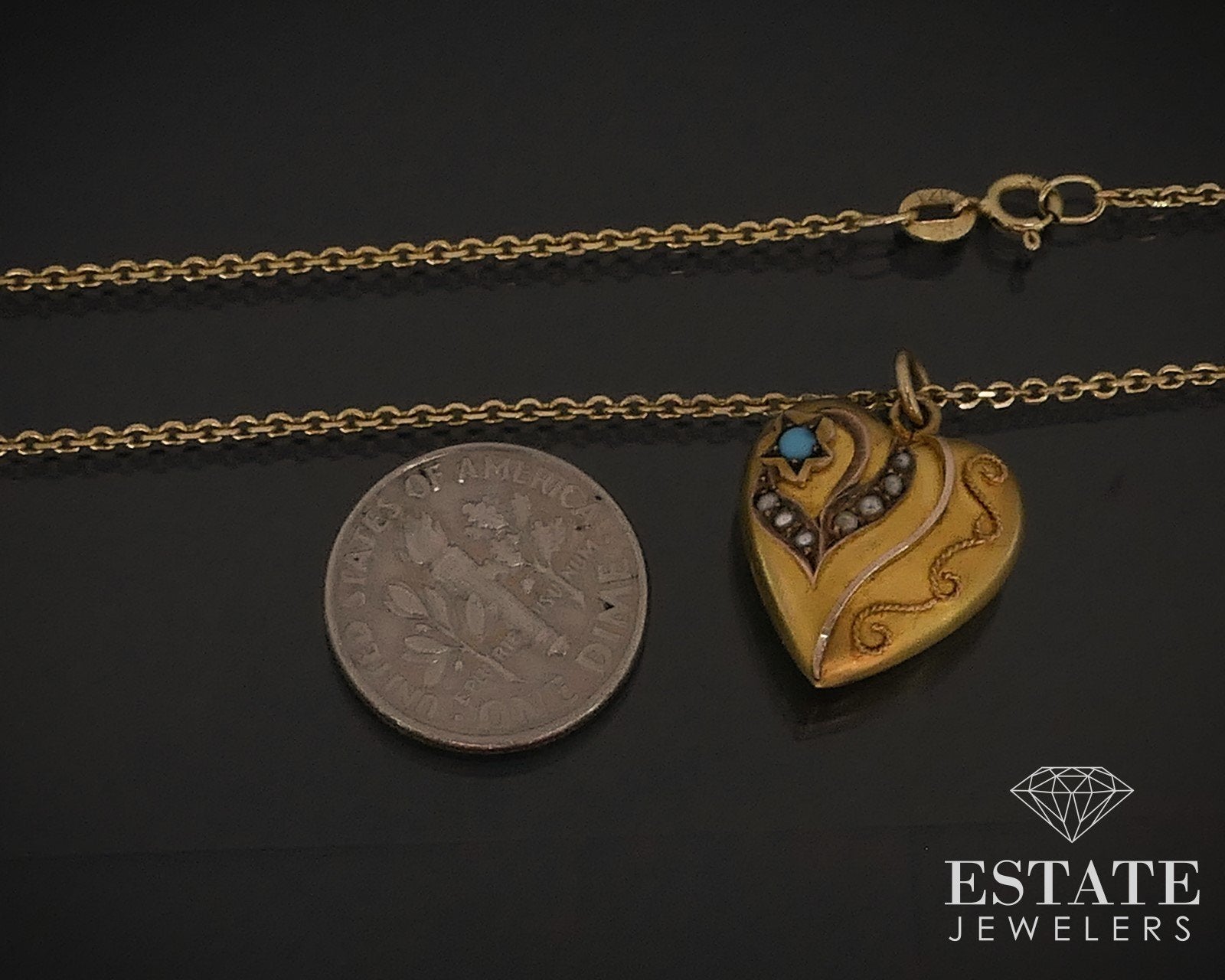 Antique Victorian Solid Gold Seed Pearl Turquoise Puffy Heart Necklace 4g i17617