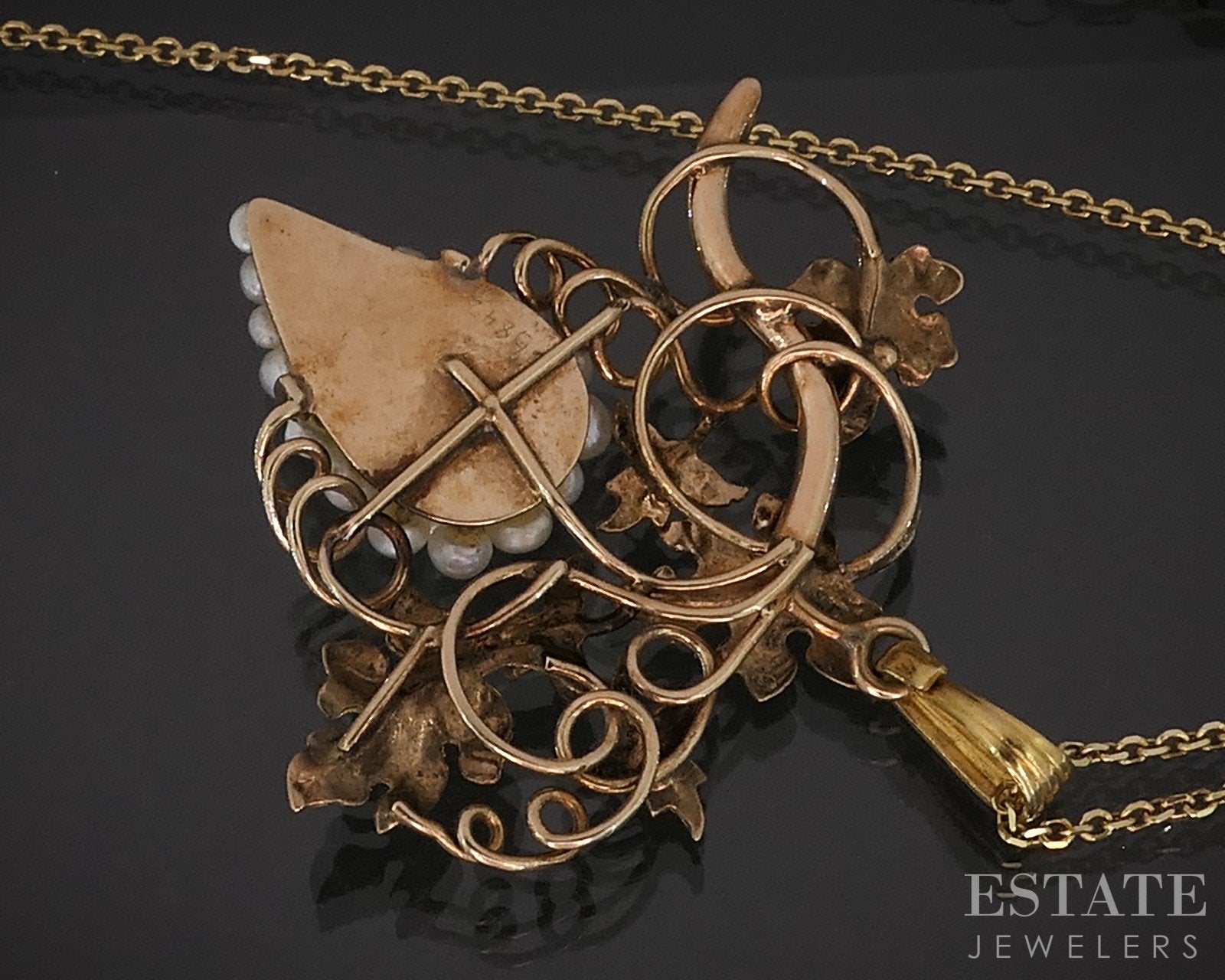 Additional Info: Stunning original Victorian era necklace with a grape vine style pendant attached! Natural Seed Pearls in a cluster to look like grapes! Attached to a cable link chain.