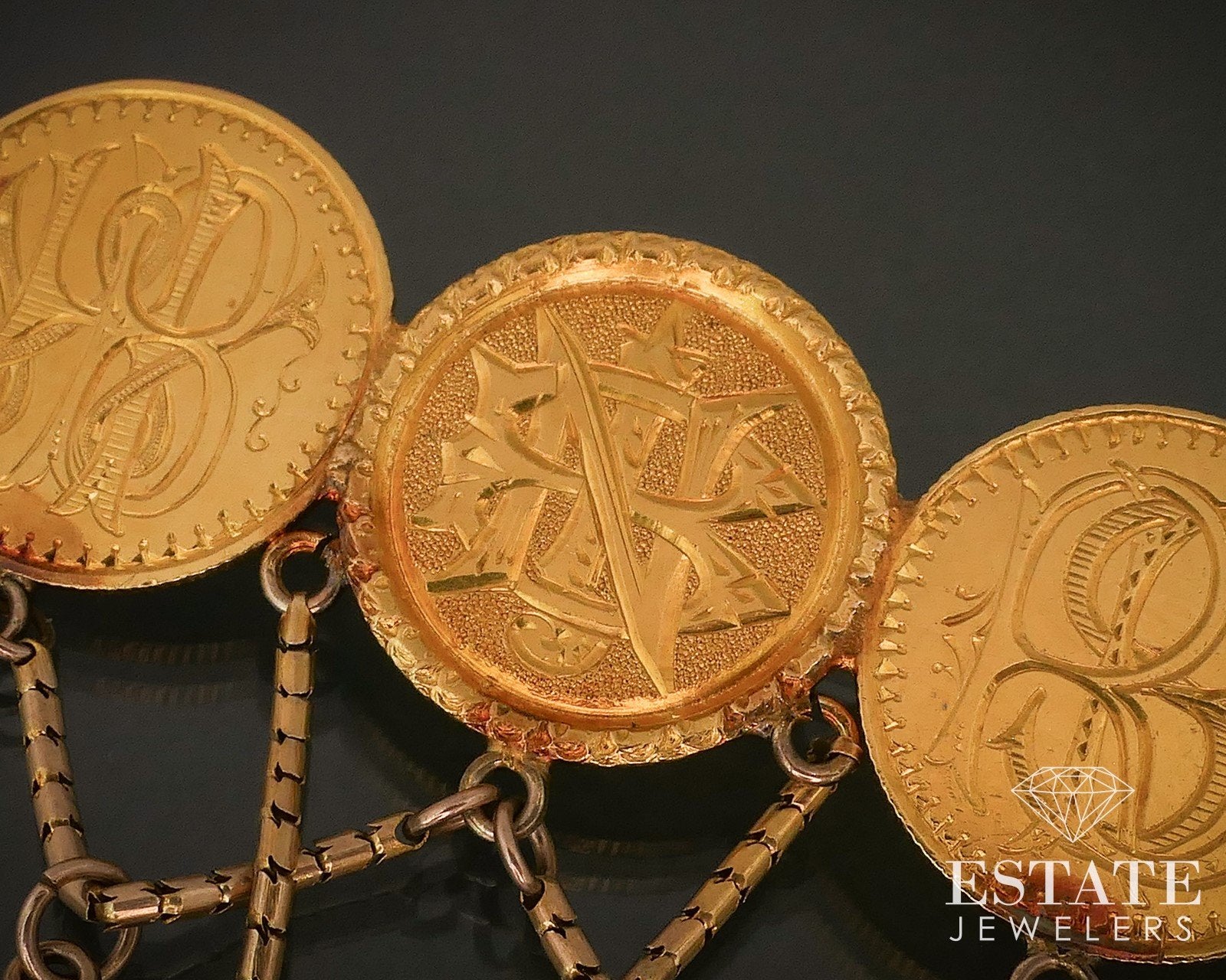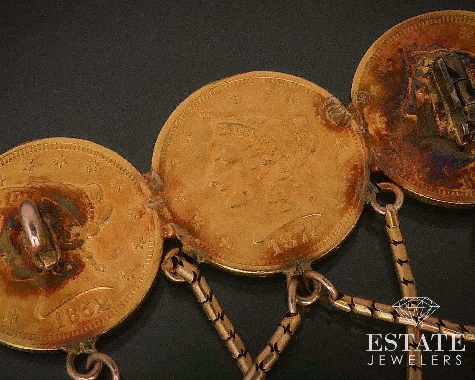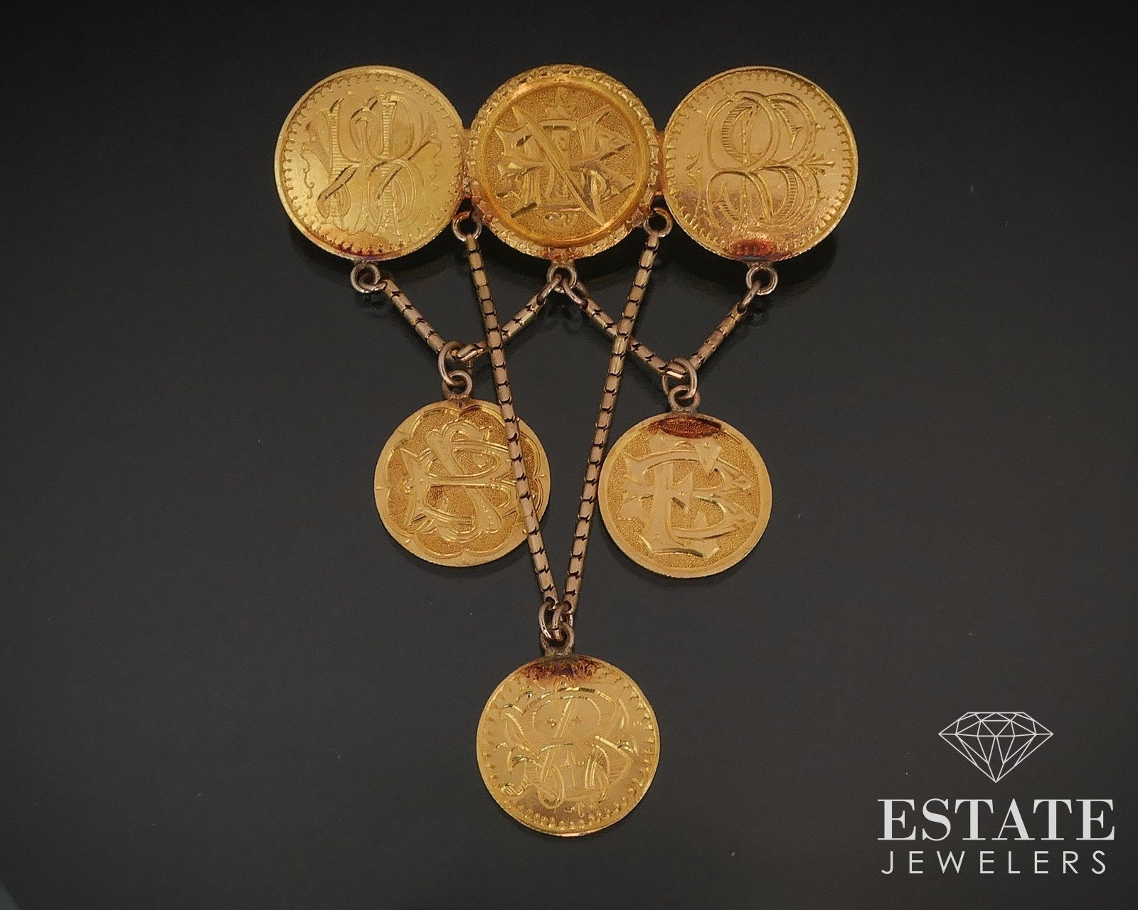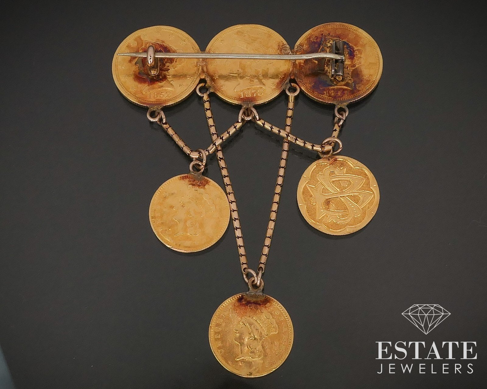 Stunning and one of a kind collectible pin brooch made of genuine 22k gold liberty gold coin love tokens. All hand engraved and chained together to a pin. Love tokens date back to medieval French trezians or coins that were carved specially for marriage. They were made popular again during the Civil War when soldiers would engraved coins to carry as dog tags or to send back home to their sweethearts. All made with the triple overlapping initials of someone's name. The main three Liberty head coins date to 1862, 1878, and 1853. Dates unknown for the dangling smaller coins on the bottom. Stunning pin! Measures 2-1/16" long by 2-5/8" tall. Tested 14k on the chain and 22k on all of the coins.