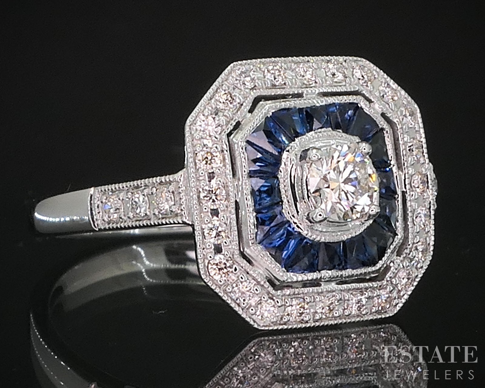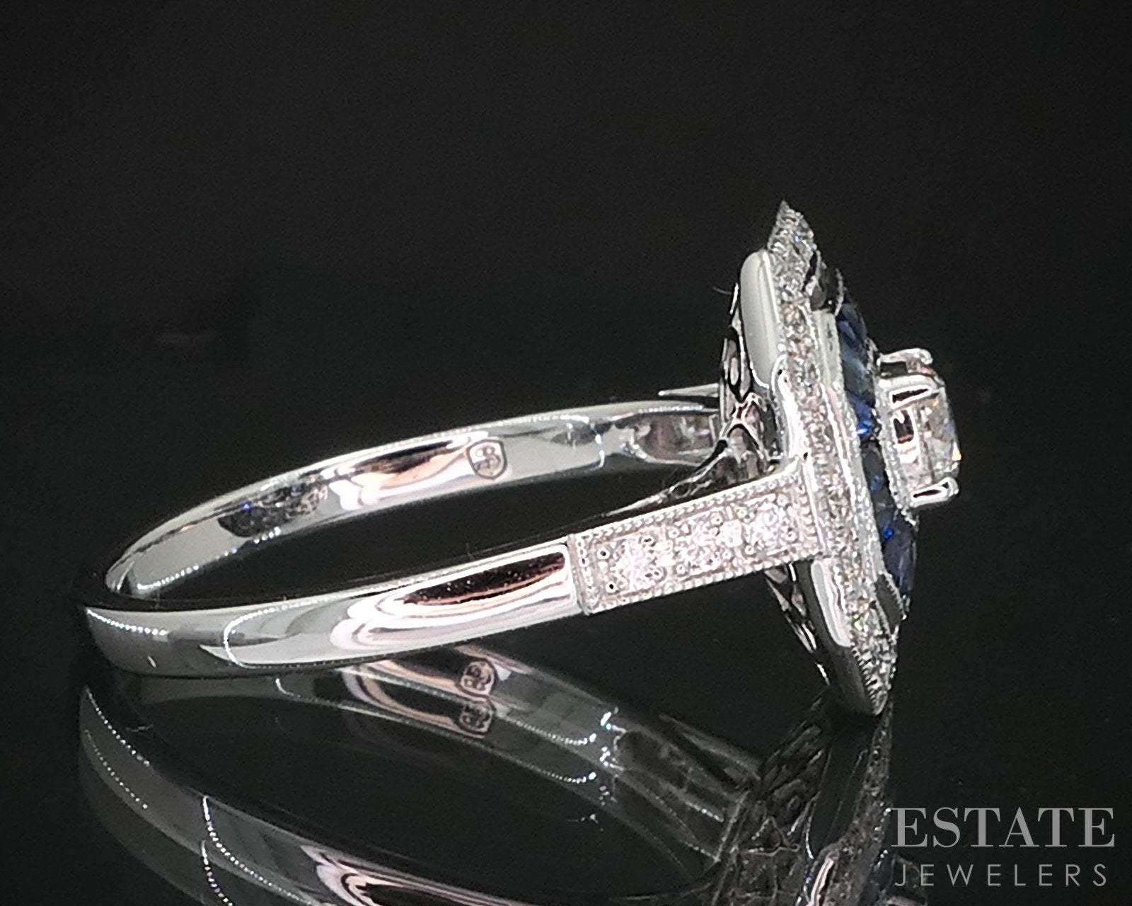Additional Info: Channeling the bold elegance of the Art Deco era, this striking Art Deco inspired ring is a celebration of symmetry, sophistication, and vintage glamour. Framing the sparkling center stone, geometric Blue Sapphire & Diamond accents are meticulously arranged in a design that echoes the architectural lines and ornamental detail characteristic of the 1920s. The crisp contrast of vivid Blue Sapphire and sparkling white Diamonds creates a timeless aesthetic that feels both regal and refined.