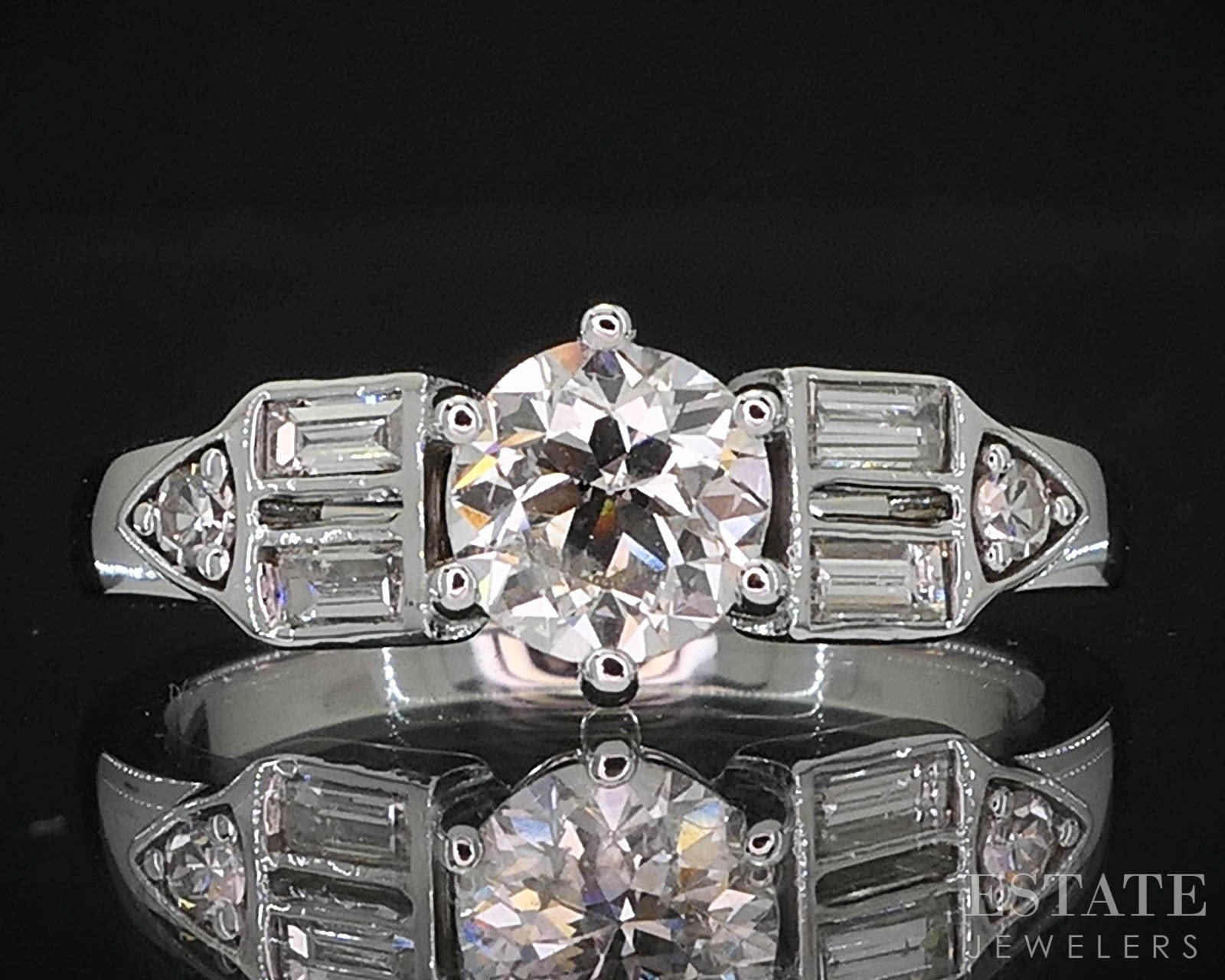 Additional Info: Step into the glamour of the 1920's with this exquisitely crafted Art Deco–inspired engagement ring. Made in house by our custom designer. This beauty is crafted in luminous 14k white gold, the ring features a captivating Old European cut center Diamond. Cherished for its soft brilliance, deep pavilion, and unmistakable vintage charm. The bold geometric lines recall the elegance and symmetry of the Art Deco period, while accent Diamonds along the shoulders add a refined sparkle. A perfect blend of timeless sophistication and architectural artistry, this ring is a celebration of enduring love and vintage allure.