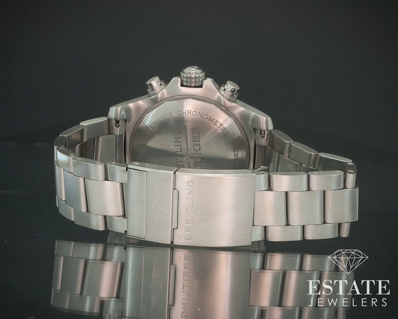 Handsome wristwatch from Breitling. High and brush polish bezel with a blue dial and black sub dials. Watch is in great condition and was just polished. Looks almost new!  Watch runs and all chronograph functions still work as intended. 45mm wide case. Full links to the bracelet and comes with original box and card.
