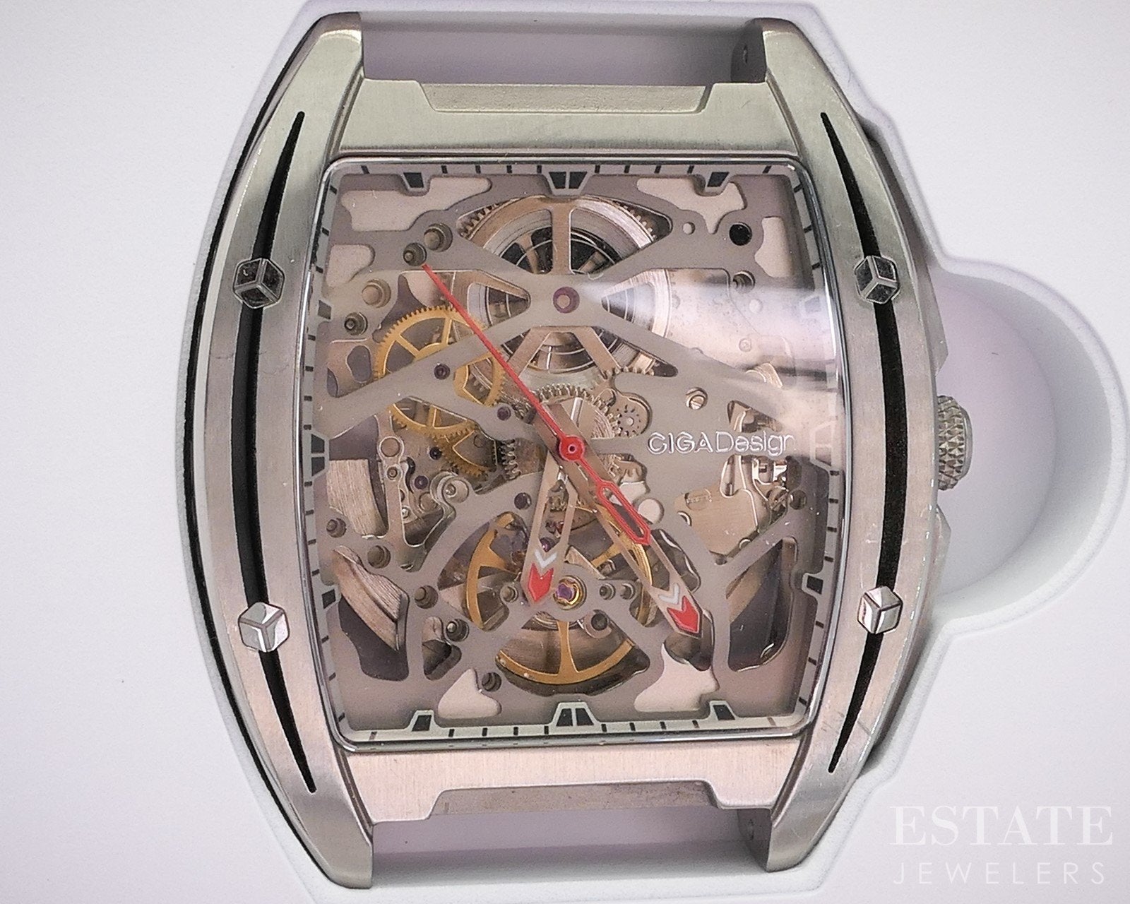 Additional Info: Handsome stainless skeleton dial watch from Ciga Design. Comes with two new straps and original box. Winds up and runs great!