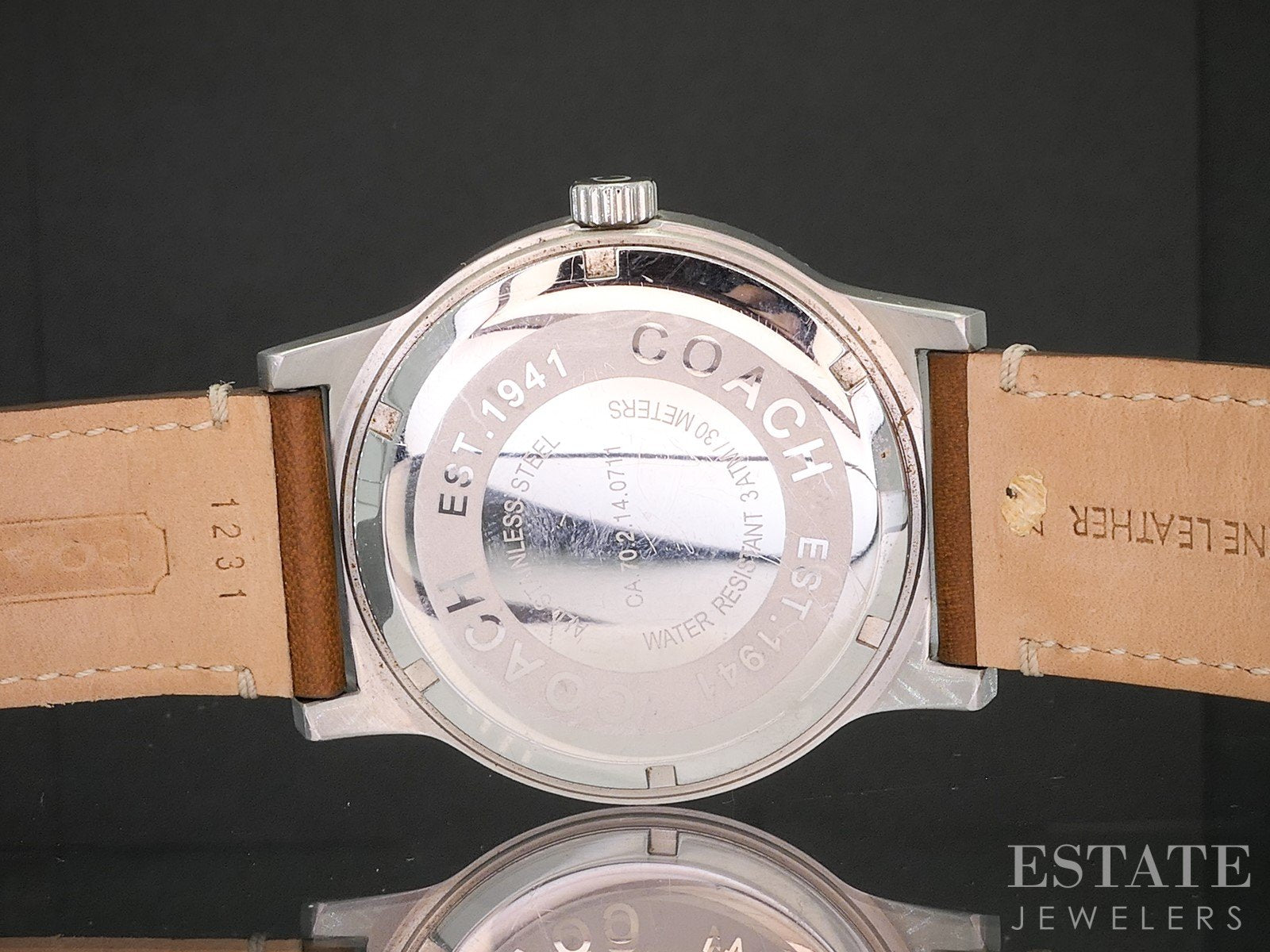 Additional Info: Stainless Coach mens watch with a black dial and brown leather strap. Watch has a new battery and runs.