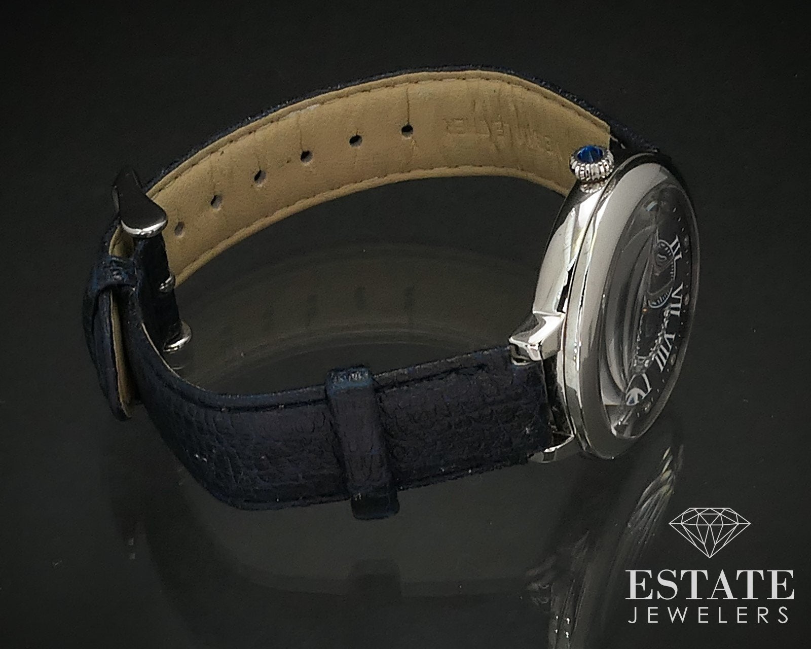 Beautiful ladies wristwatch with a blue guilloche diamond dial. Approximately .12ctw of diamonds. Watch is in great overall condition. Has a new battery and runs. 34mm wide case.