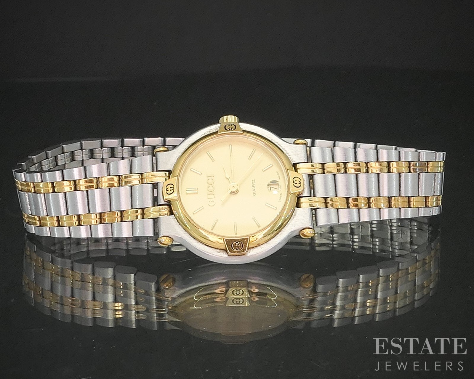 Gucci 9000L Two Tone Date Stainless Bracelet Ladies Watch p15057