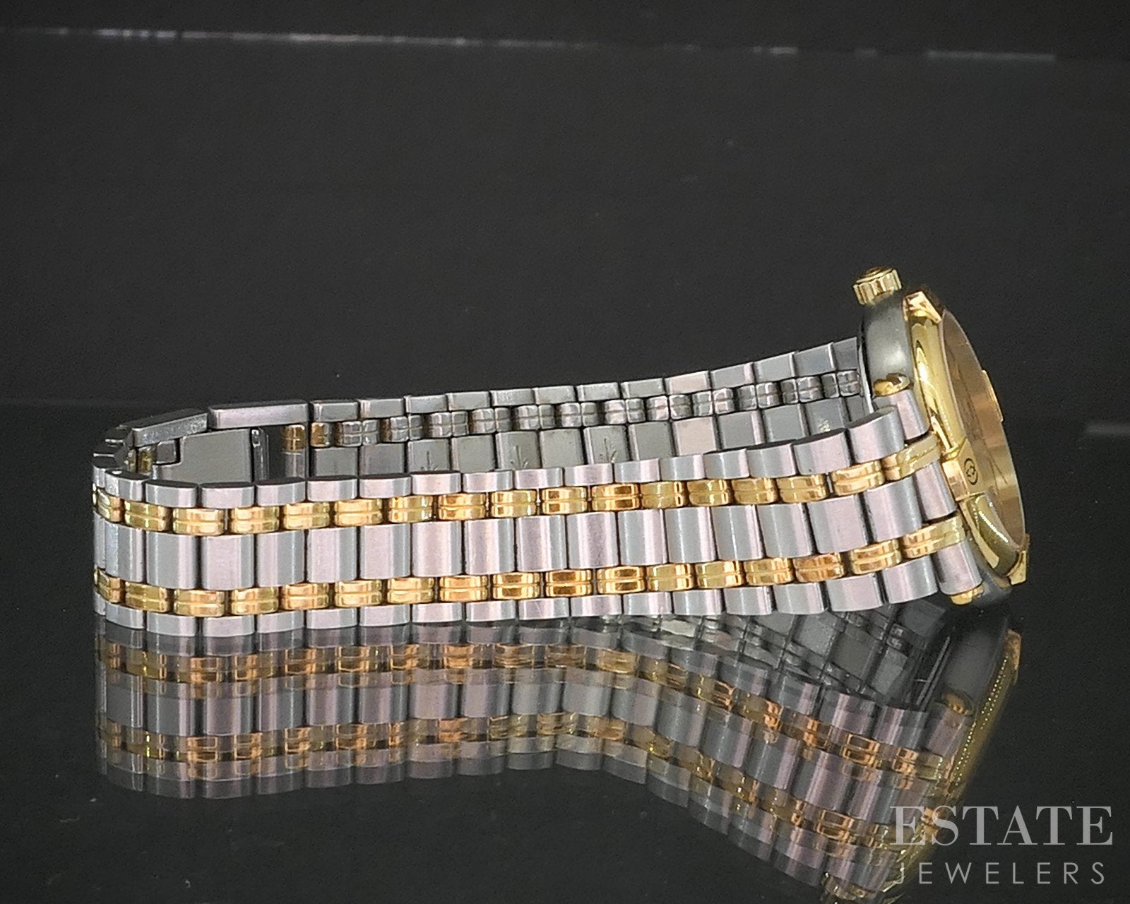 Additional Info: Stainless ladies watch from Gucci with two tone links and a gold bezel. Watch has a new battery and runs.
