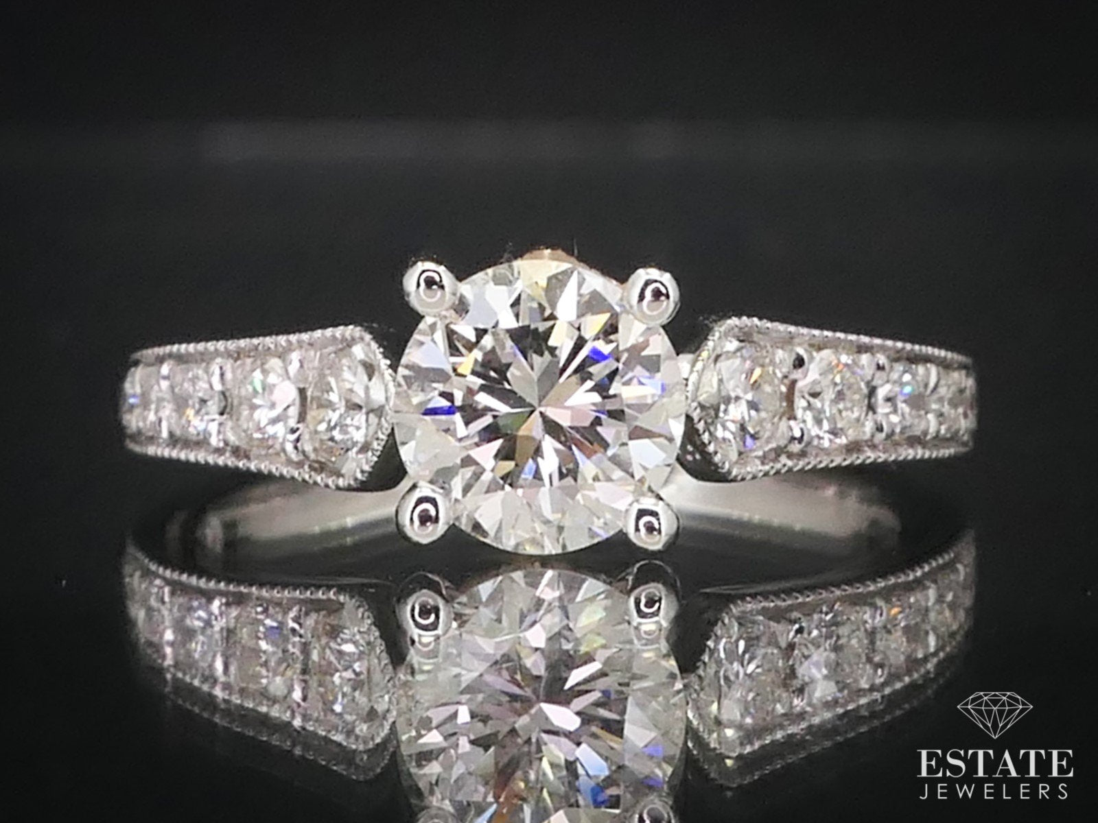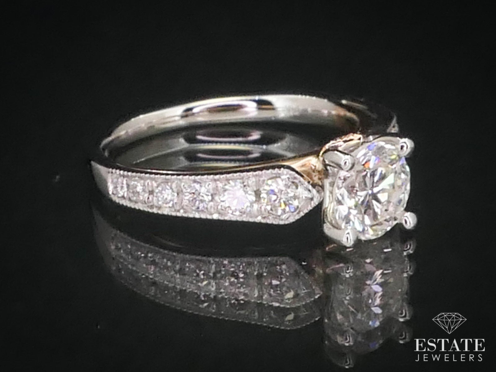 Sparkling white and rose gold ladies engagement ring with an approximate .98ct round cut GIA certified diamond. Approximately .33ctw of round cut accents. SI1 clarity with H color to main stone. Stunning amount of fire and sparkle to this stone! Stamped 14k 6.3mm stone. SIZE-6.5