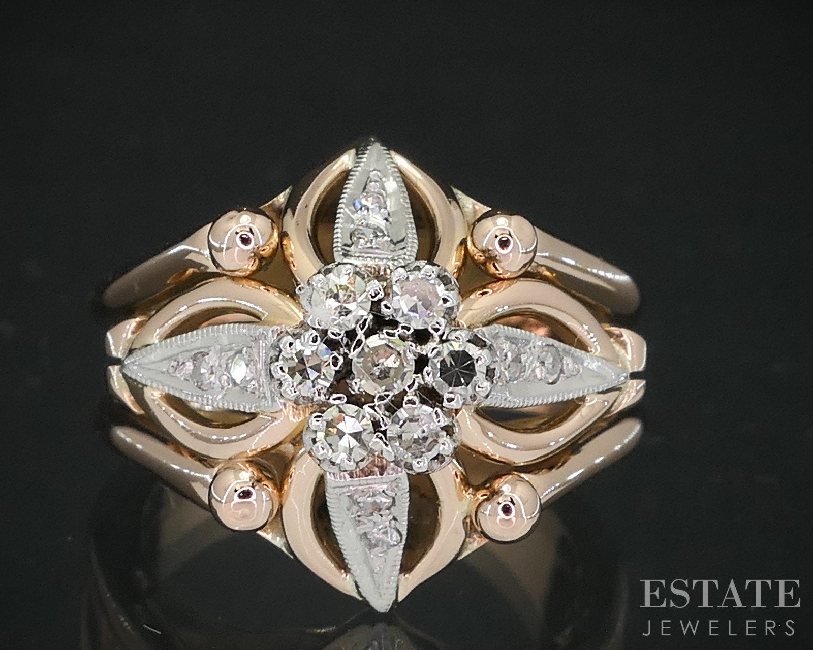 Additional Info: This exquisite retro-era ring showcases timeless elegance with a bold vintage flair. Crafted from rich 18k yellow, rose gold and accented with cool platinum, the piece features a dazzling cluster of single cut diamonds, meticulously arranged to create a striking floral or starburst effect. The mixed-metal setting enhances the brilliance of the diamonds while adding depth and contrast to the design. A true statement piece from the glamorous mid-20th century, this ring captures the sophistication and charm of a bygone era, perfect for collectors and vintage jewelry lovers alike. 17mm tall face.