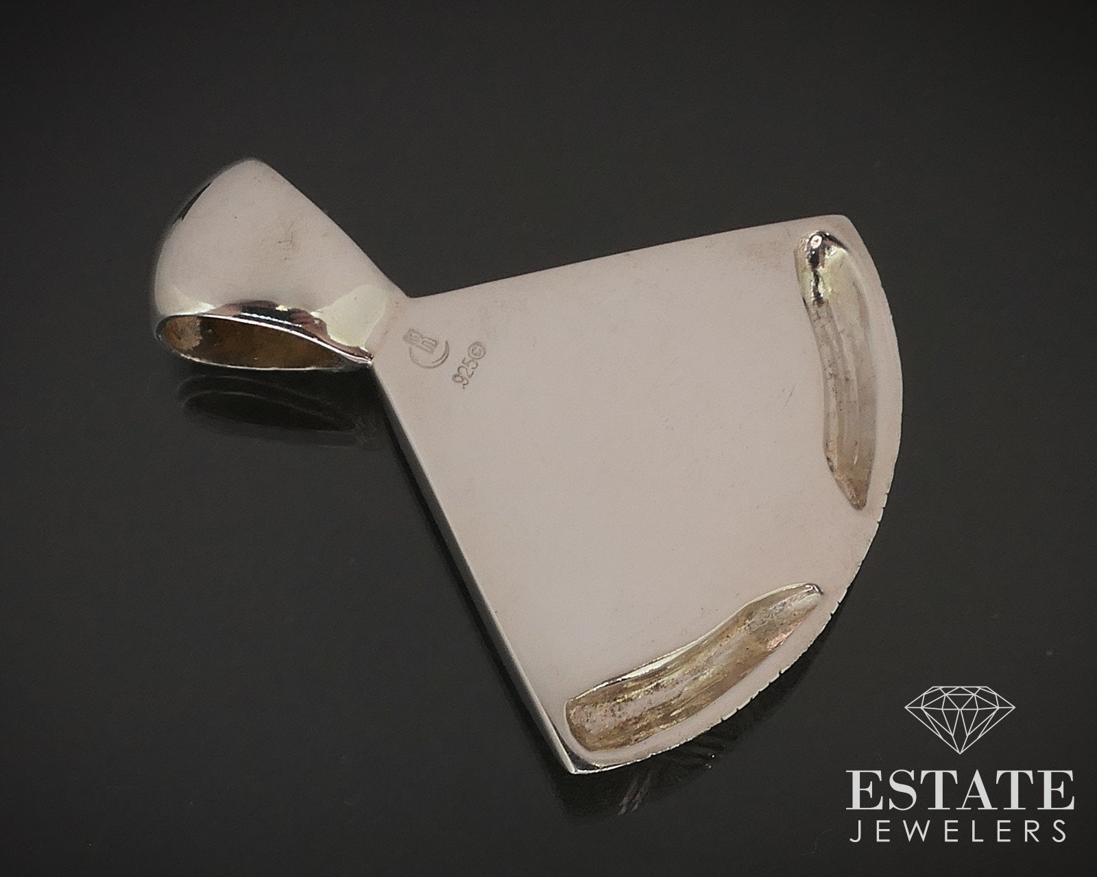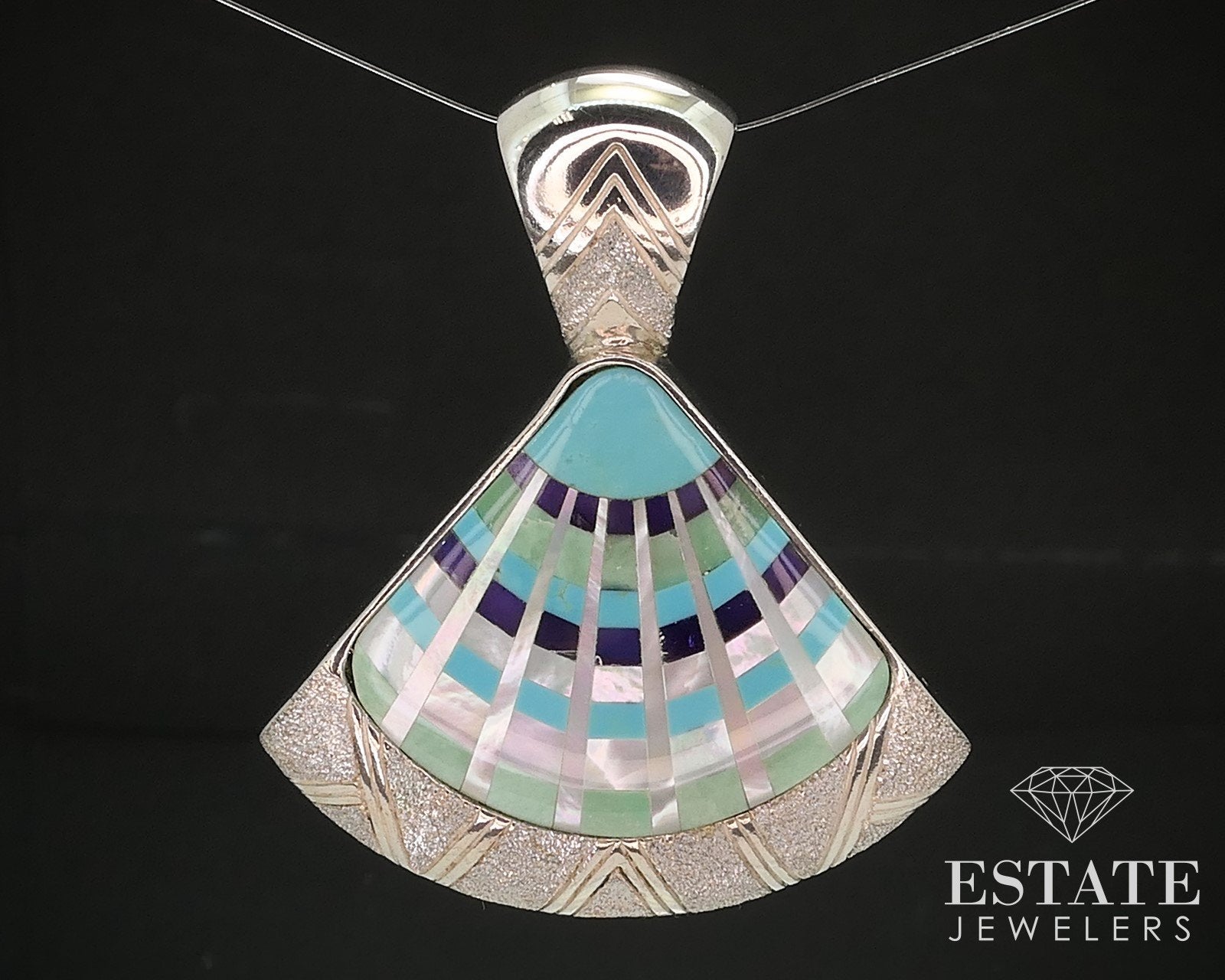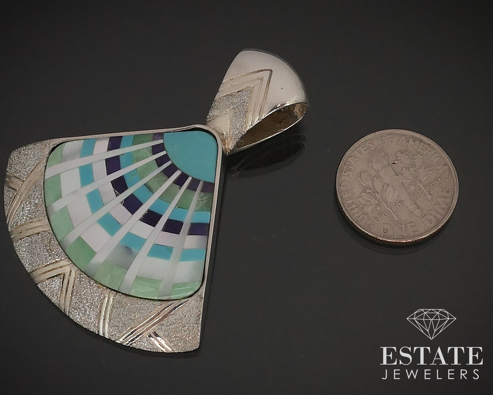 Unique Native American style Carolyn Pollack piece with inlaid natural mother of pearl, turquoise and sugalite gems. 1-7/8"L including bale. stamped 925