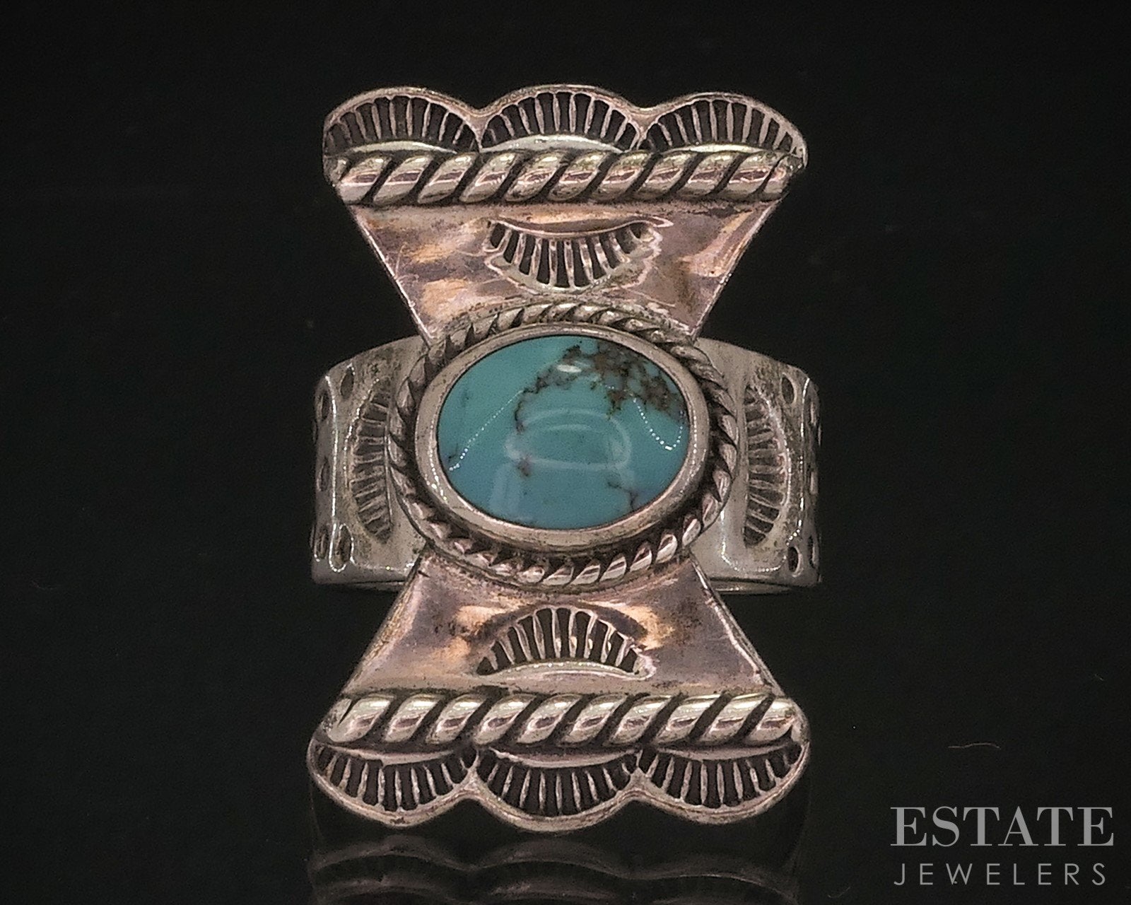 Detailed southwestern ring with a natural turquoise gem bezel set. 30mm tall face. stamped CP 925 SIZE-10