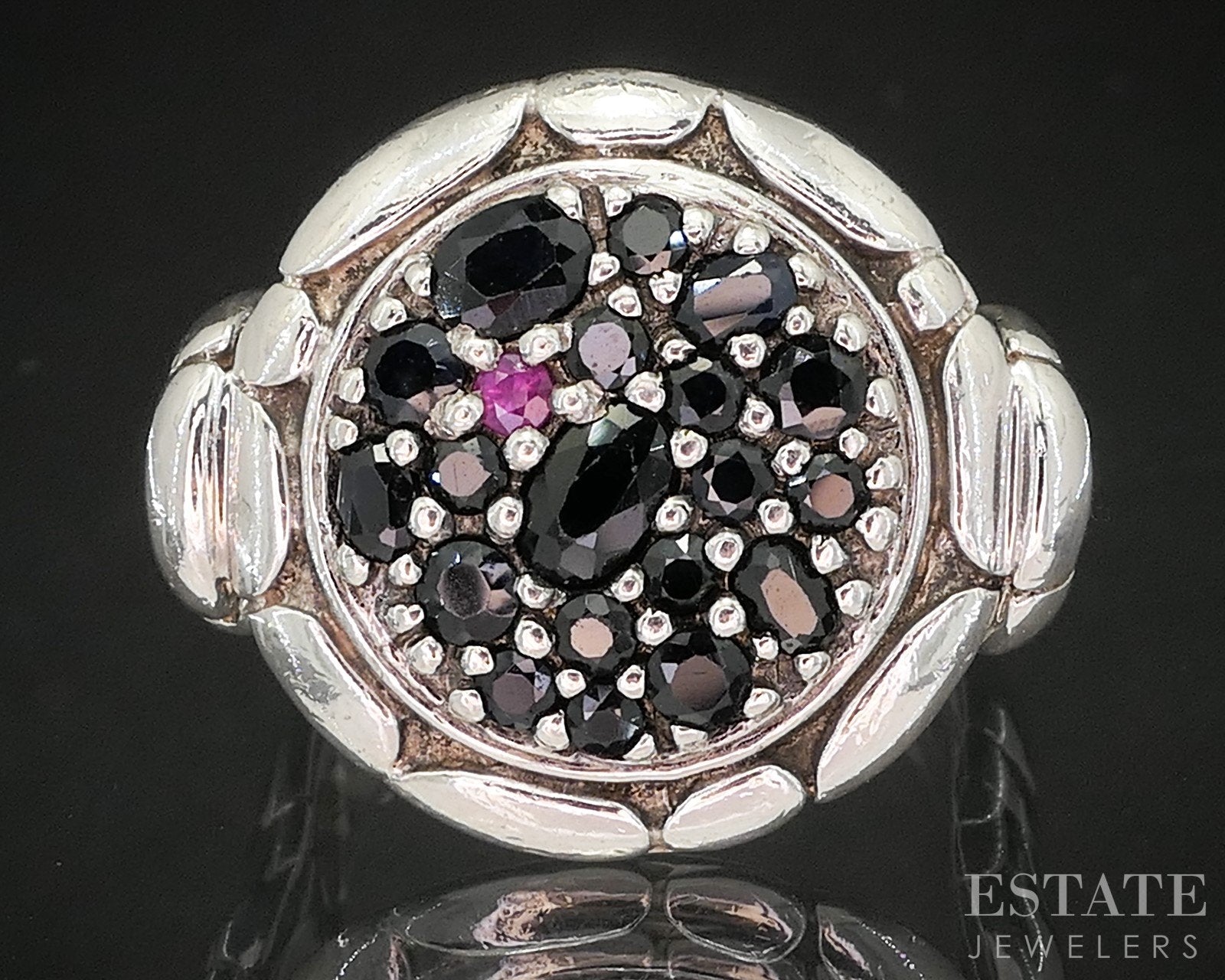 Additional Info: Genuine John Hardy ring from Kali Pebble line. Covered in the Lavafire Black Sapphires and one lab Ruby prong set all over the front. Original retail on the piece is $550!