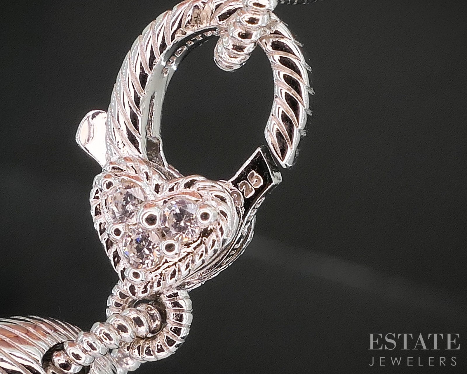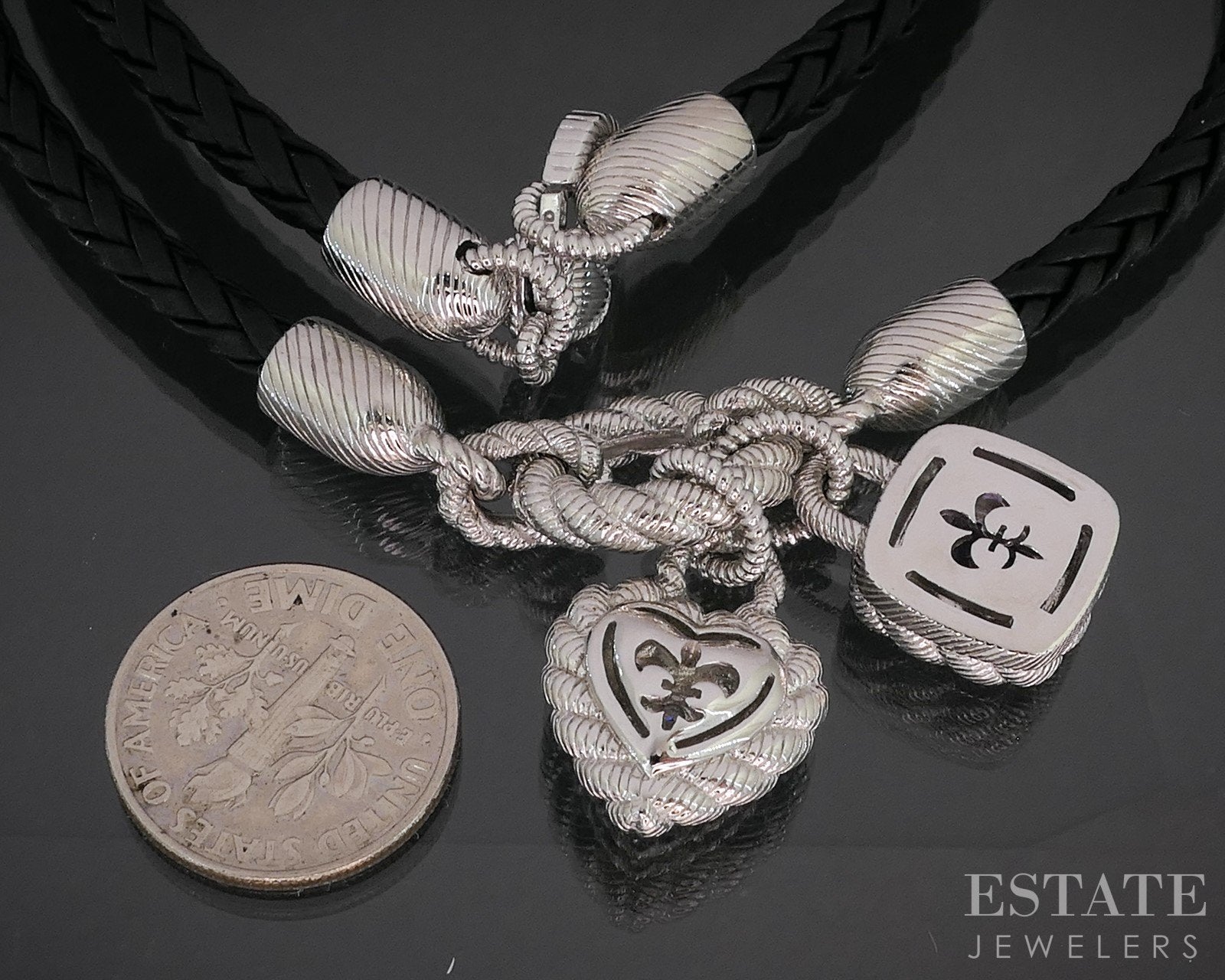 Additional Info: Lovely Judith Ripka necklace with braided leather and two dangling charms attached. Natural Amethyst gem and sparkling CZs on the heart..