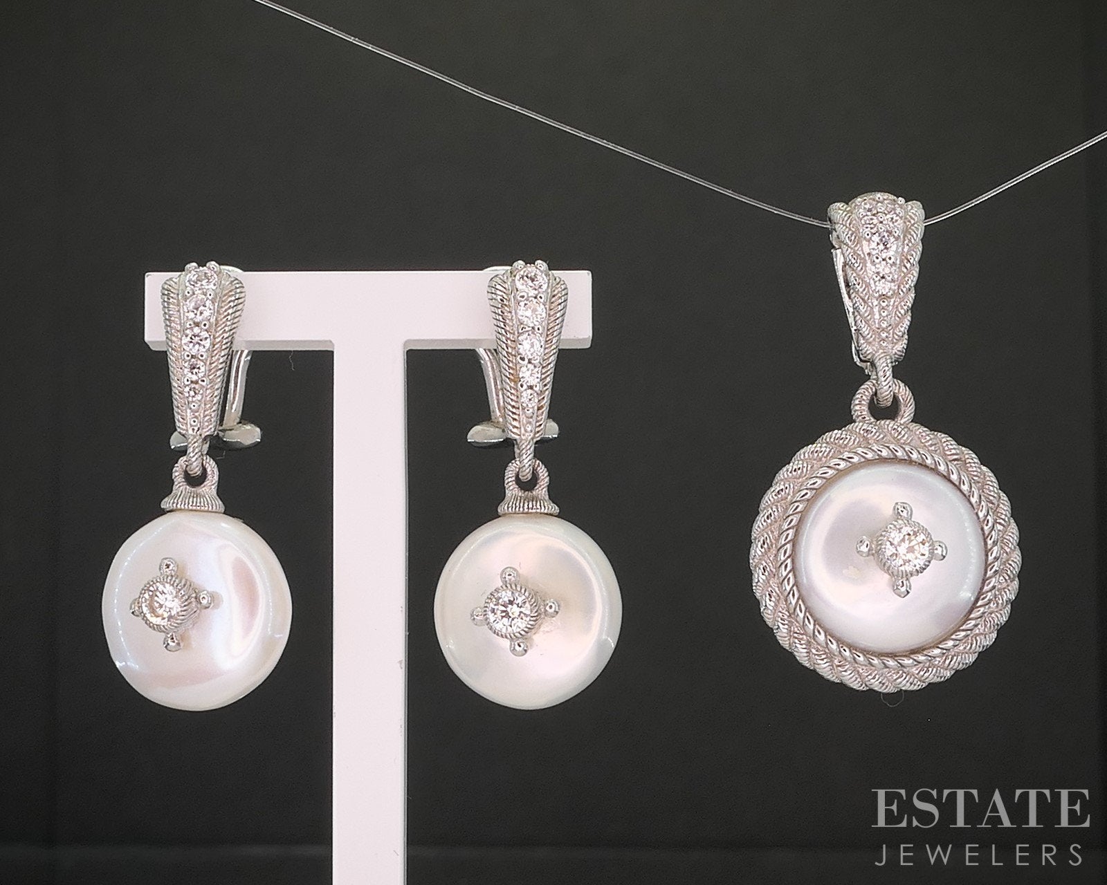 Additional Info: Lovely Judith Ripka matching pendant and earrings set with lustrous button Mabe Pearls and flashy CZ's accenting the middle. Look for the matching necklace set in our store!