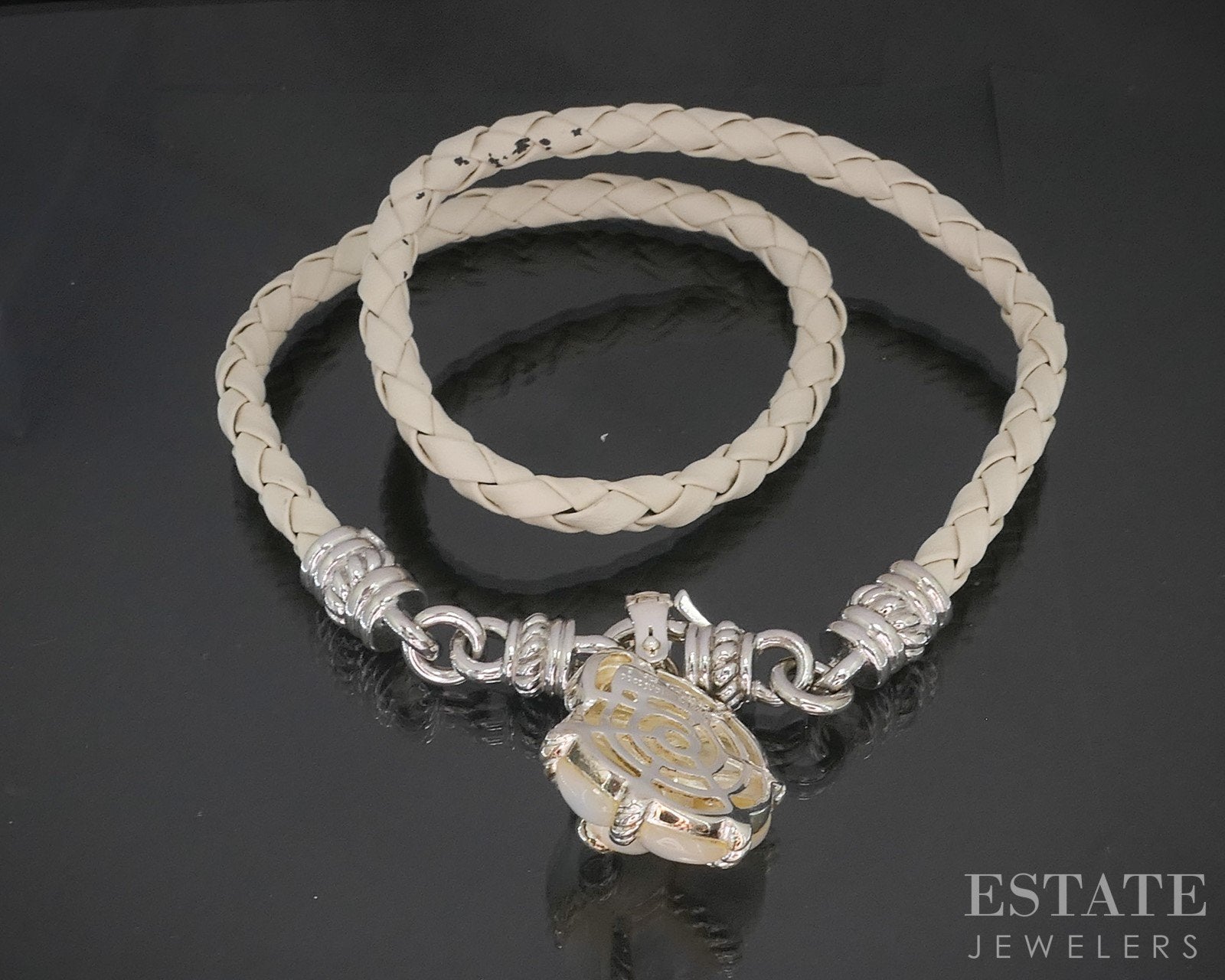 Additional Info: Lovely Judith Ripka necklace with braided leather and magnetic clasps attached to the pendant. Mother of Pearl bezel set on the seashell shaped pendant with a flashy CZ accent.