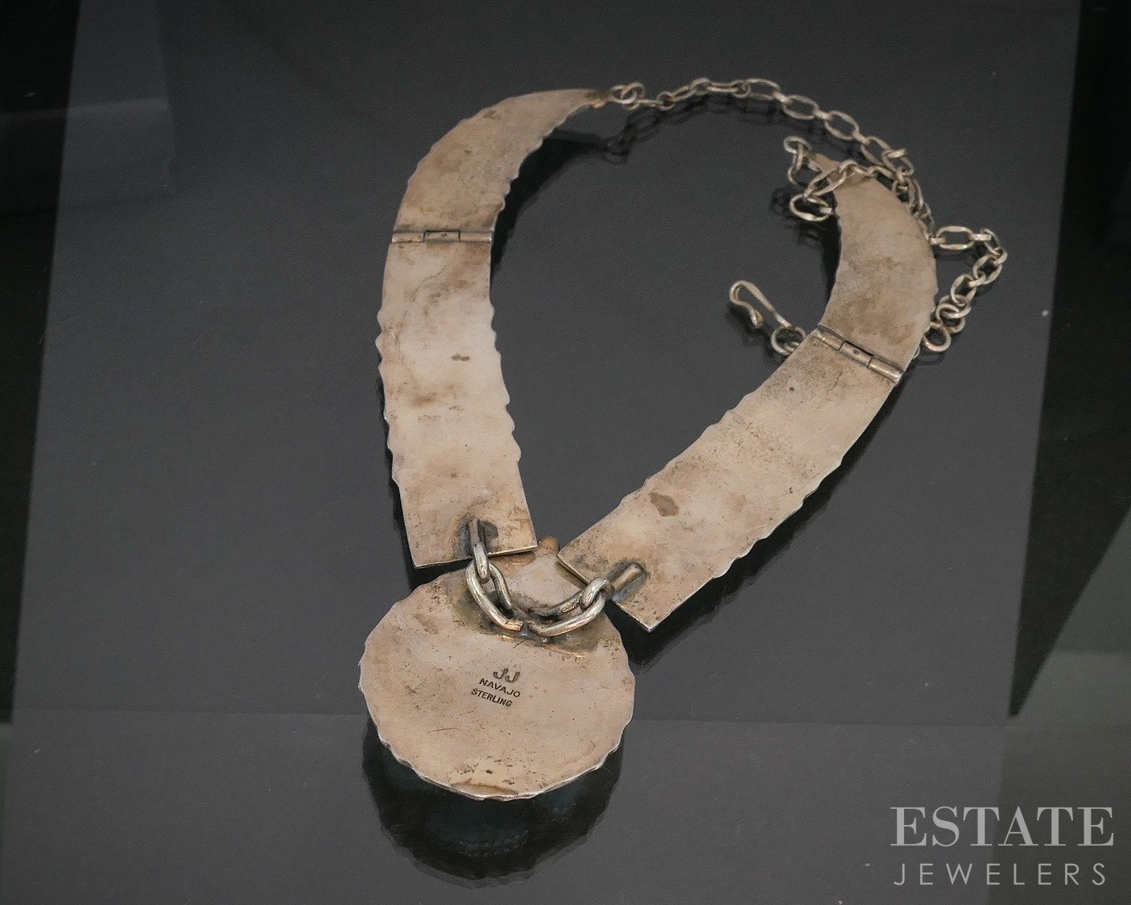 Additional Info: A classic symbol of Southwestern tradition, this natural Turquoise Navajo bib necklace is expertly crafted in sterling silver. Vibrant Turquoise stones, each showcasing unique natural color and matrix, are hand-set into traditional cluster motifs and a bold naja centerpiece. The sterling silver setting highlights the beauty of the stones while reflecting the skilled craftsmanship of Navajo silversmiths. Timeless and iconic, this necklace is a powerful statement piece that honors heritage, artistry, and the enduring beauty of natural Turquoise.
