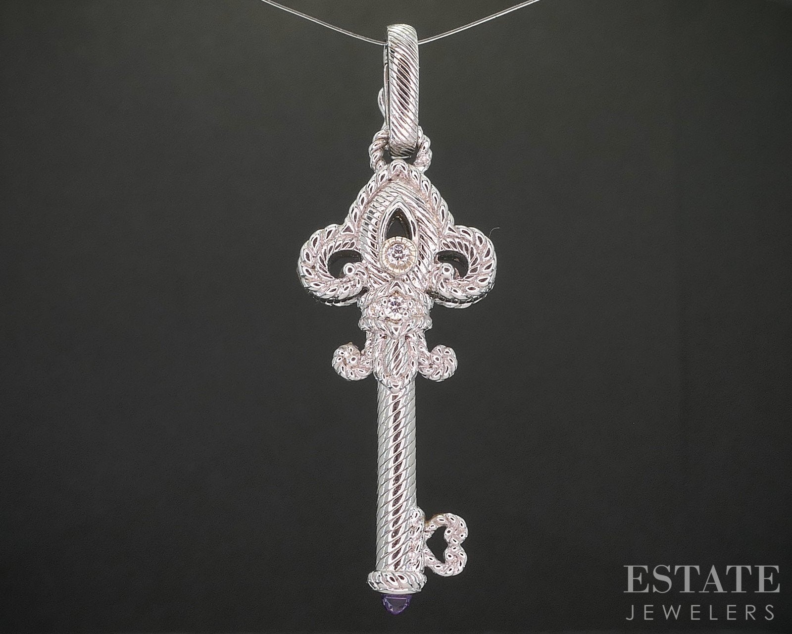 Additional Info: Unique Judith Ripka enhancer pendant with sparkling CZs all over top of the key with a Amethyst set on the tip.