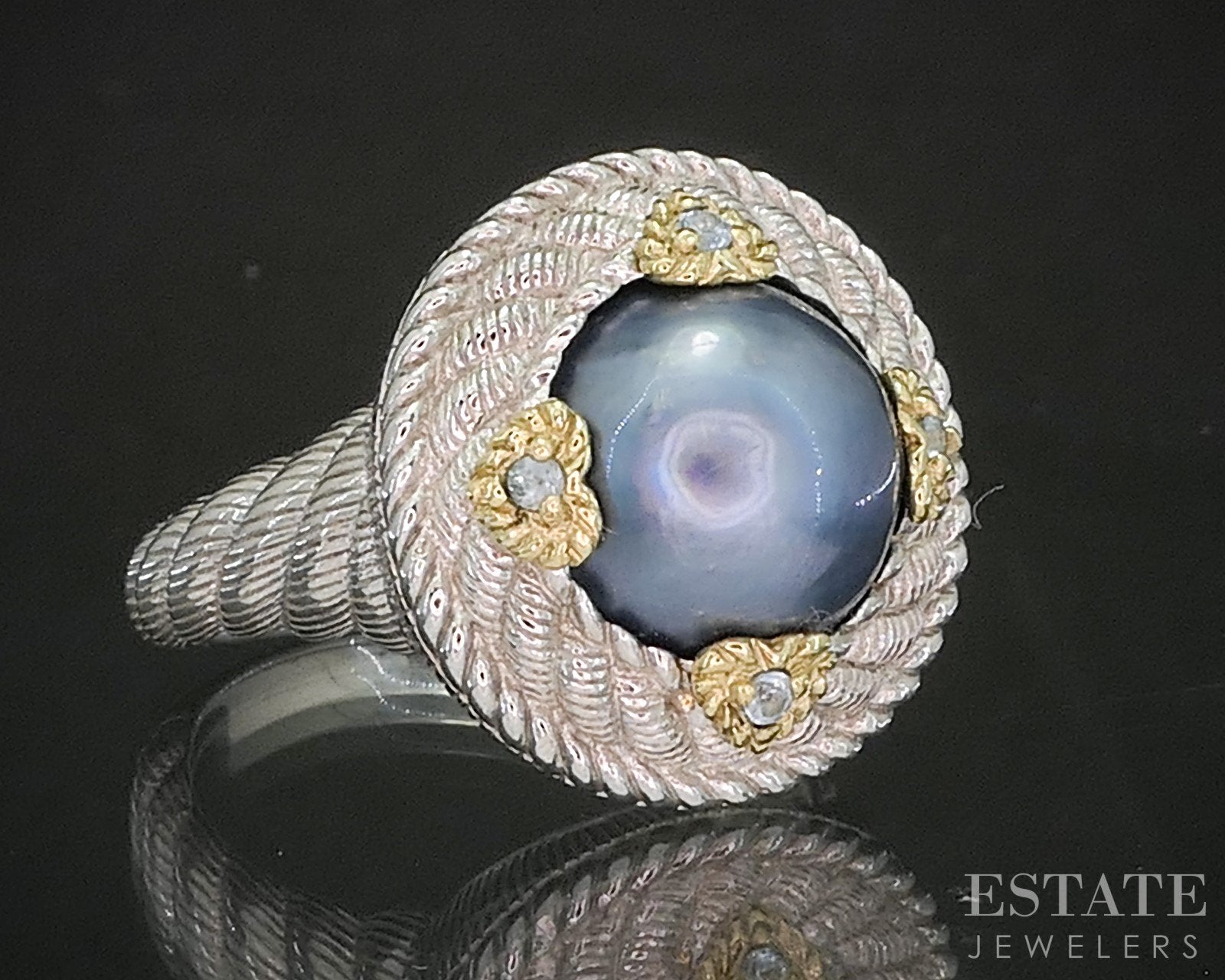 Additional Info: Lovely Judith Ripka statement ring with a black Mabe Pearl bezel set with small blue topaz accents!