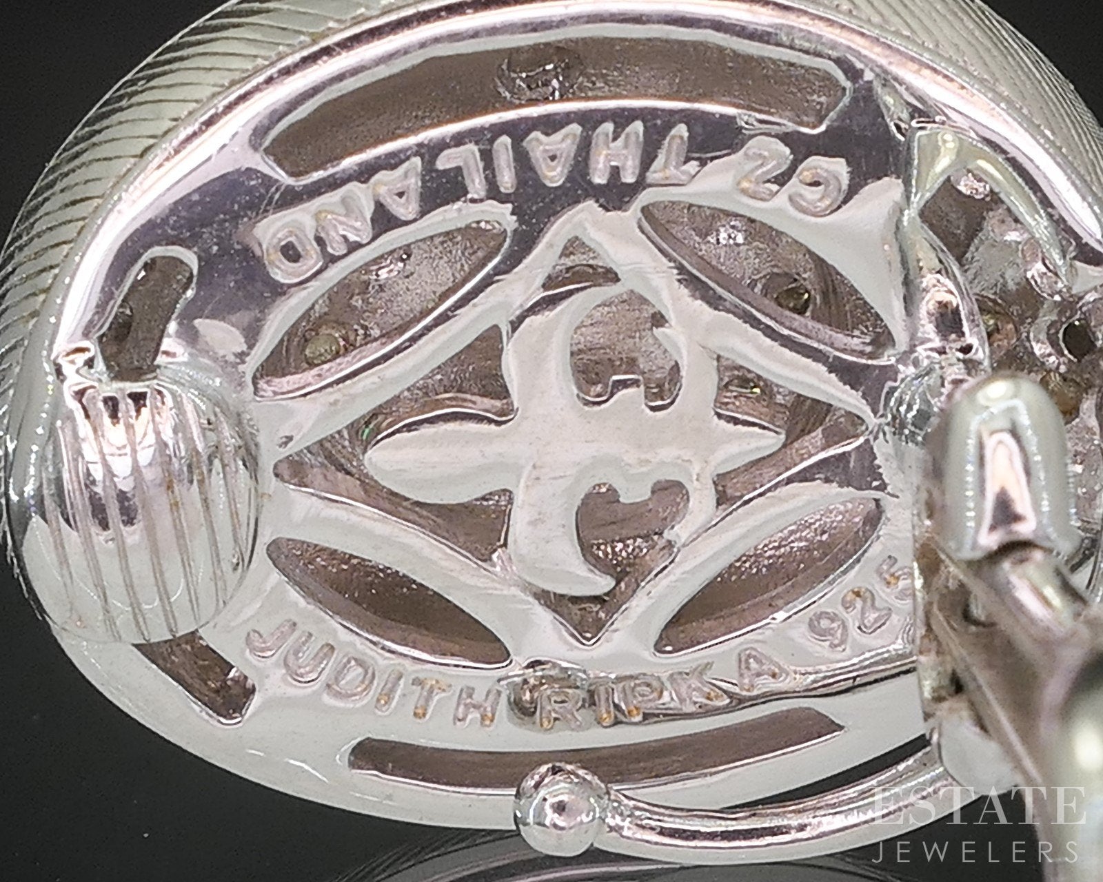 Additional Info: Unique Judith Ripka enhancer omega back earrings with blue enameling and CZs surrounding the faceted Quartz.