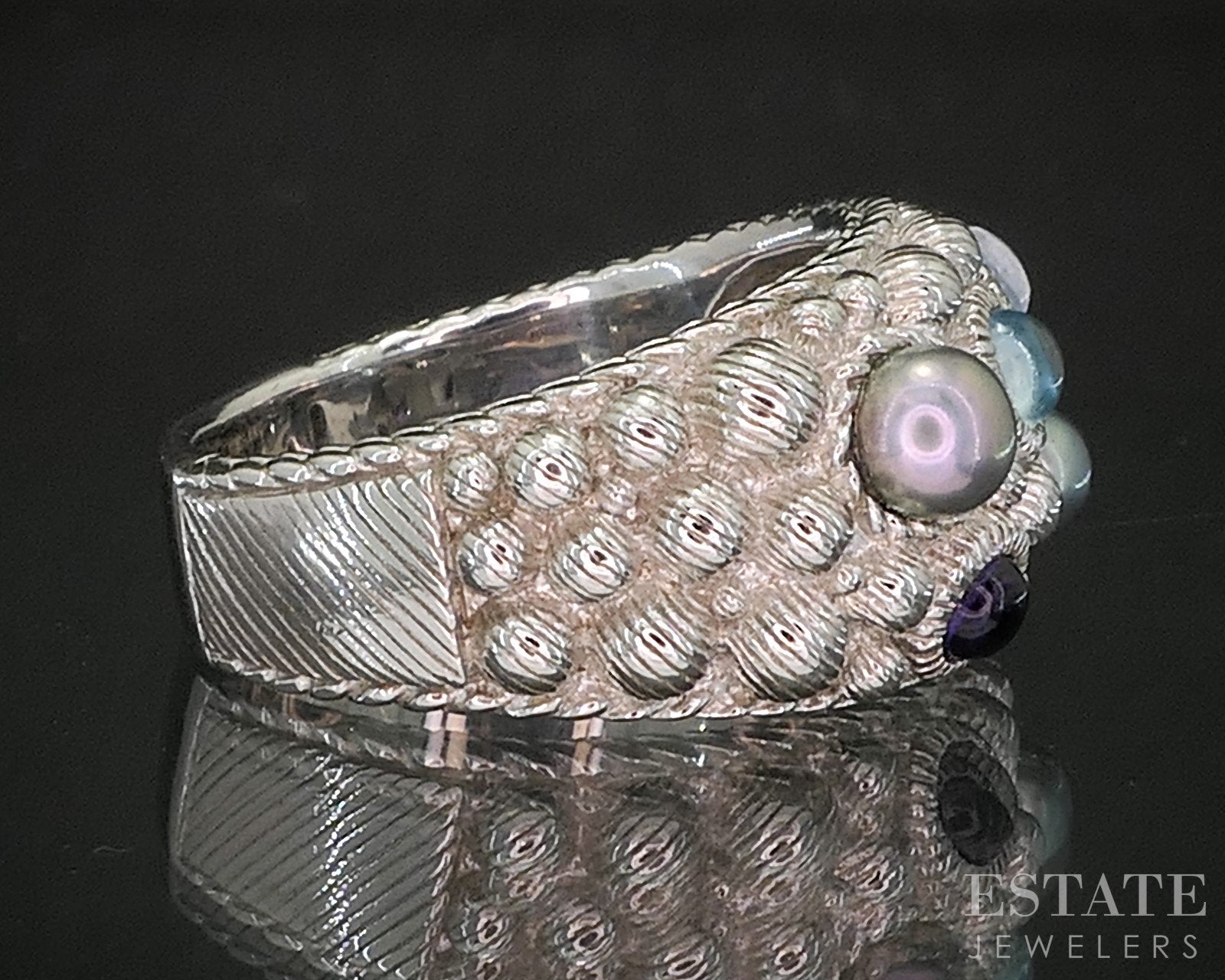 Additional Info: Unique Judith Ripka ladies band with vivid cabochon Aquamarine and Amethyst gems scattered between the colored Cultured Pearls.