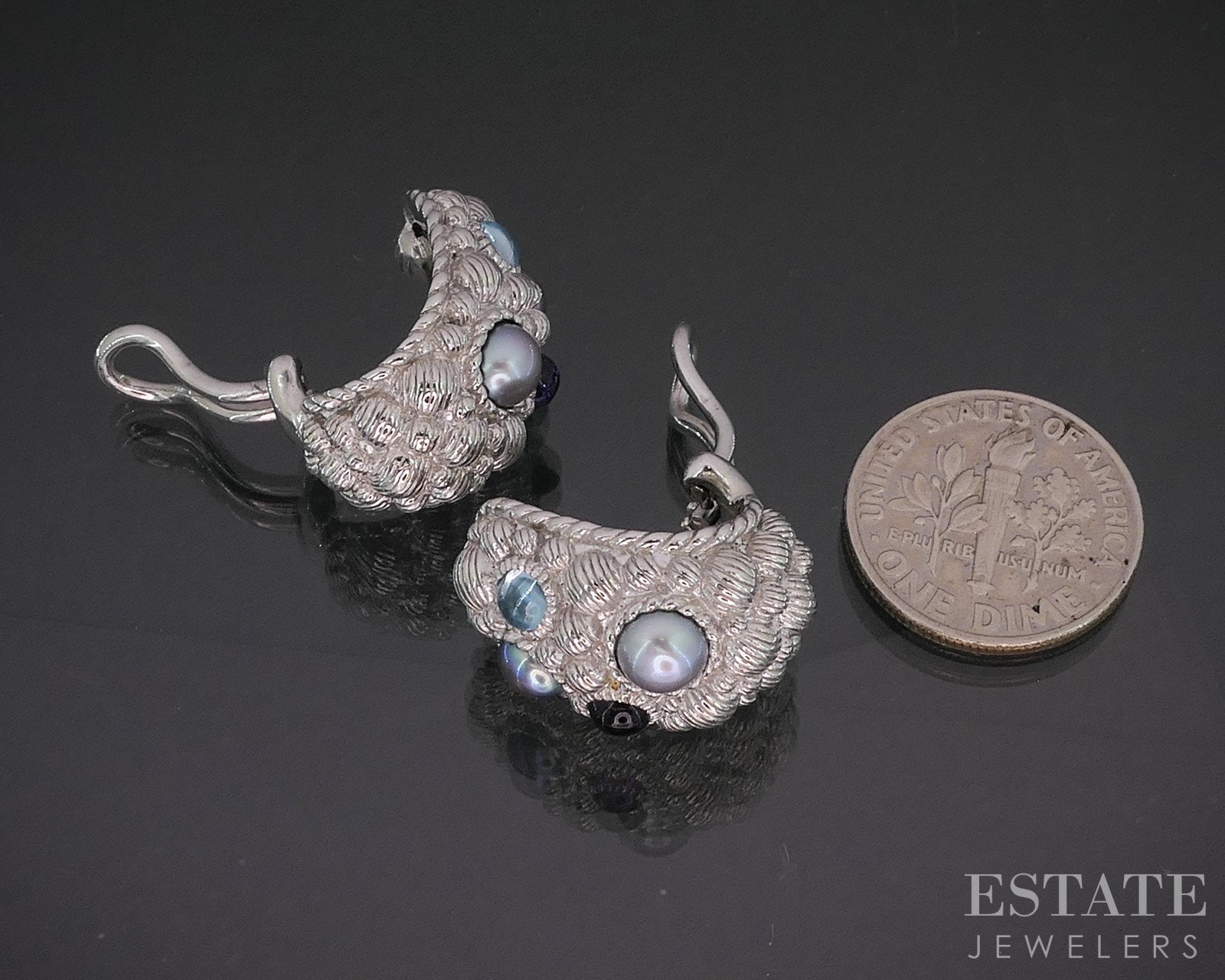 Additional Info: Unique Judith Ripka omega back j-hoop earrings with vivid cabochon Aquamarine and Amethyst gems scattered between the colored Cultured Pearls.