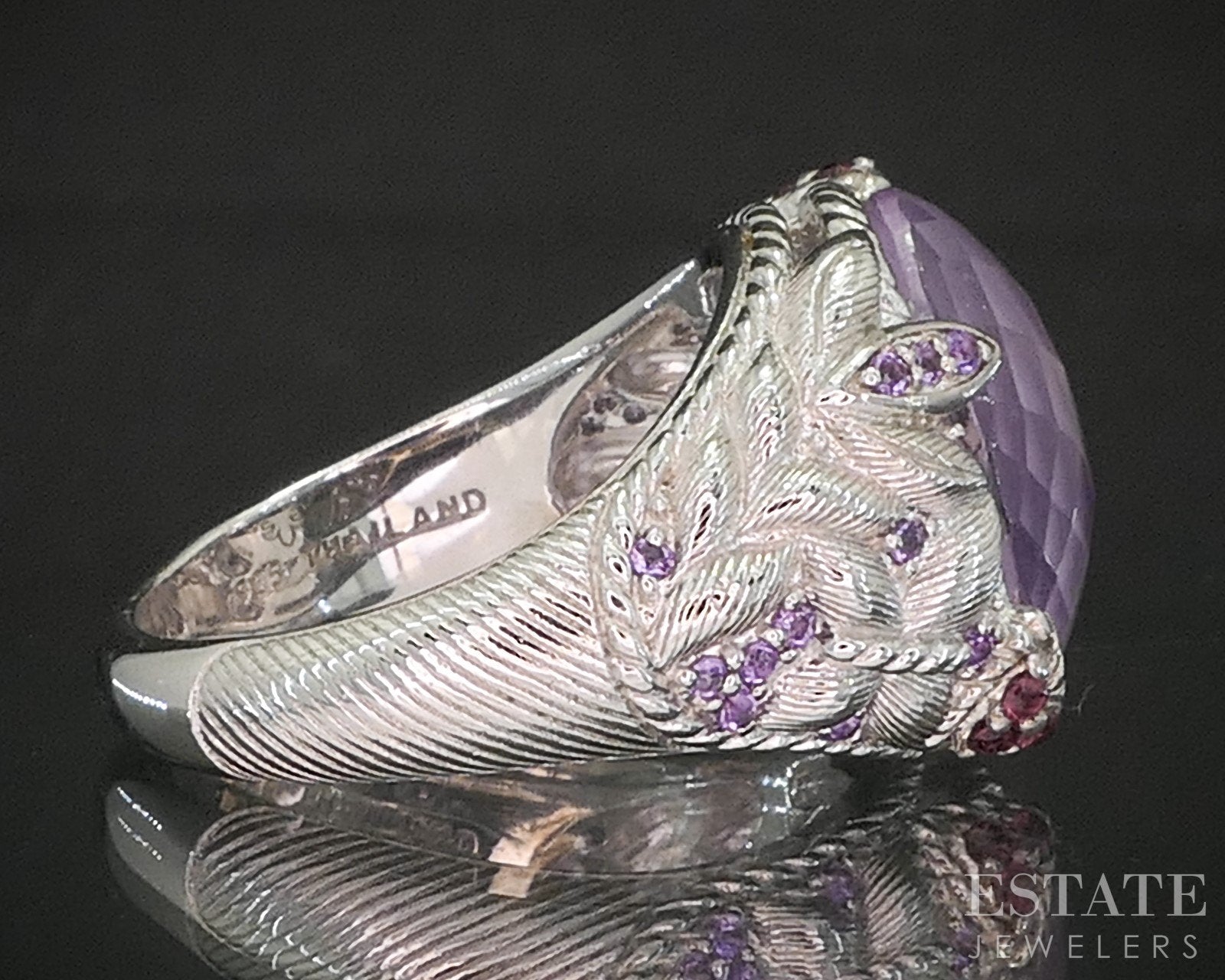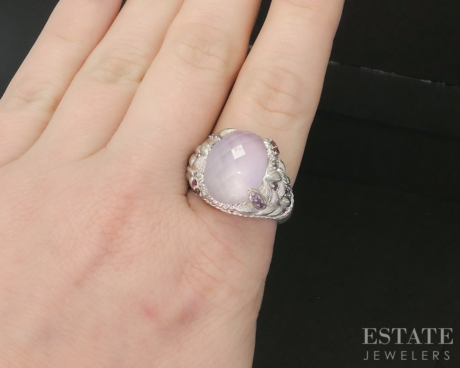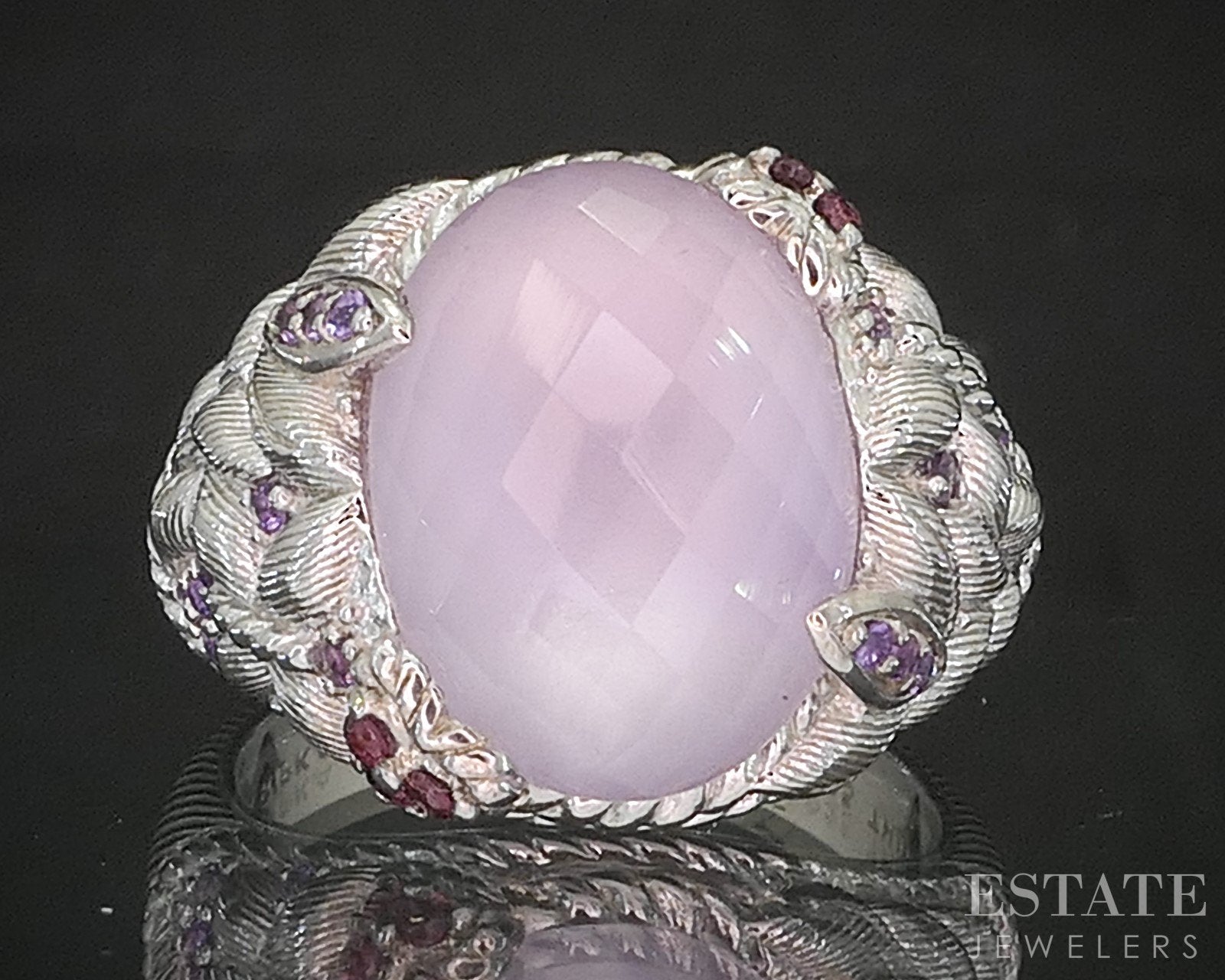 Additional Info: Unique Judith Ripka band with vivid Rhodolite Garnets and Amethyst gems surrounding the faceted Pink Quartz doublet set in the middle.