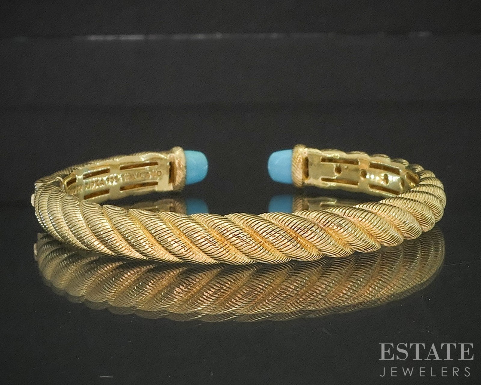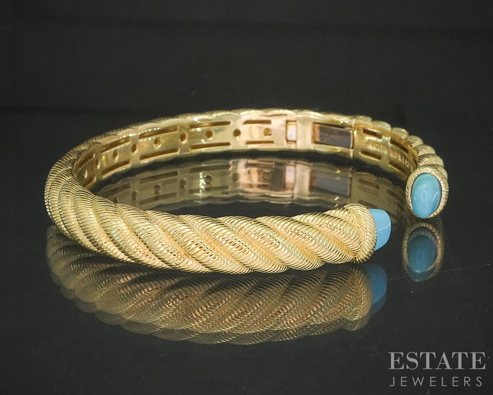Additional Info: Lovely gold over sterling hinged cuff from Judith Ripka with Turquoise gems on each end!
