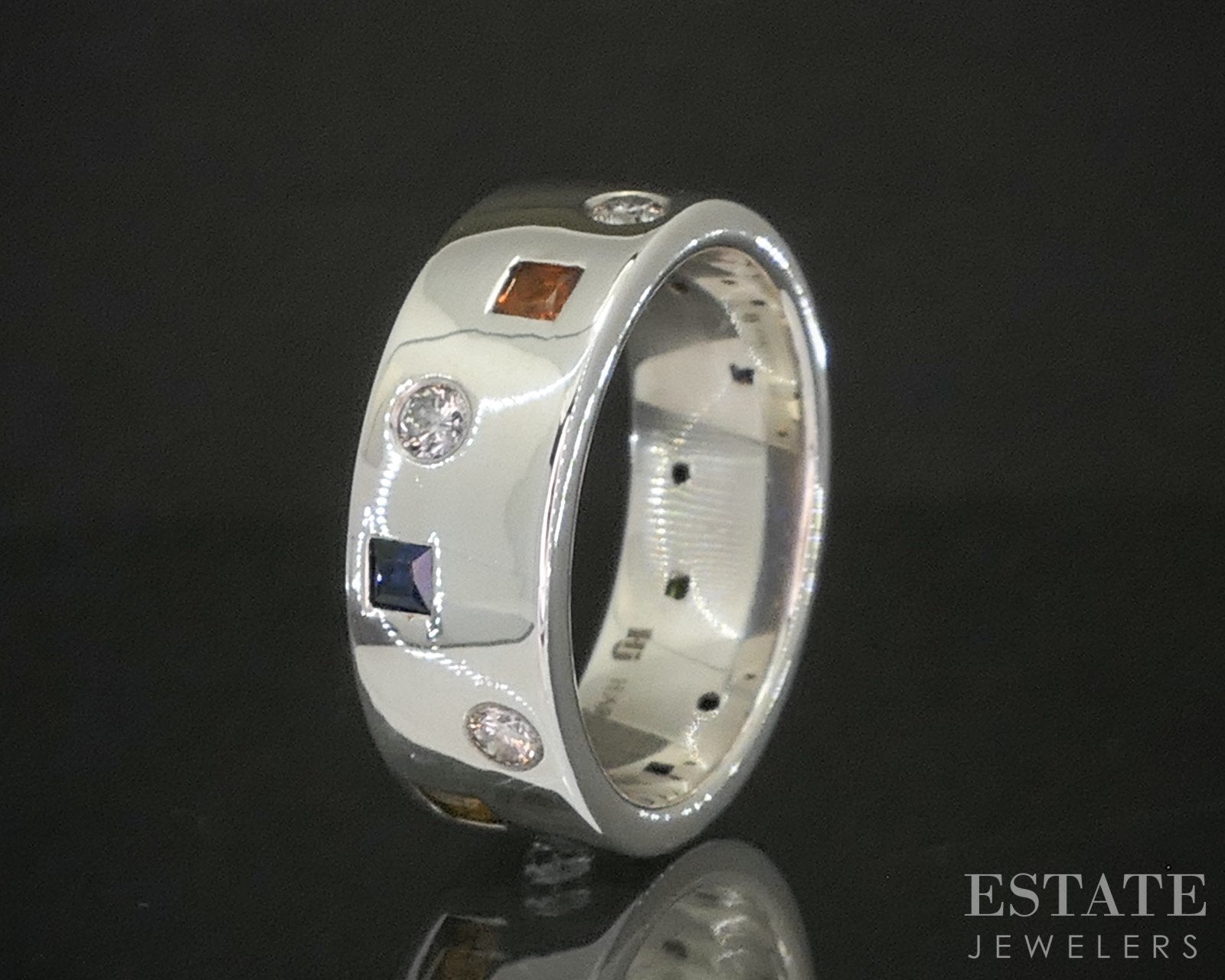 Additional Info: Lovely custom made band with flush set gemstones and sparkling Diamonds all around the face.