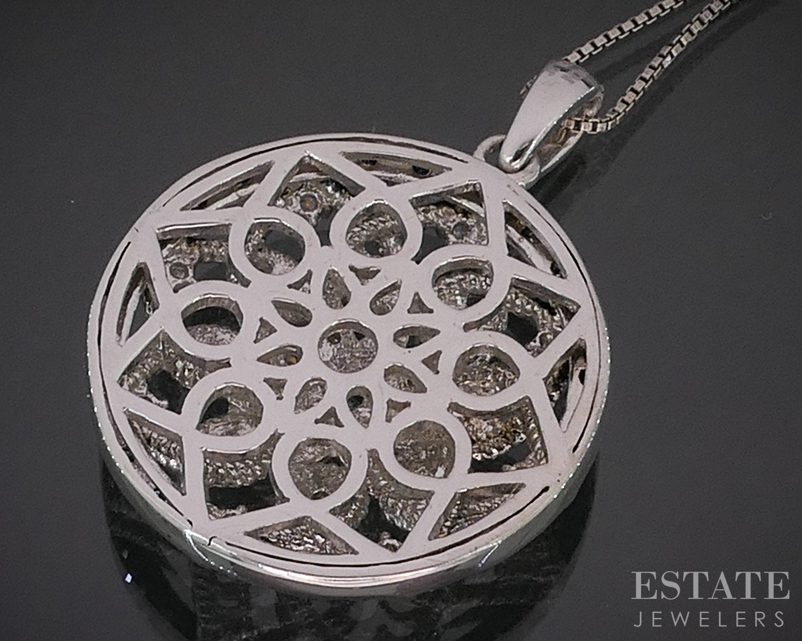 Additional Info: Lovely ladies circle shaped pendant with sparkling Diamonds all over the flower motif. Attached to a dainty box chain necklace.